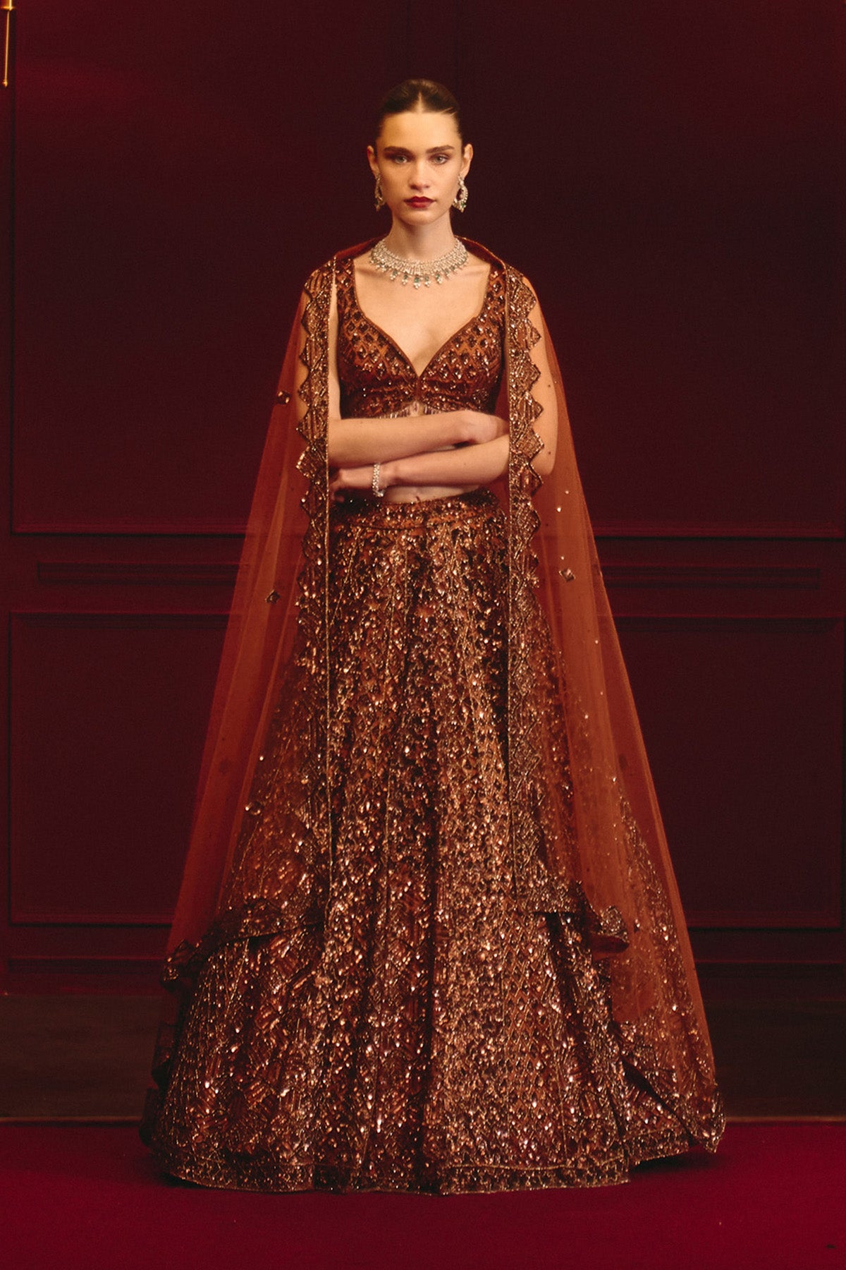 This Lehenga Set Features Detailed Embroidery In Warm Brown Tones On A Layered Net Base. The Blouse Is Paired With An Embroidered Dupatta Finished With Handcrafted Tassels.