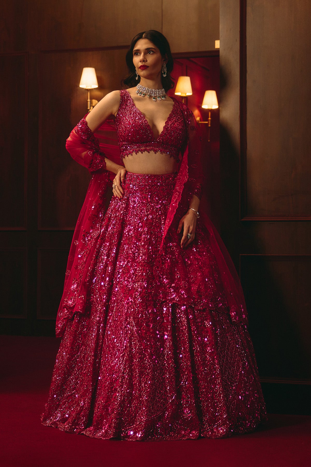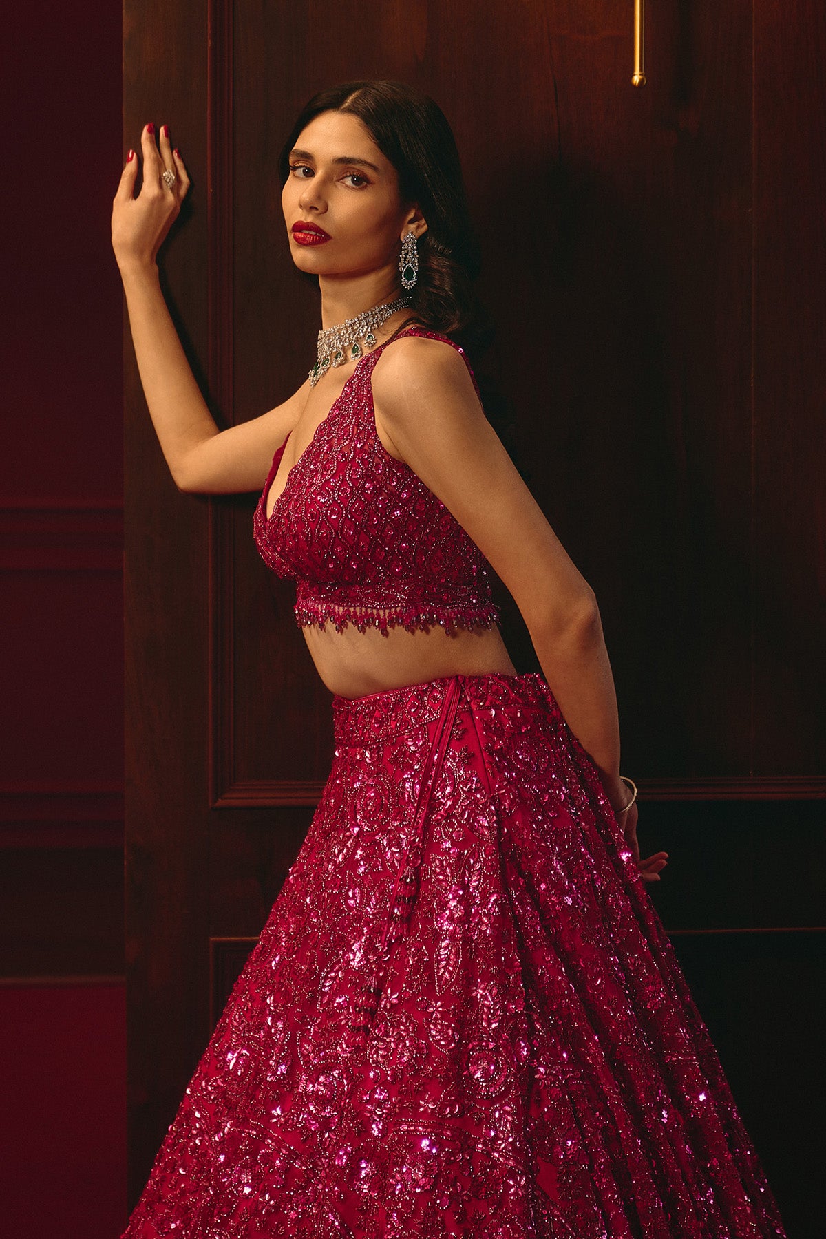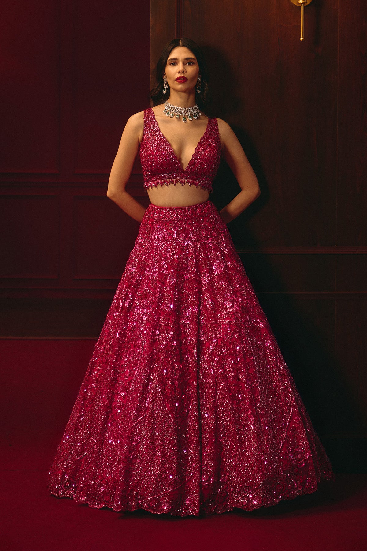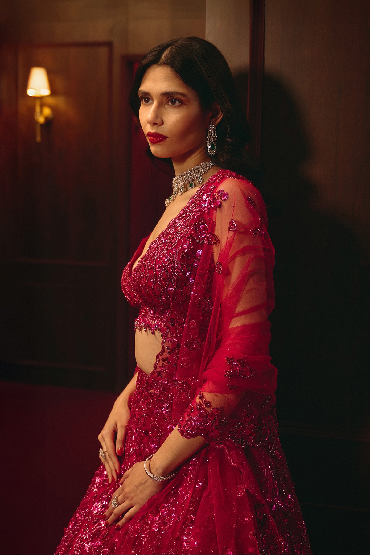 This Lehenga Set Features Intricate Embroidery In Deep Rose Tones On A Soft Net Base. It Is Paired With A Coordinated Blouse And An Embroidered Net Dupatta Finished With Tassel Detailing.