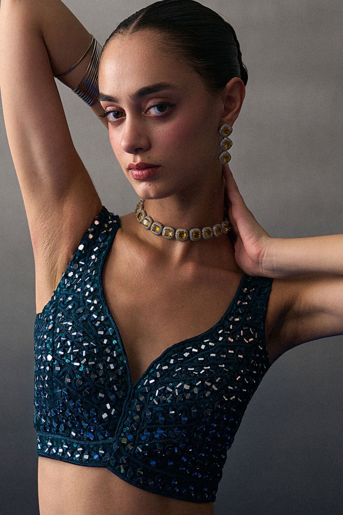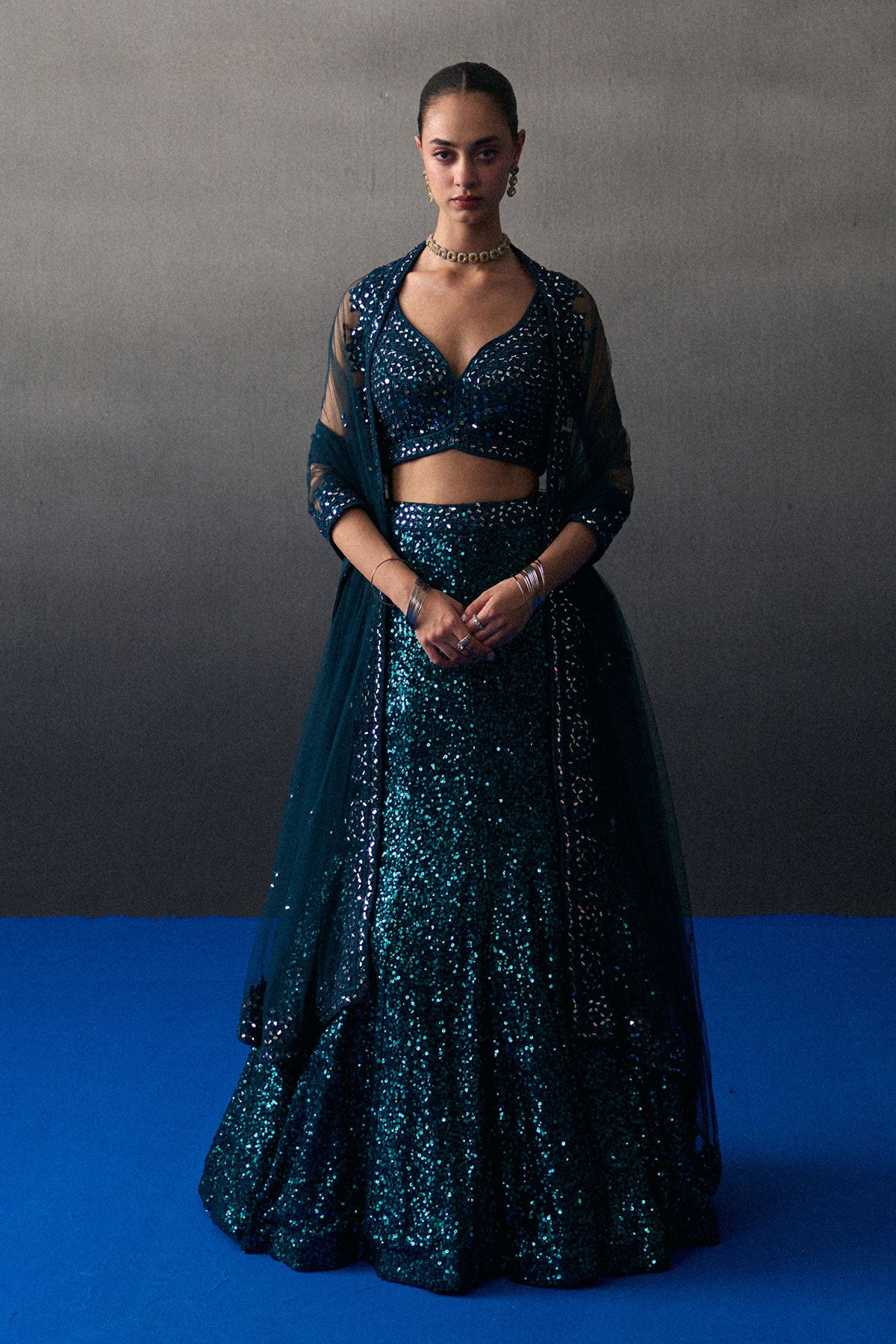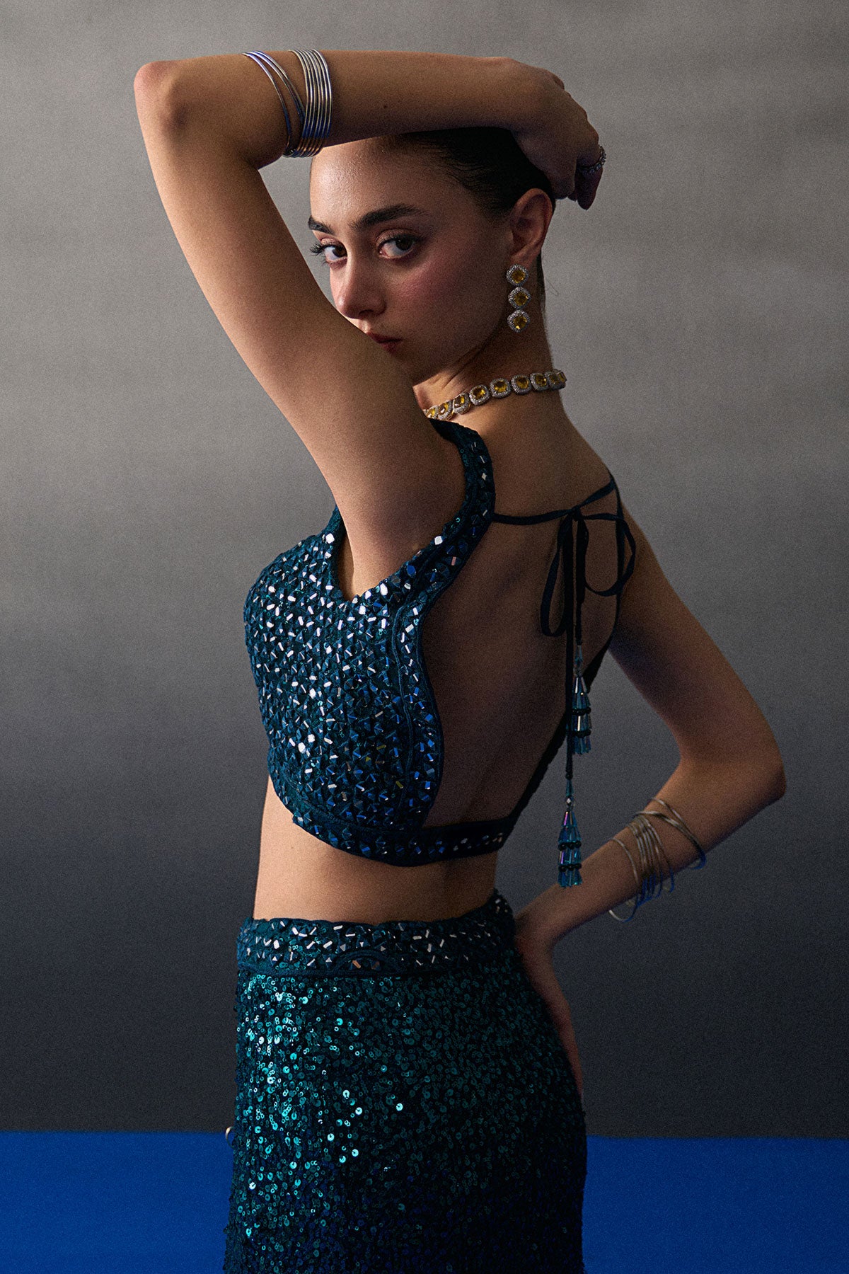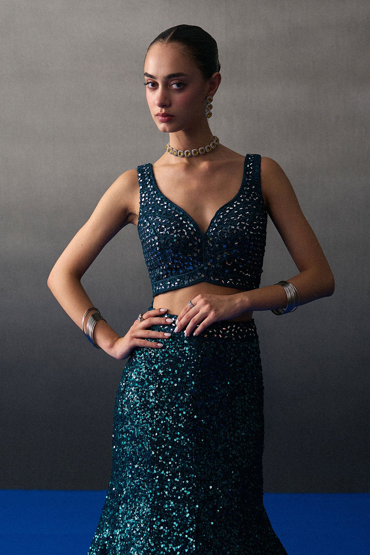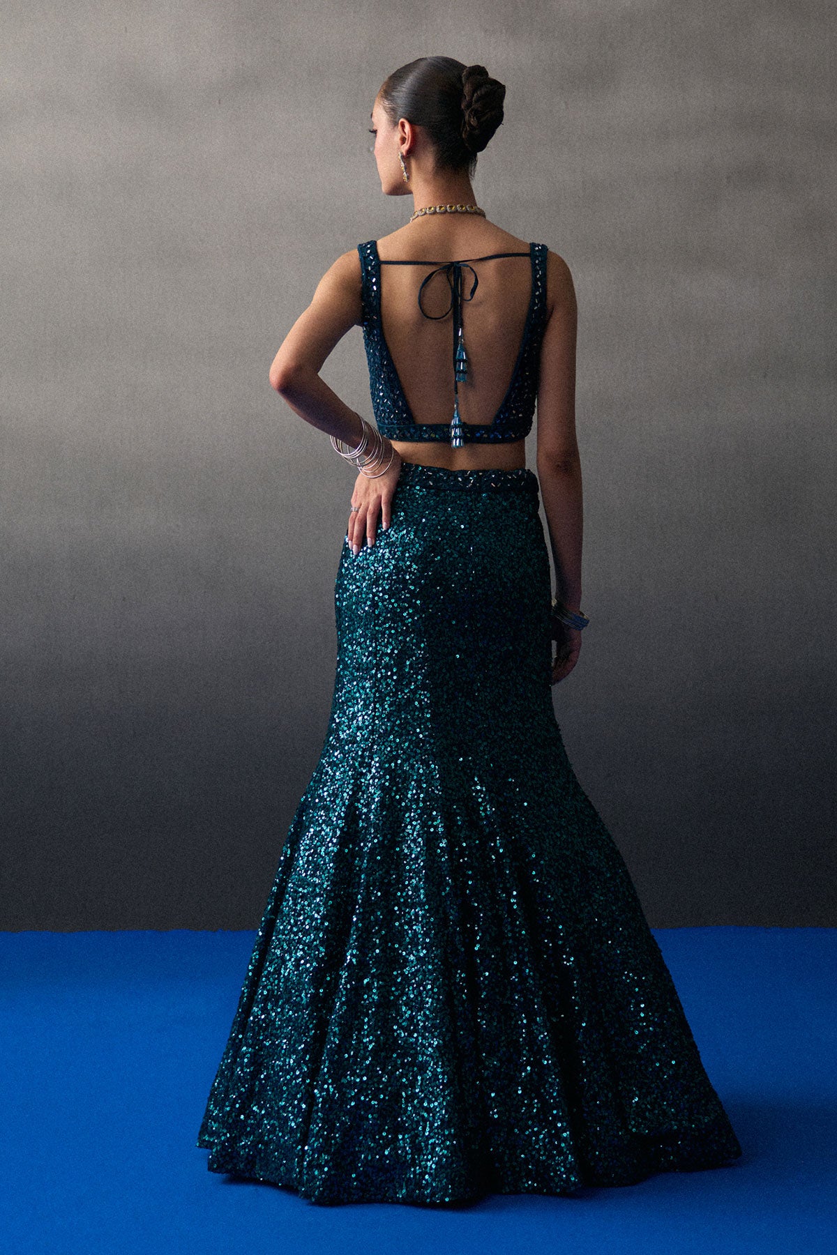 A Peacock Blue Mermaid Lehenga Set Crafted In Sequins Paired With A Mirrorwork Embroidered Blouse And Dupatta.