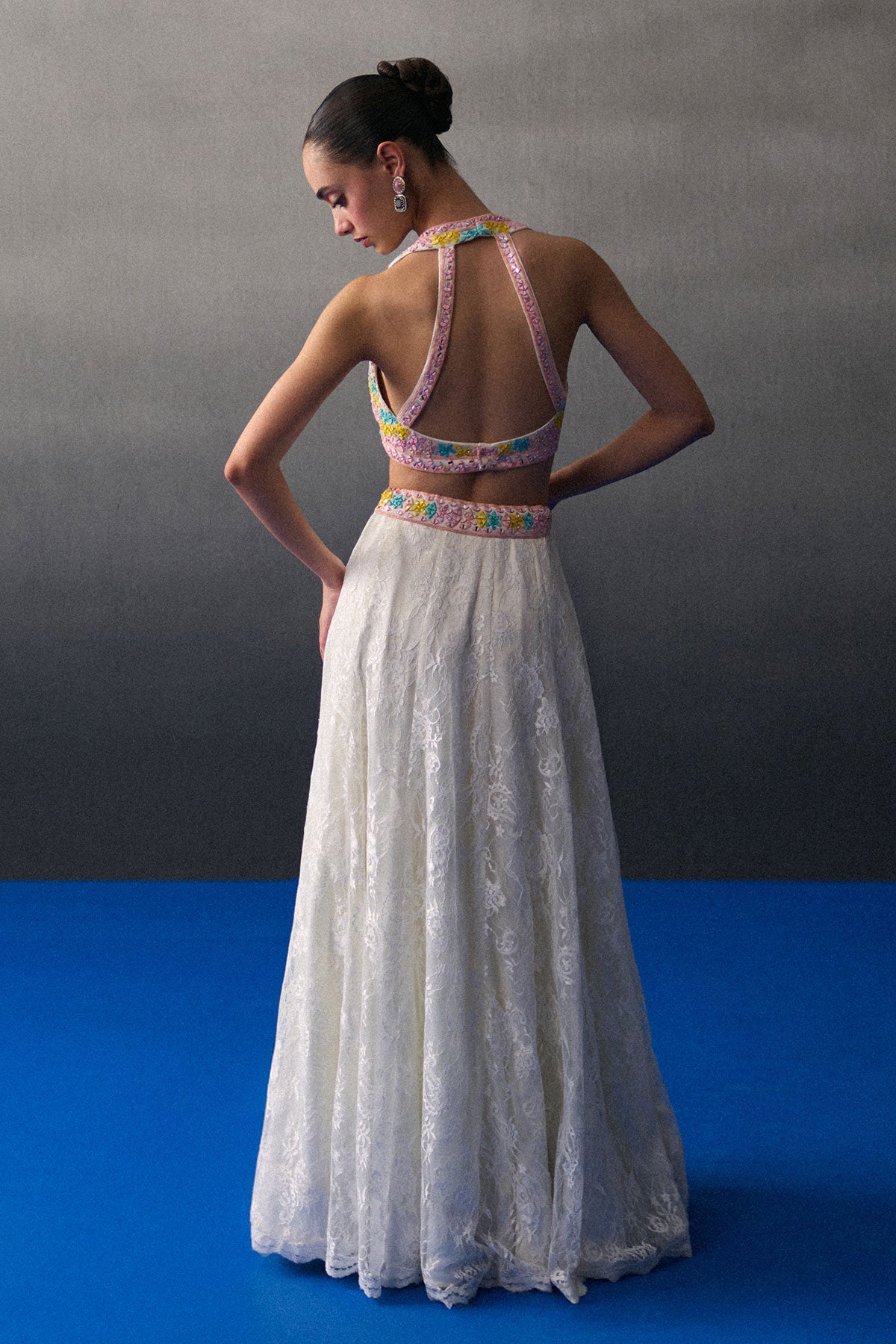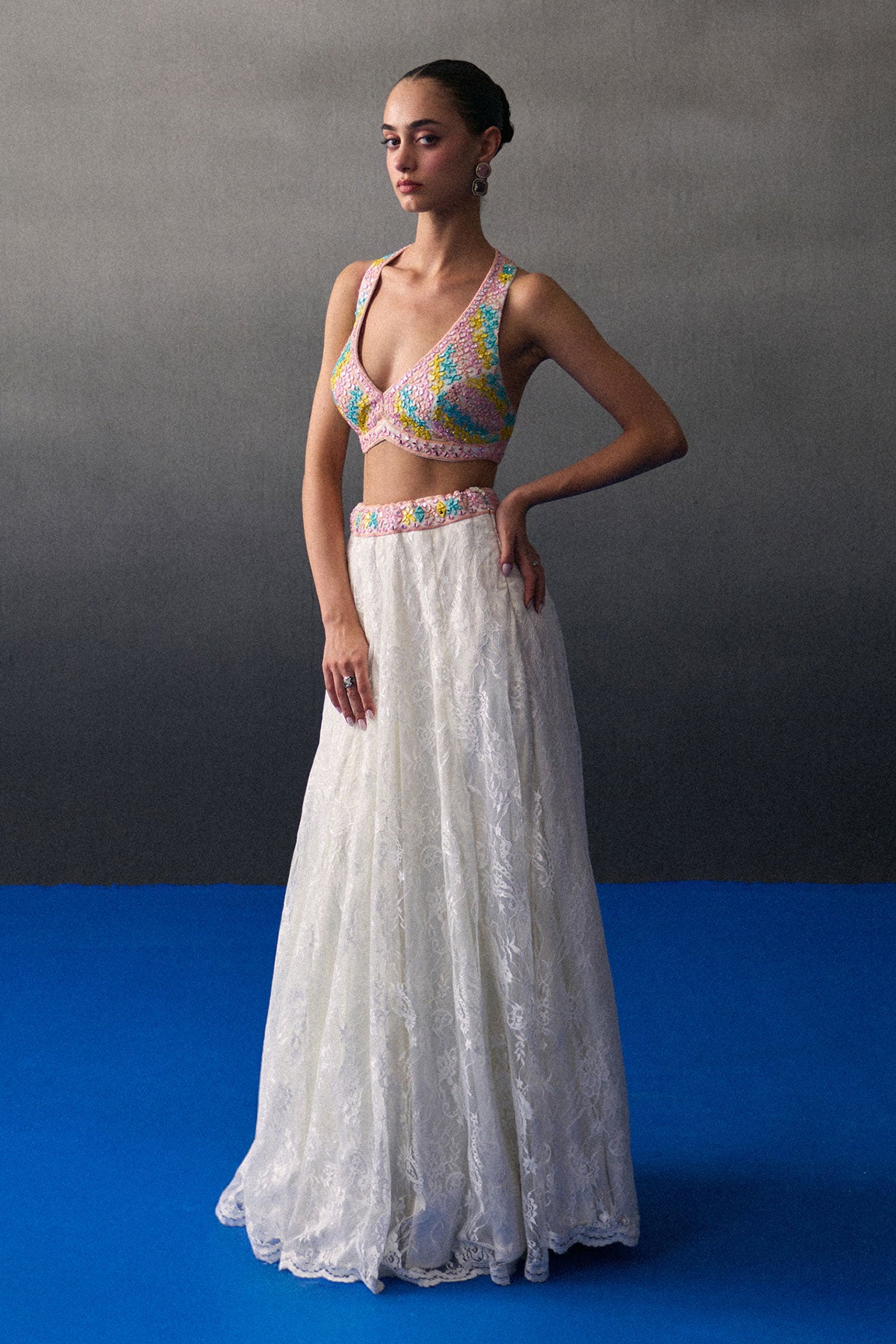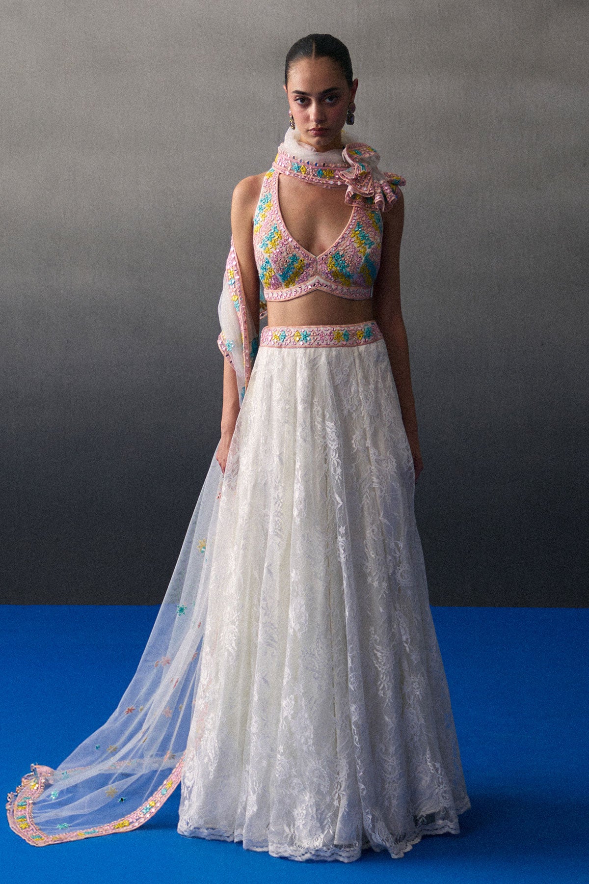 A White Lehenga Set Crafted In Chantilly, Paired With Mirrorwork Blouse And Dupatta.