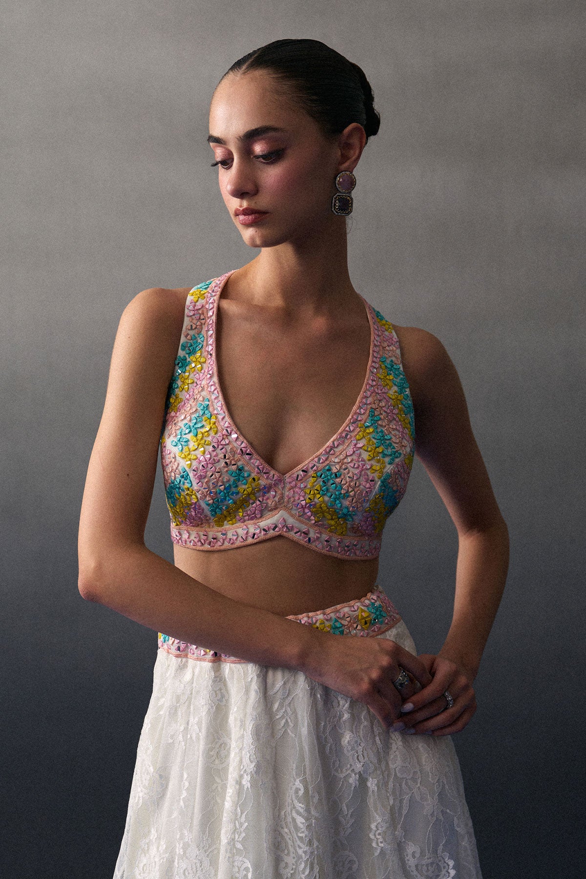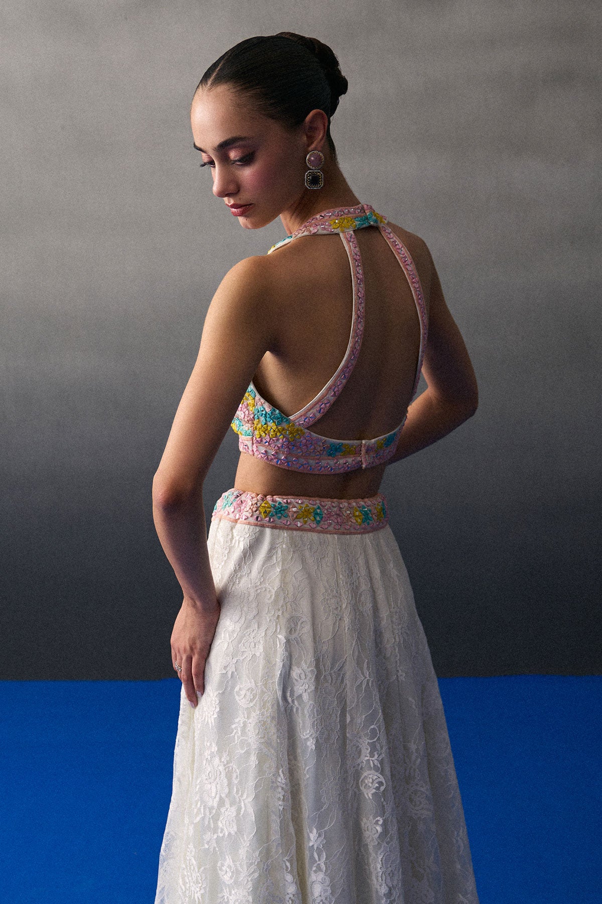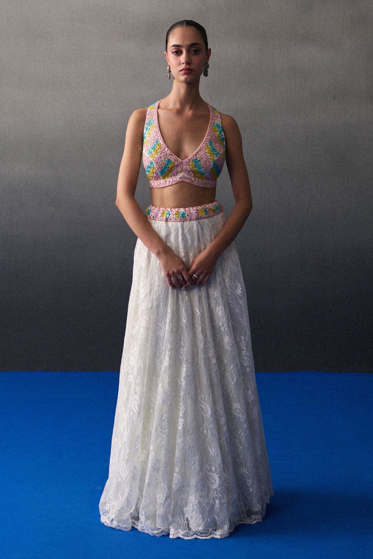 A White Lehenga Set Crafted In Chantilly, Paired With Mirrorwork Blouse And Dupatta.