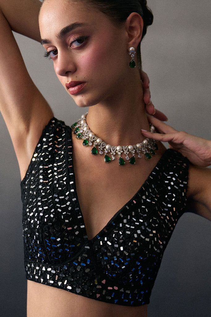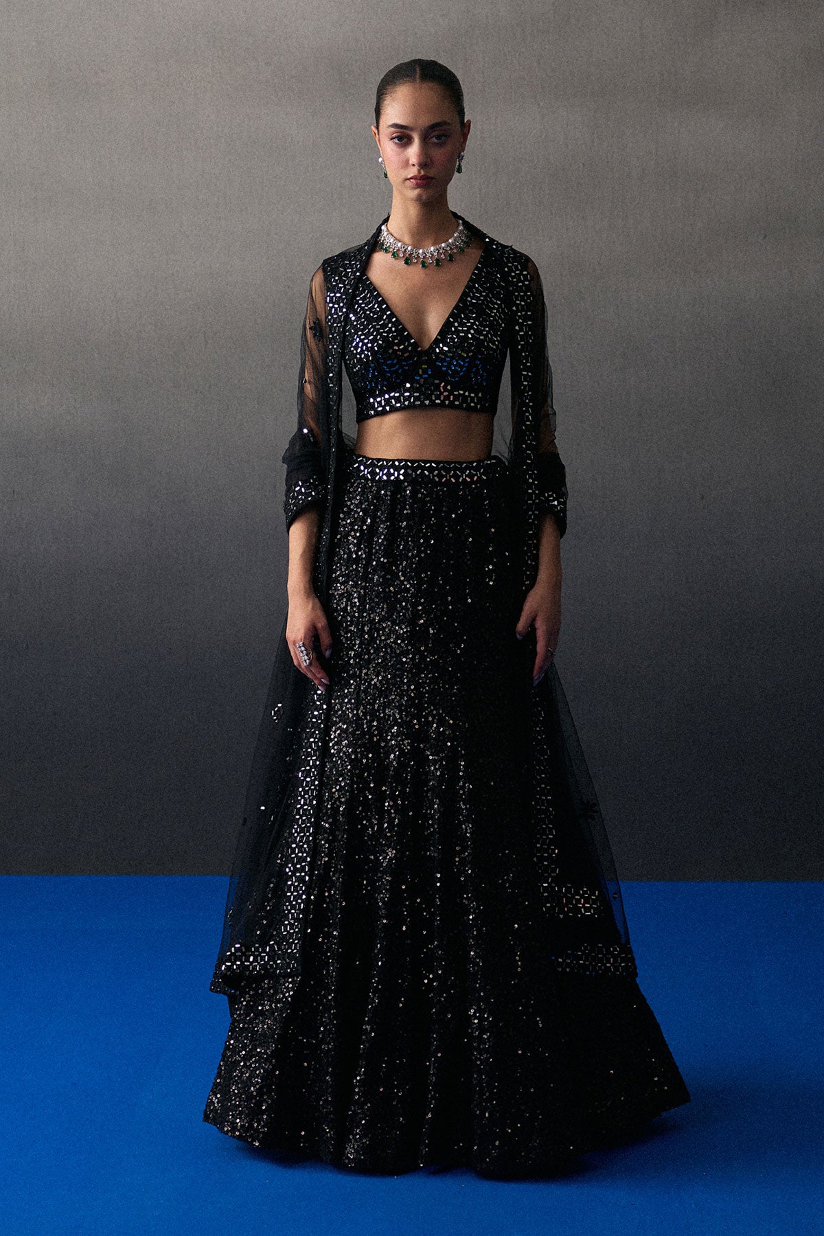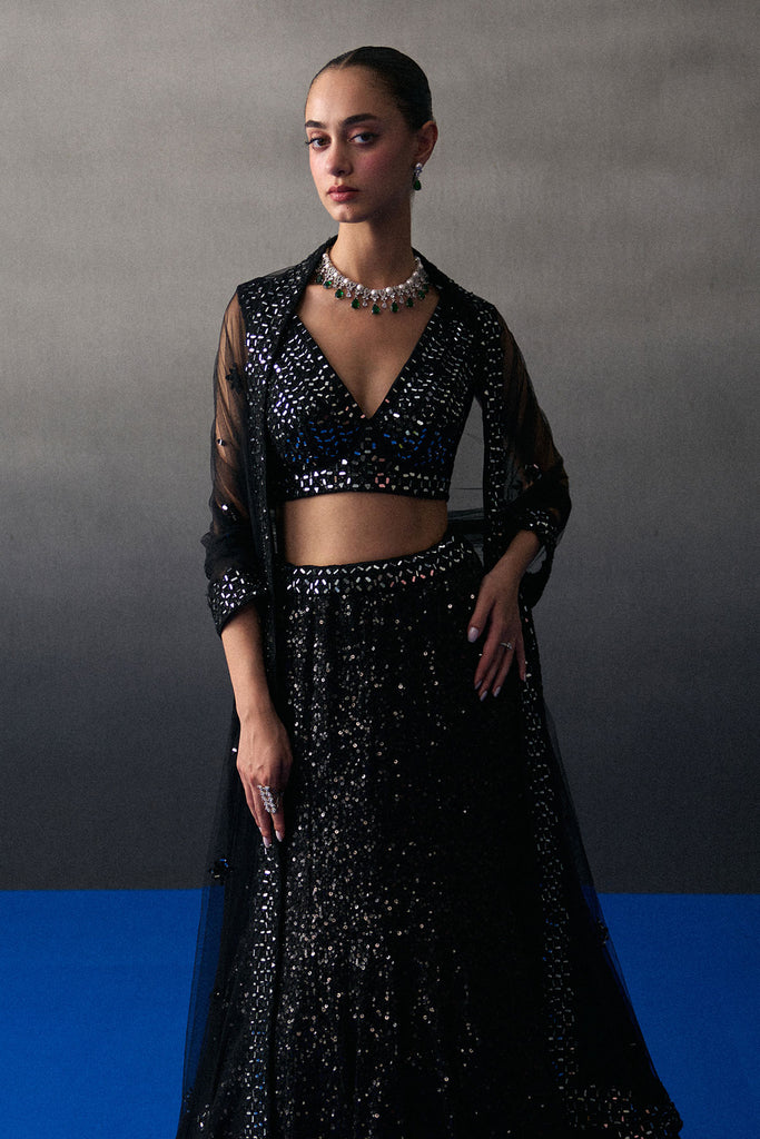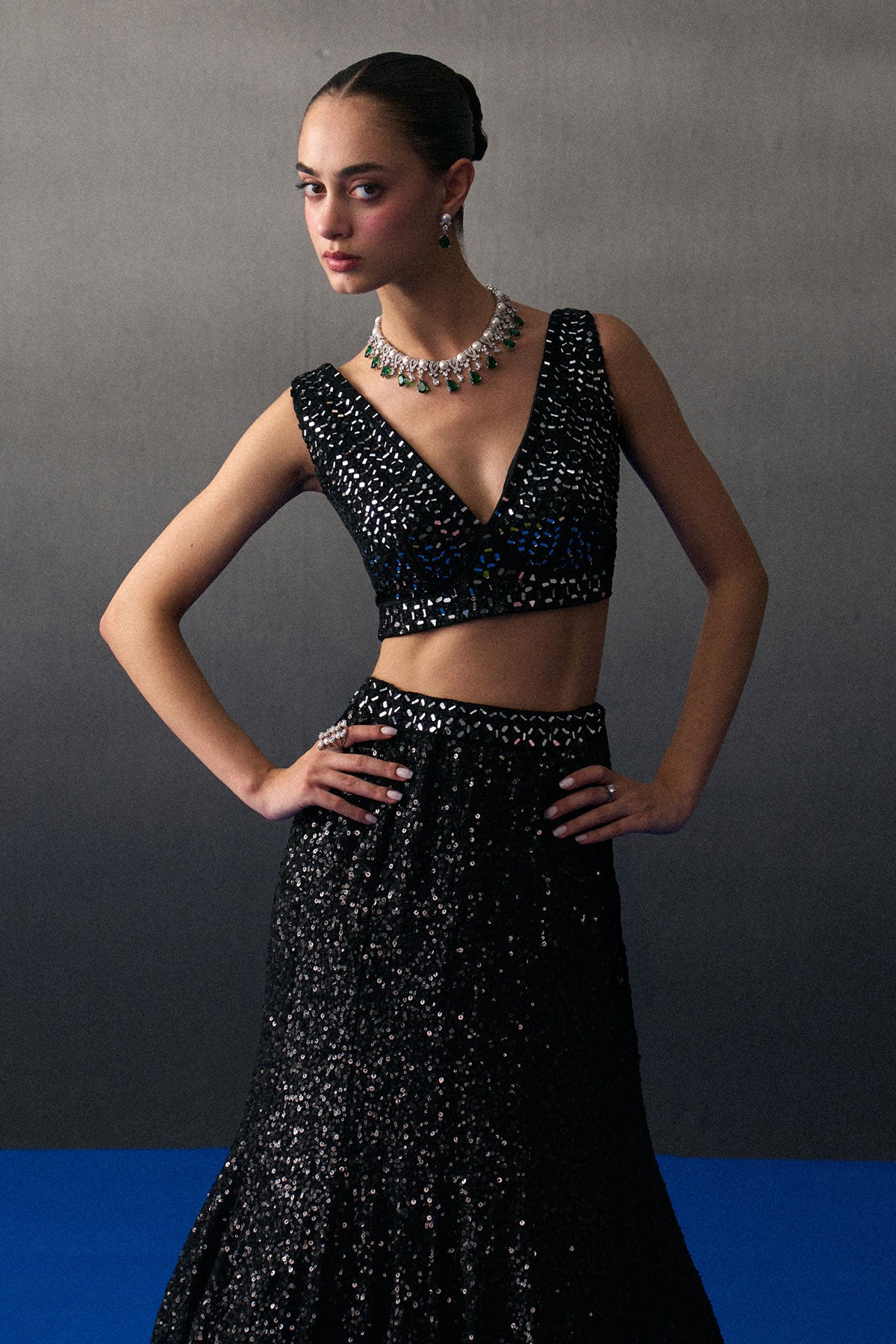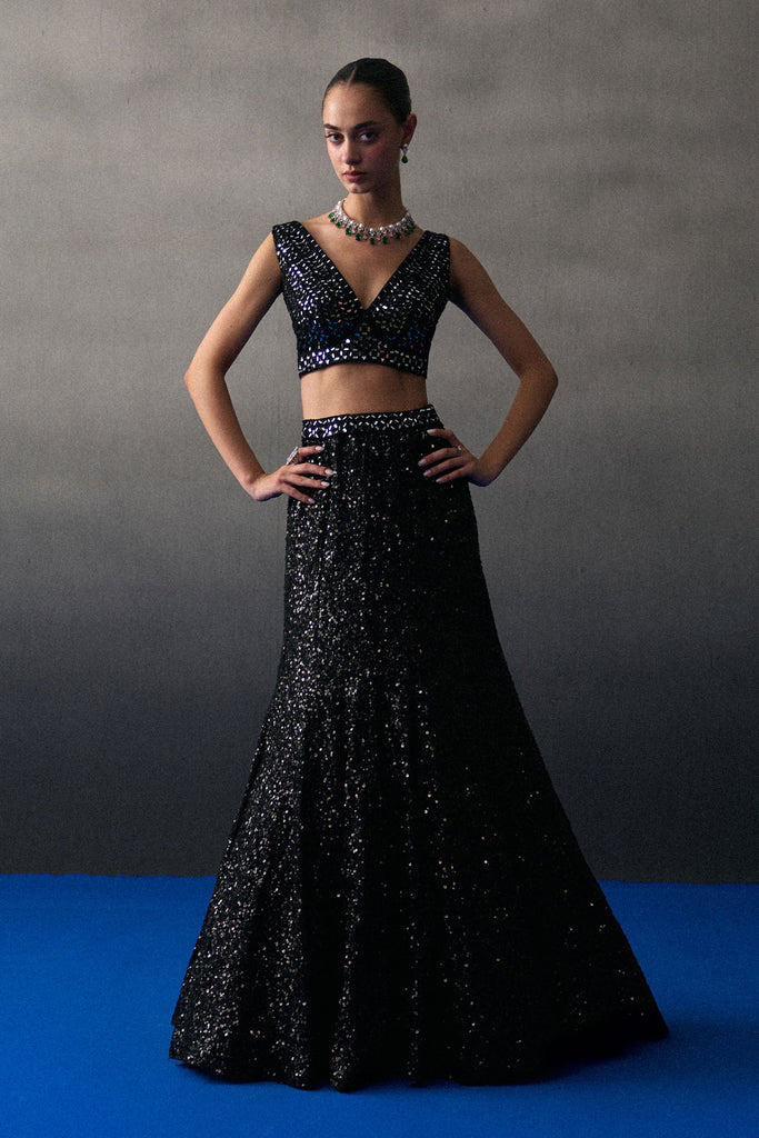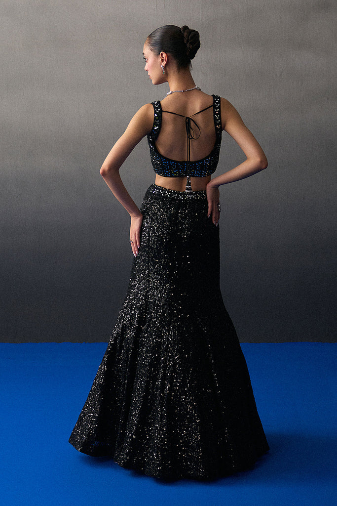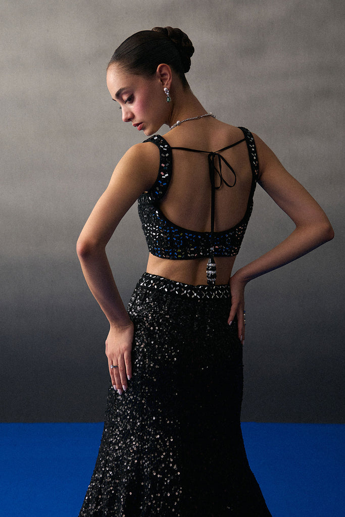 A Black Mermaid Lehenga Set Crafted In Sequins Embroidered With Tonal Mirror Work.