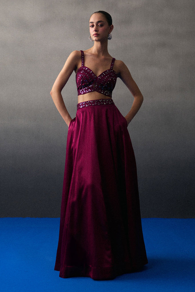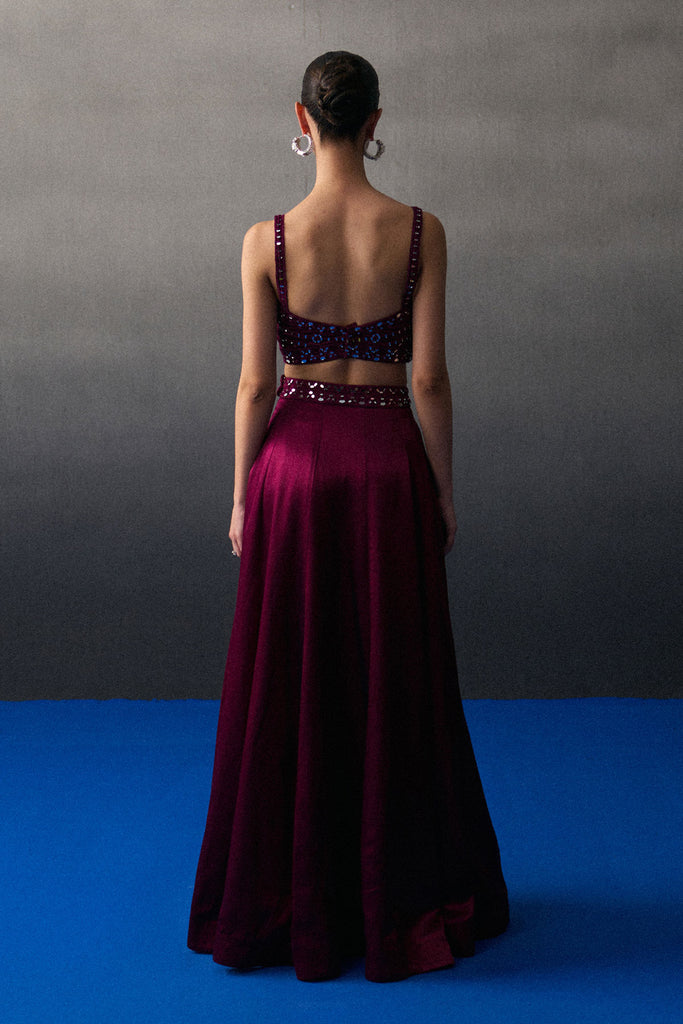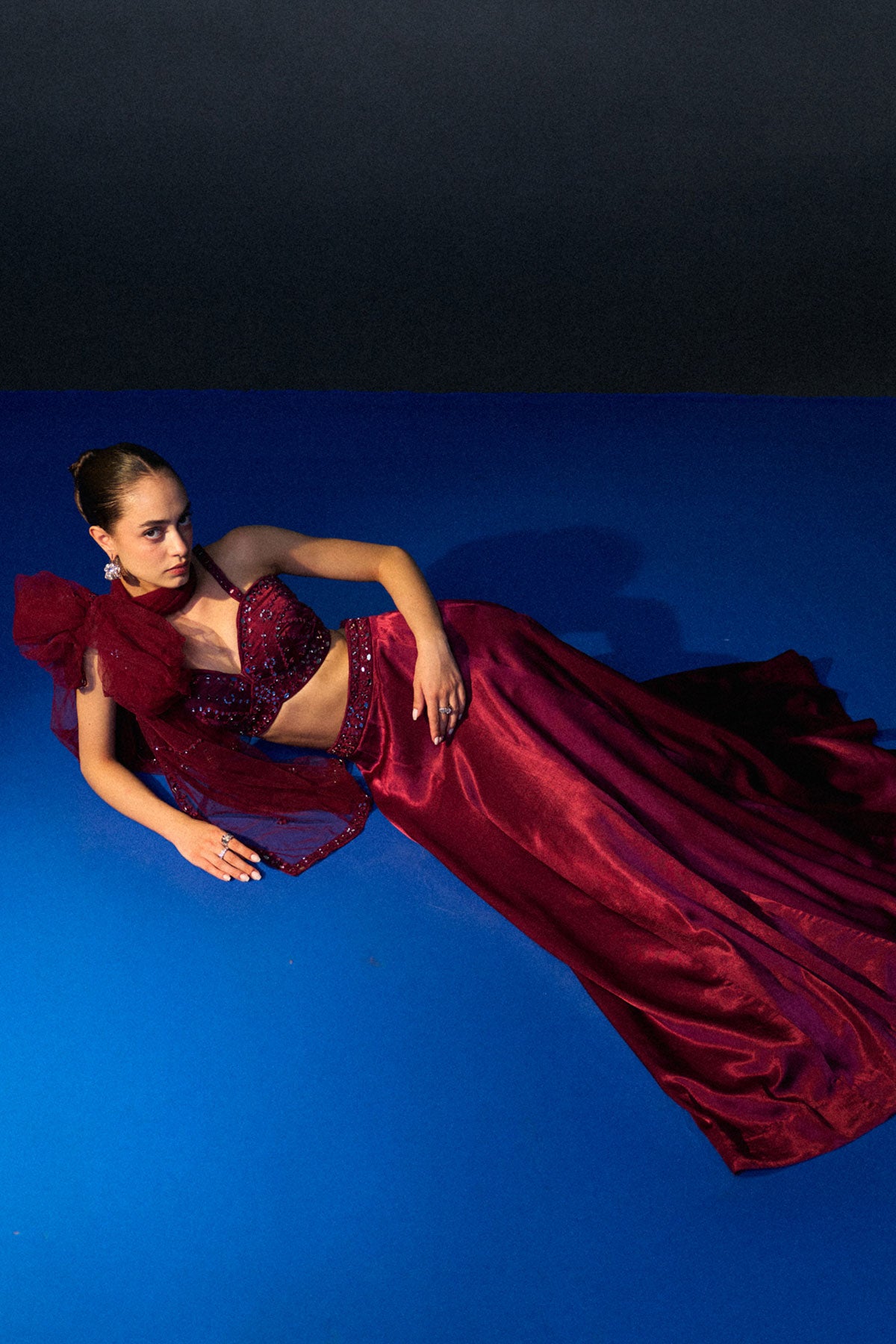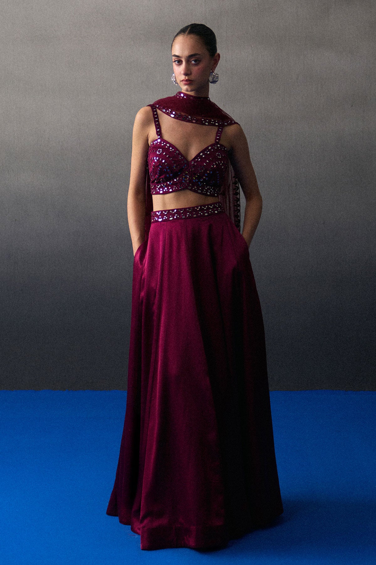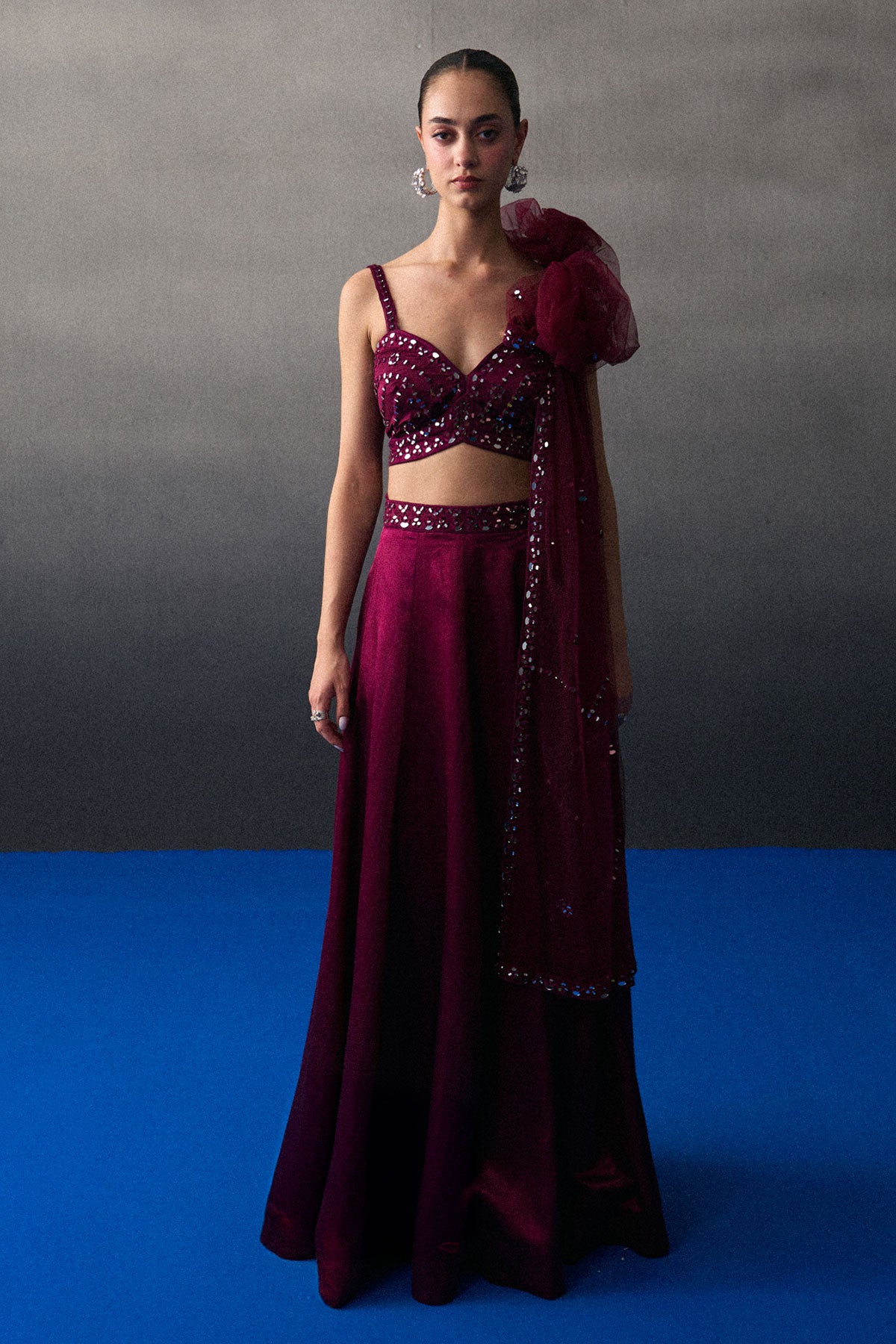 A Crimson Lehenga Set Crafted In Satin Silk Embroidered With A Tonal Mirror Work Blouse And Dupatta.