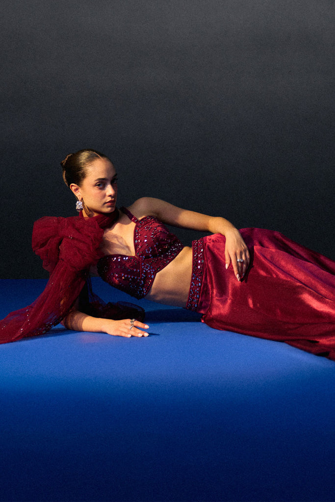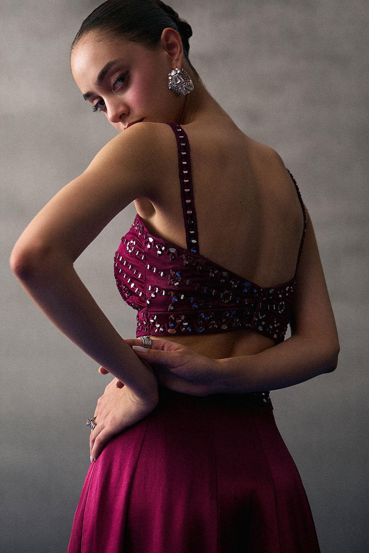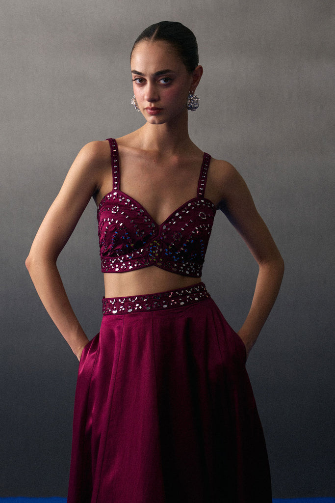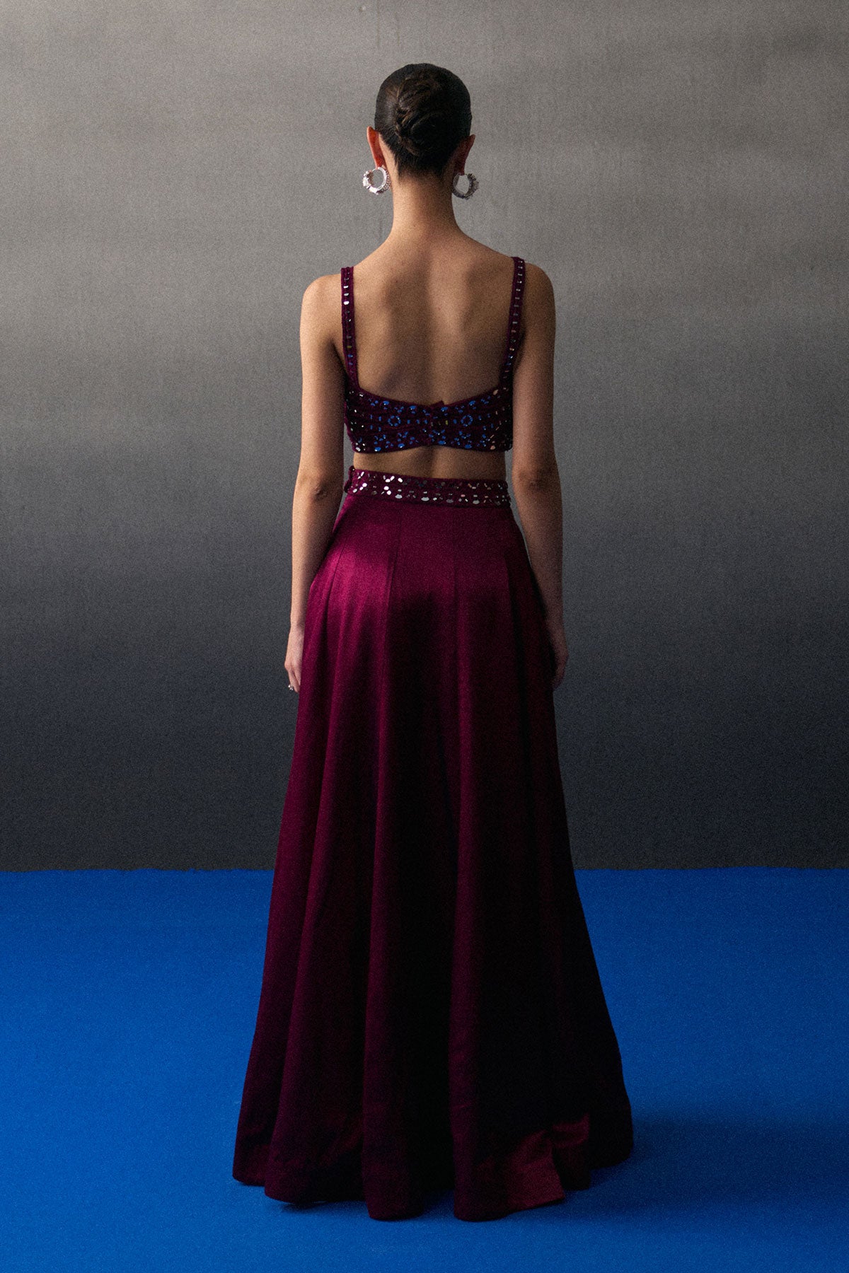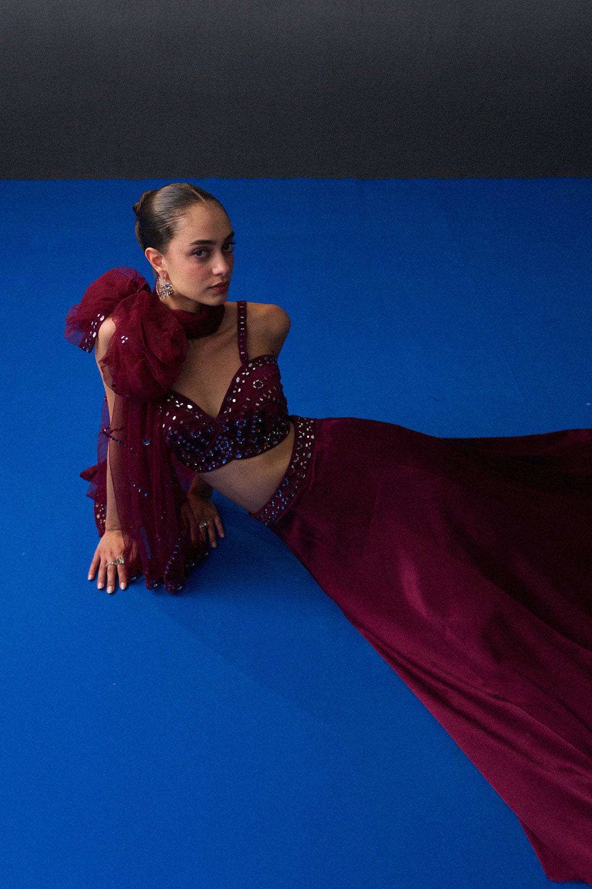 A Crimson Lehenga Set Crafted In Satin Silk Embroidered With A Tonal Mirror Work Blouse And Dupatta.