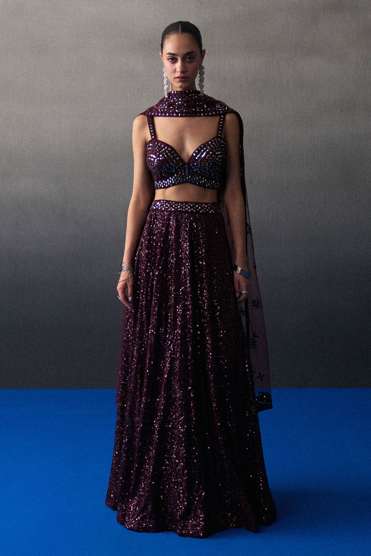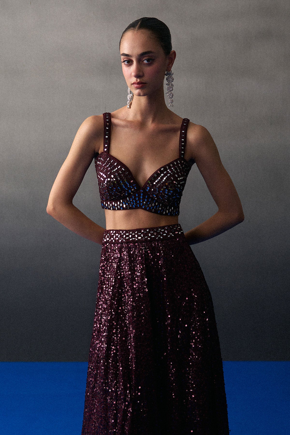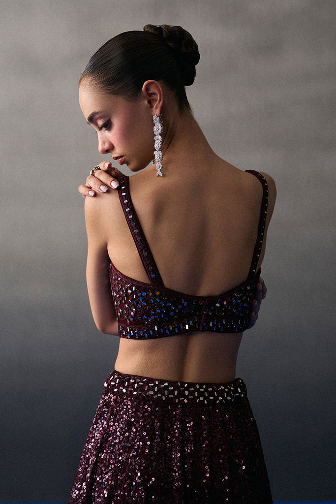 A Crimson Lehenga Set Crafted In Sequins Paired With A Tonal Mirrorwork Embroidered Blouse And Dupatta.
