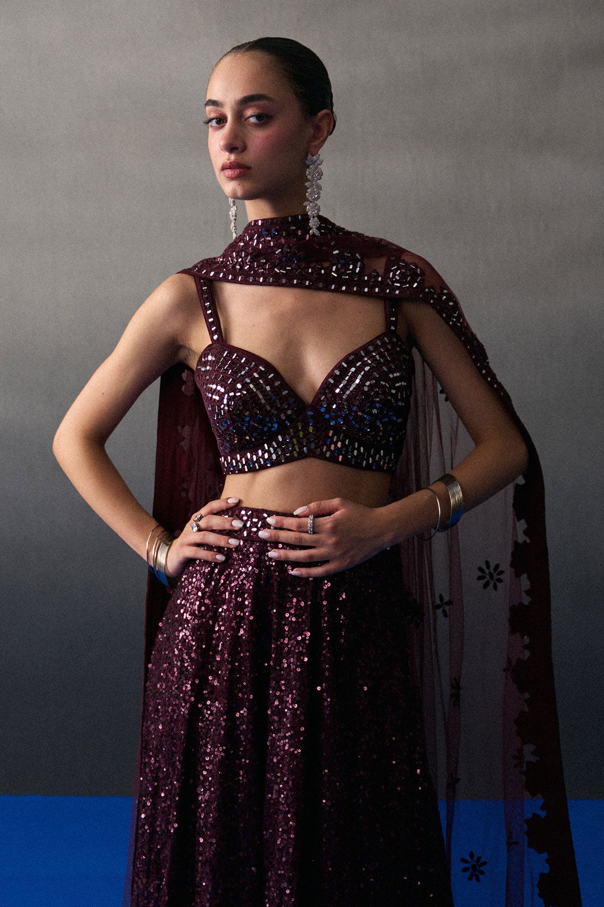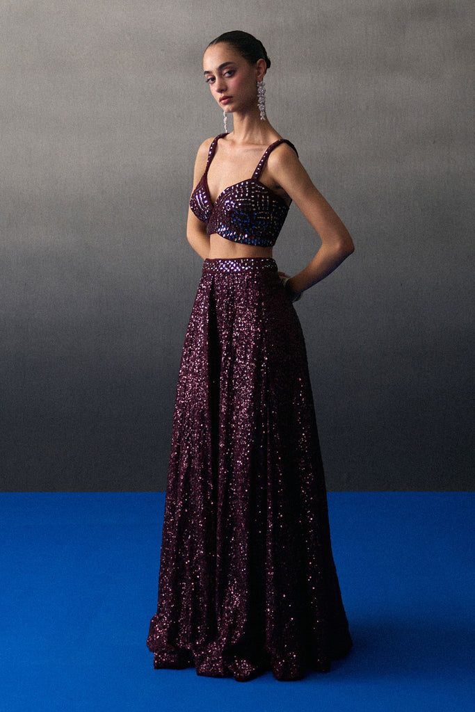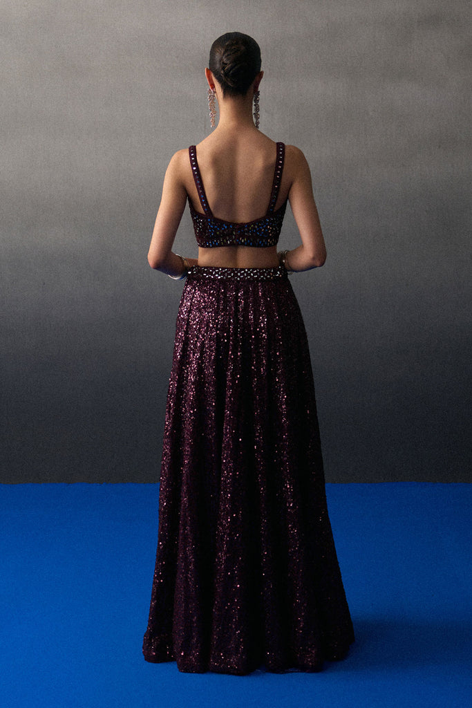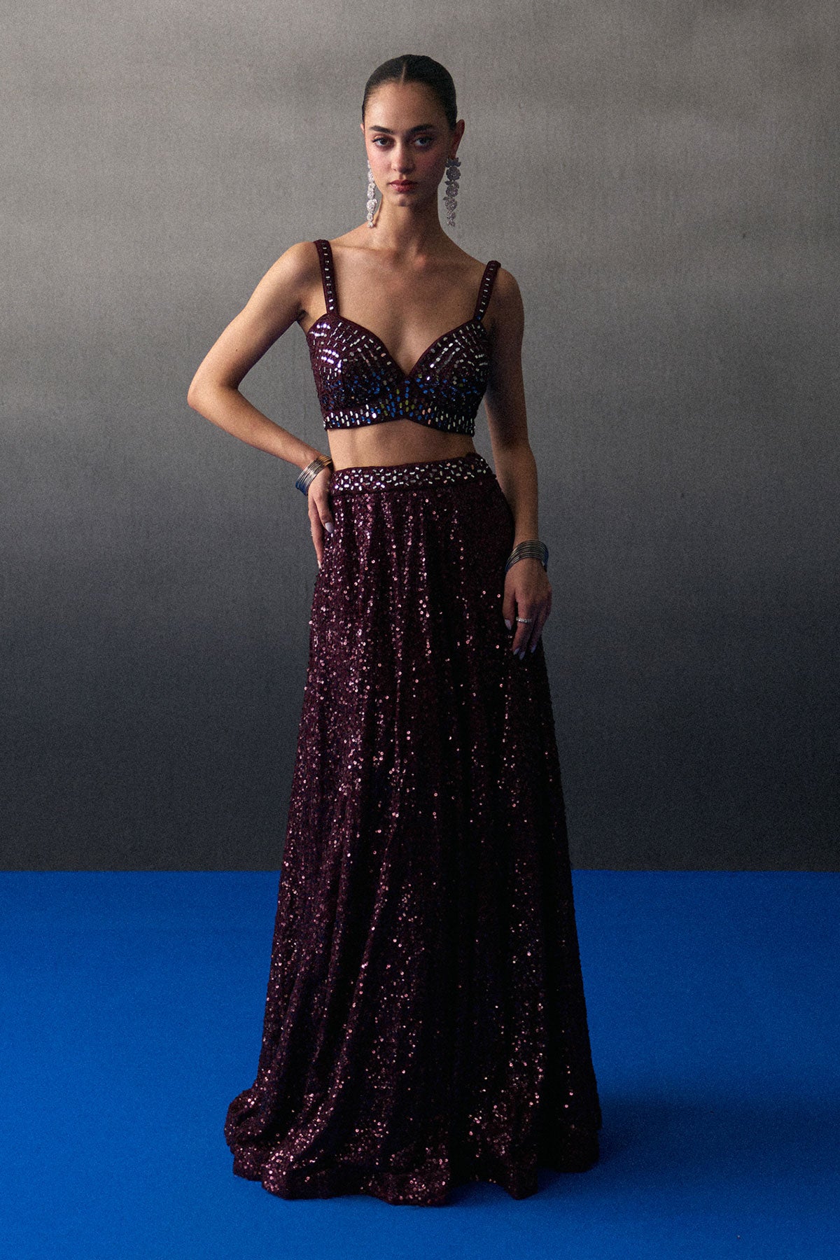 A Crimson Lehenga Set Crafted In Sequins Paired With A Tonal Mirrorwork Embroidered Blouse And Dupatta.