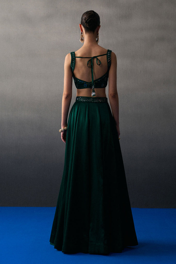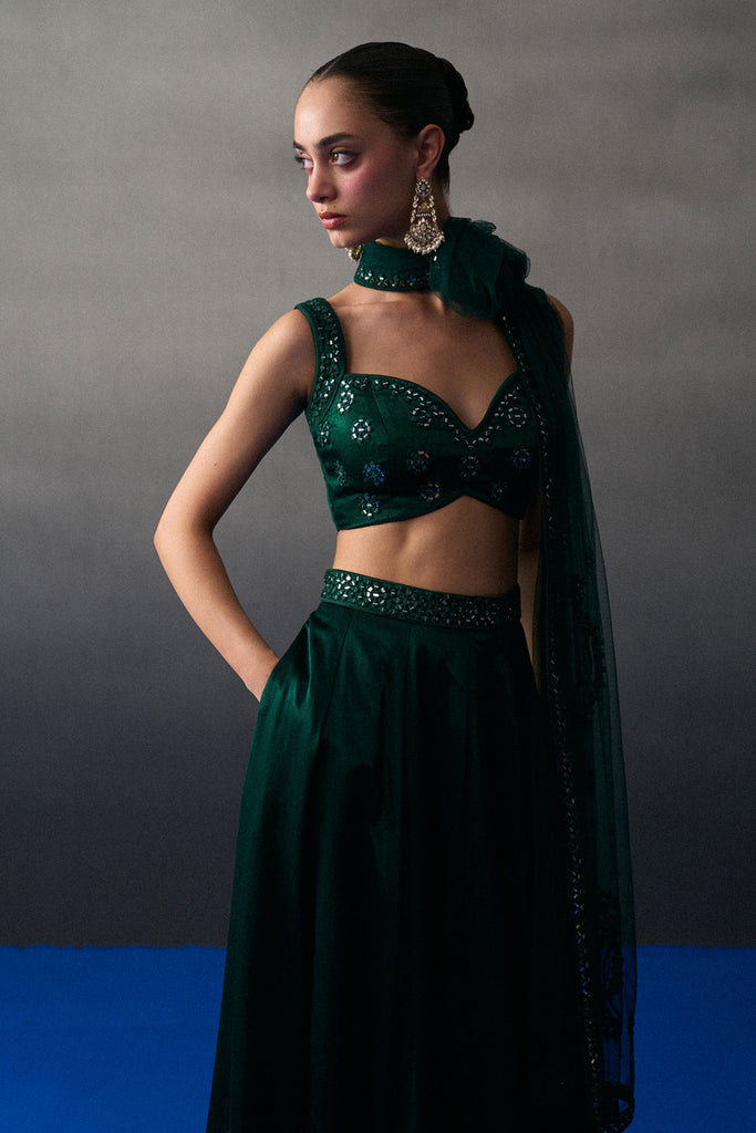 An Emerald Green Lehenga Set Crafted In Satin Silk Embroidered With Tonal Mirror Work Embroidery.