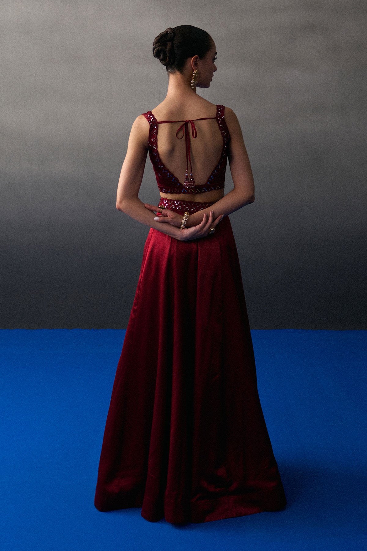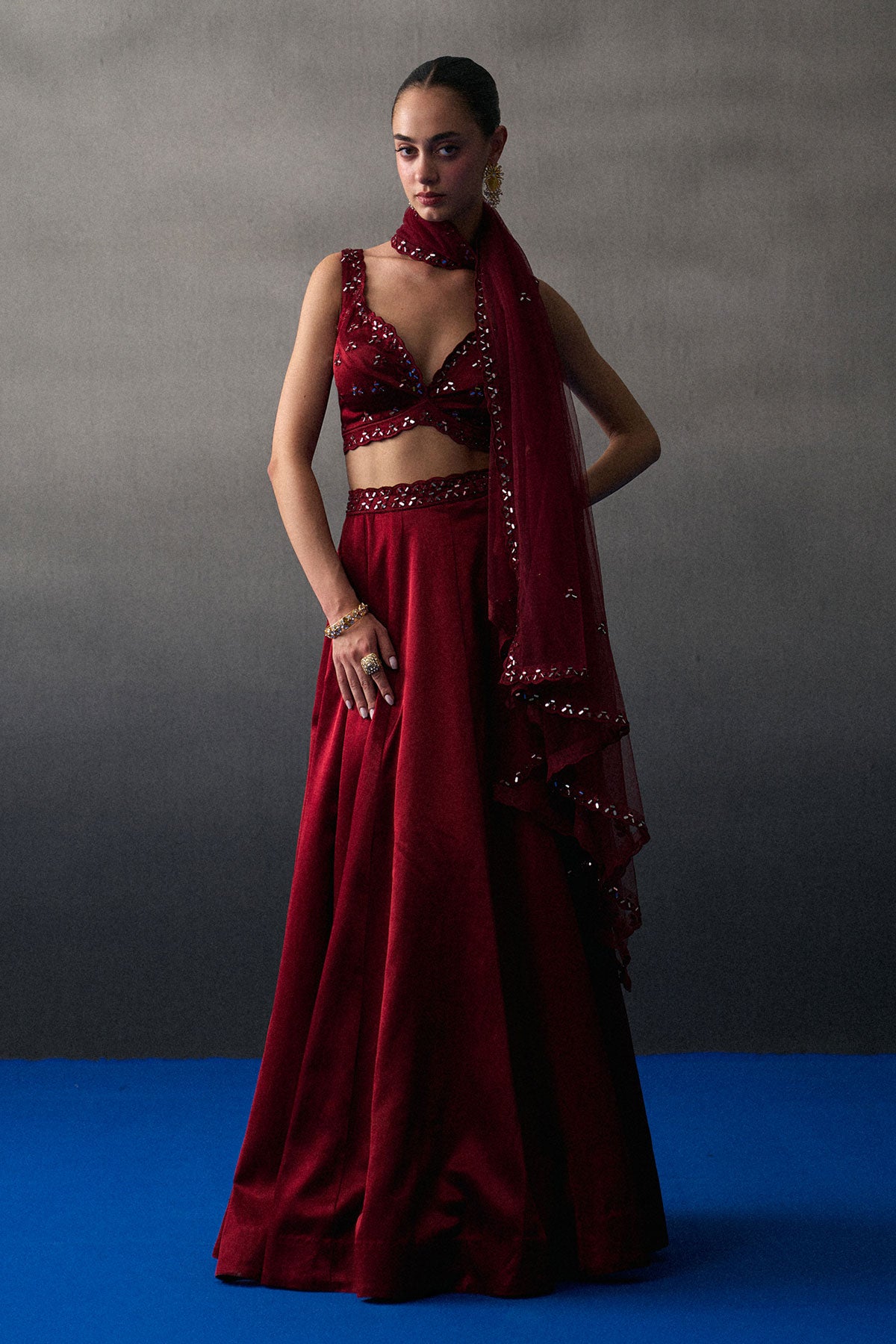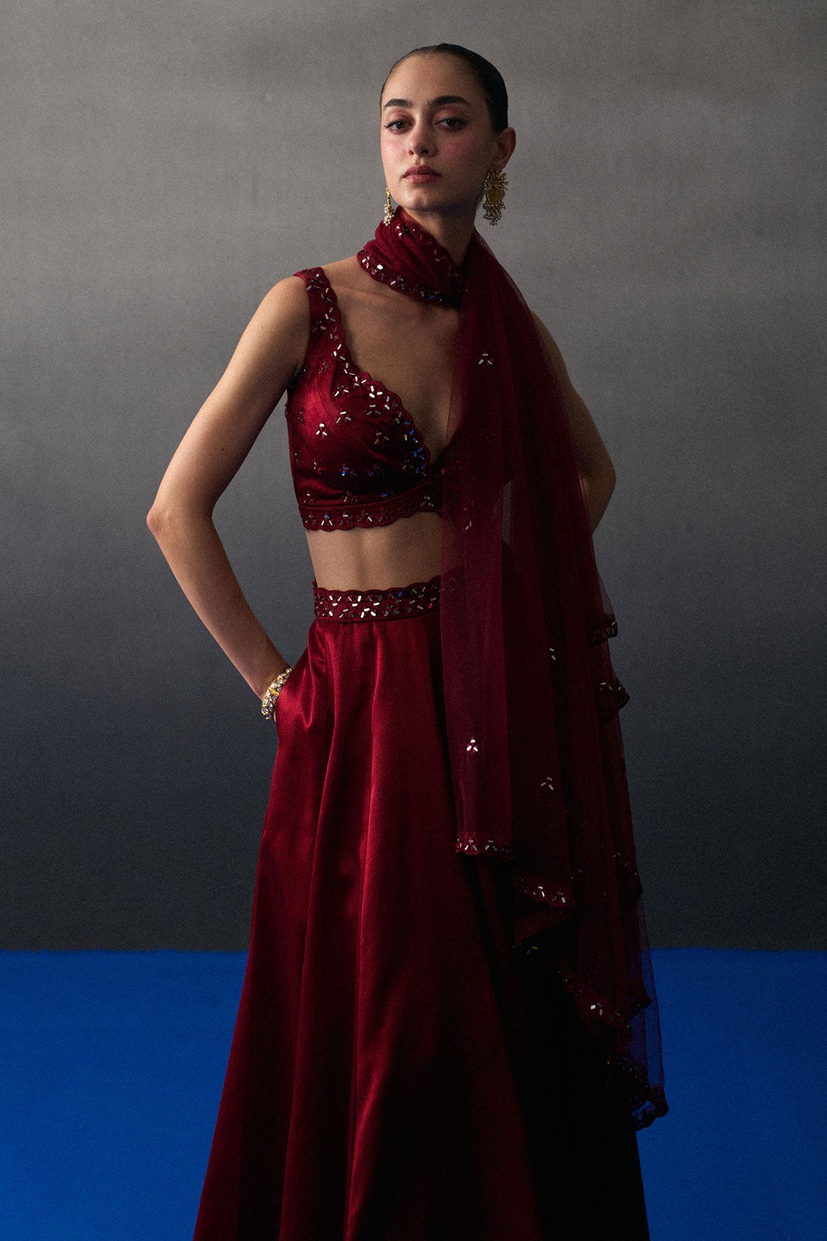 A Maroon Lehenga Set Crafted In Satin Silk Embroidered With Tonal Mirror Work Blouse And Dupatta.