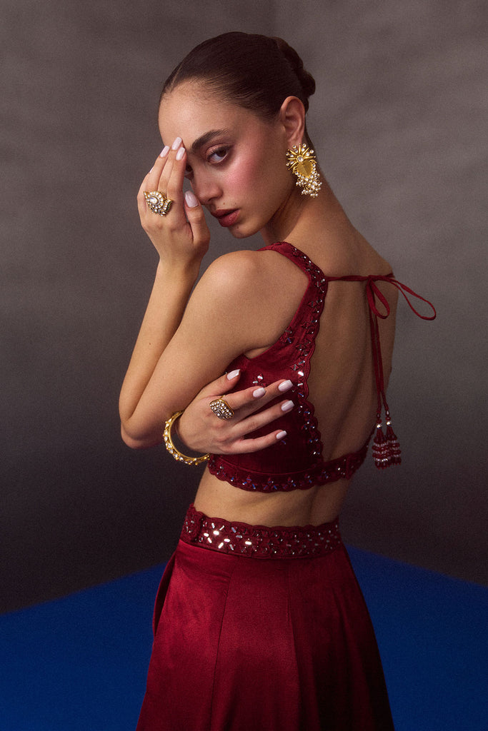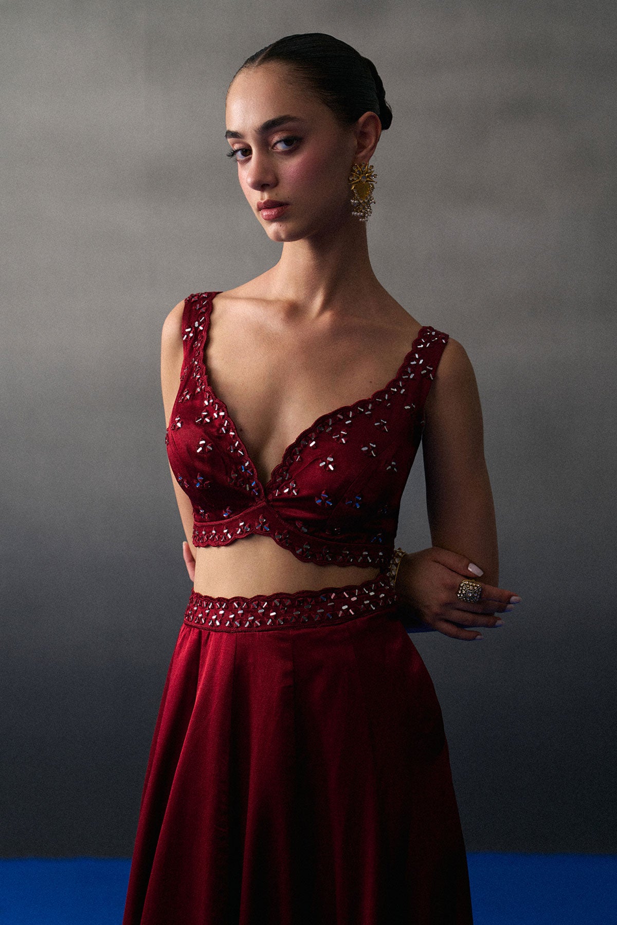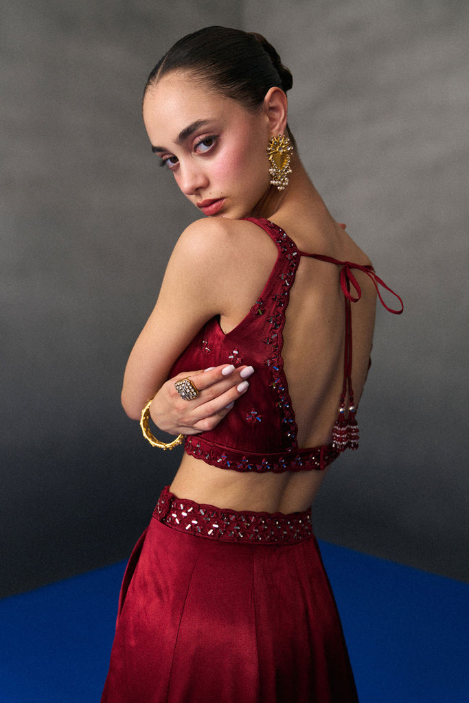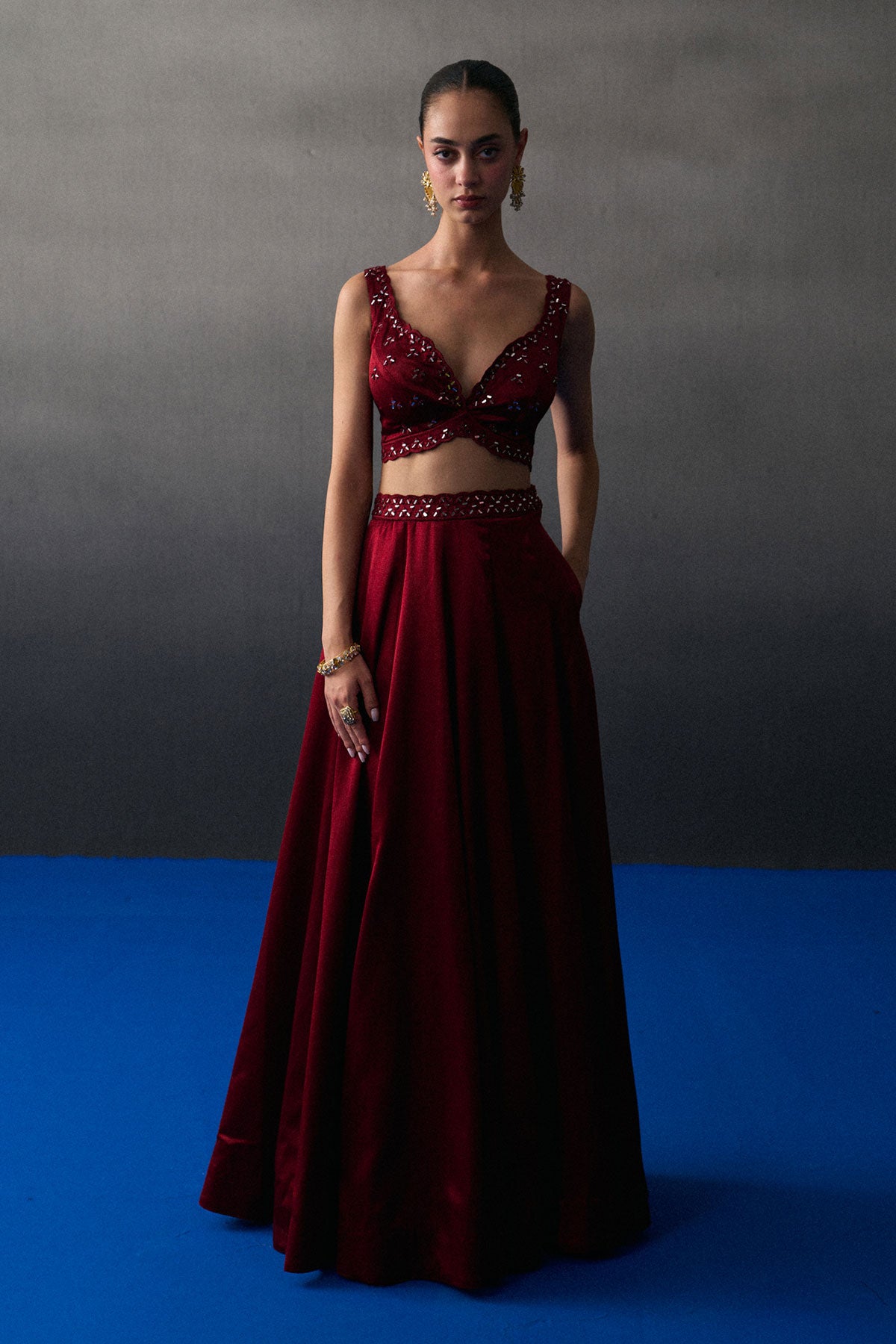 A Maroon Lehenga Set Crafted In Satin Silk Embroidered With Tonal Mirror Work Blouse And Dupatta.
