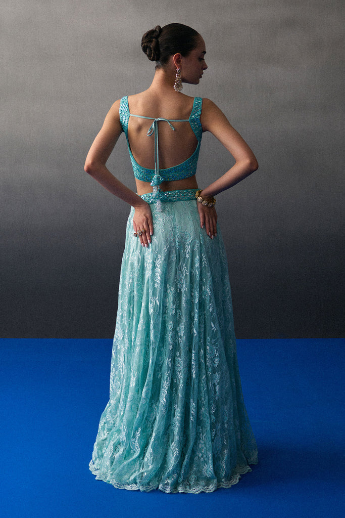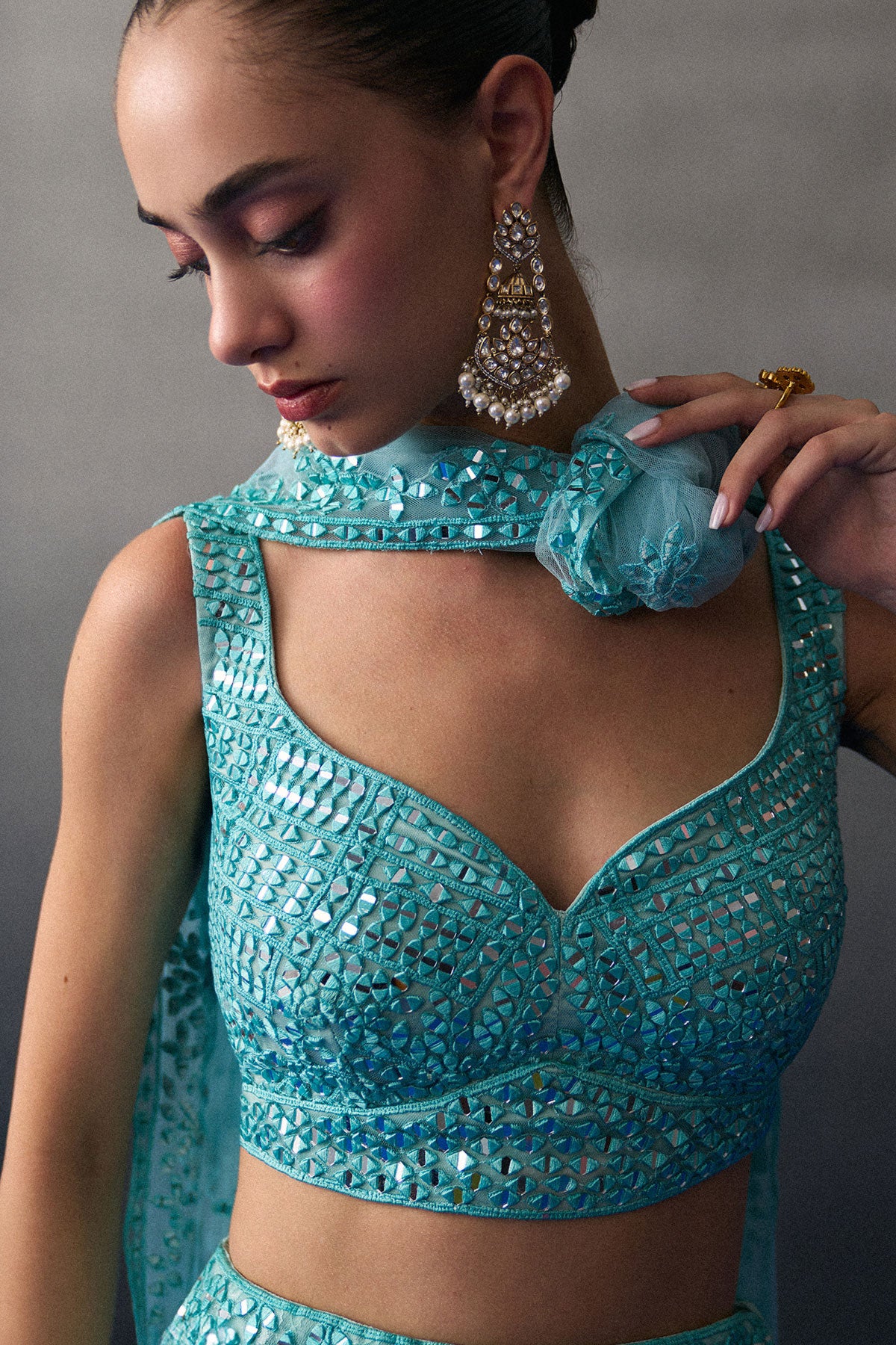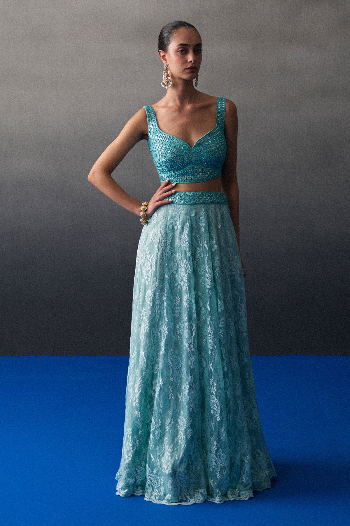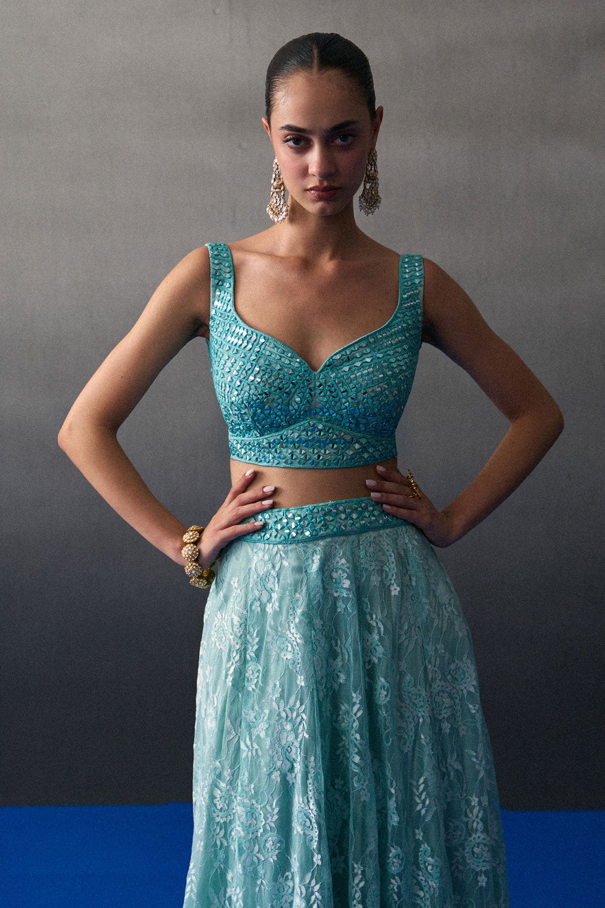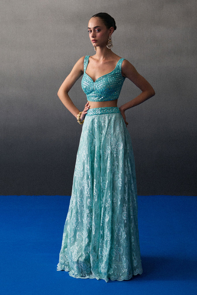 A Mint Green Lehenga Set Crafted In Chantilly, Paired With A Mirror Work Blouse And Dupatta.