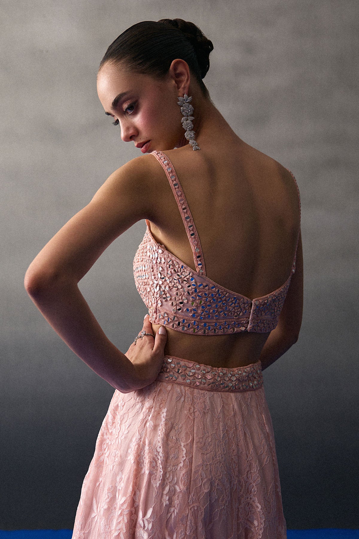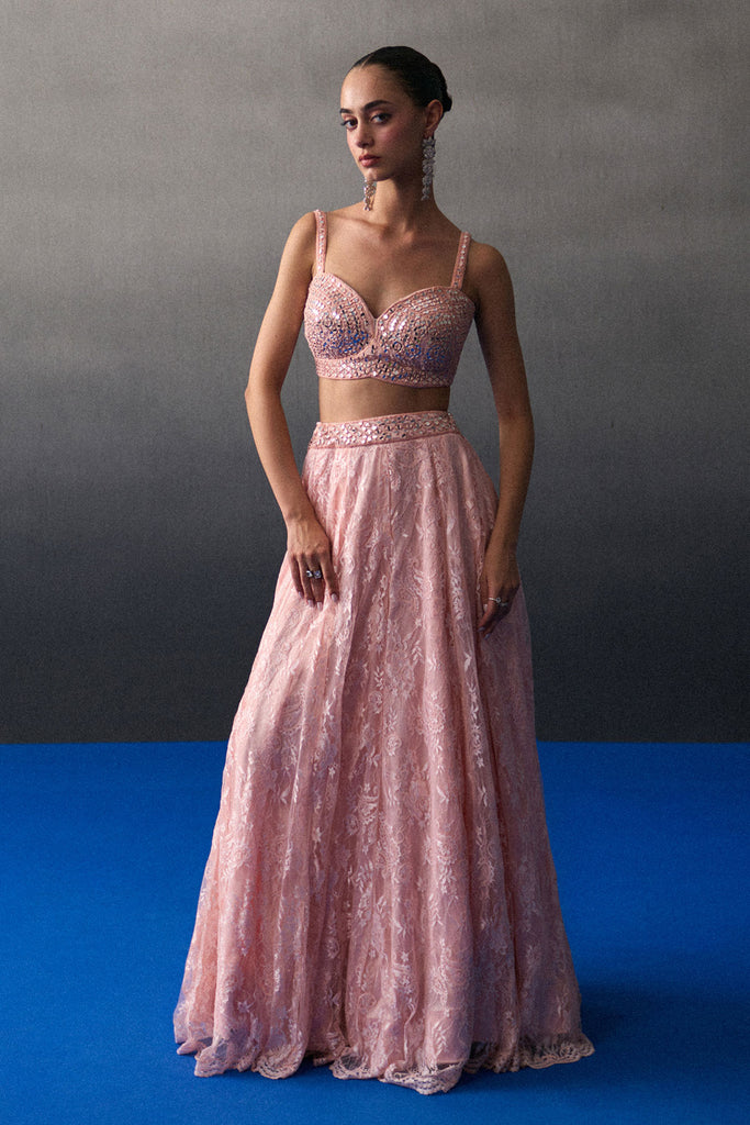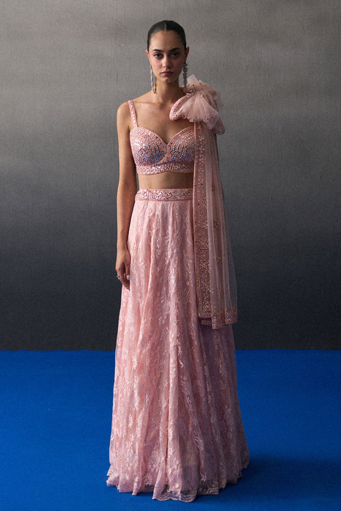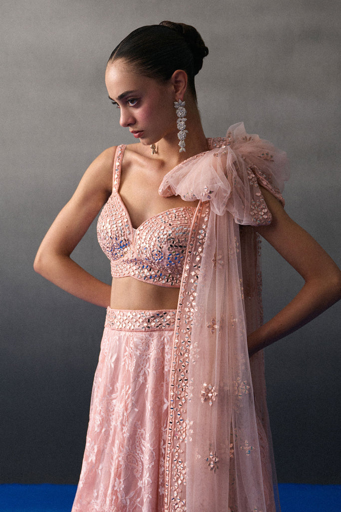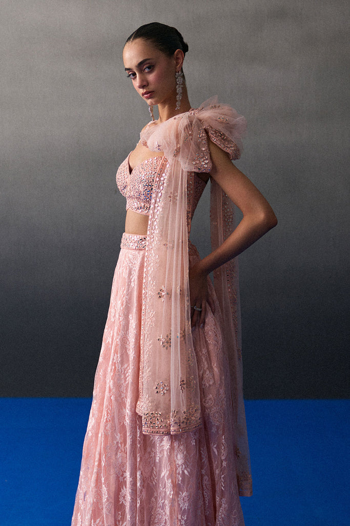 A Peach Lehenga Set Crafted In Chantilly Paired With A Mirror Work Blouse And Dupatta.