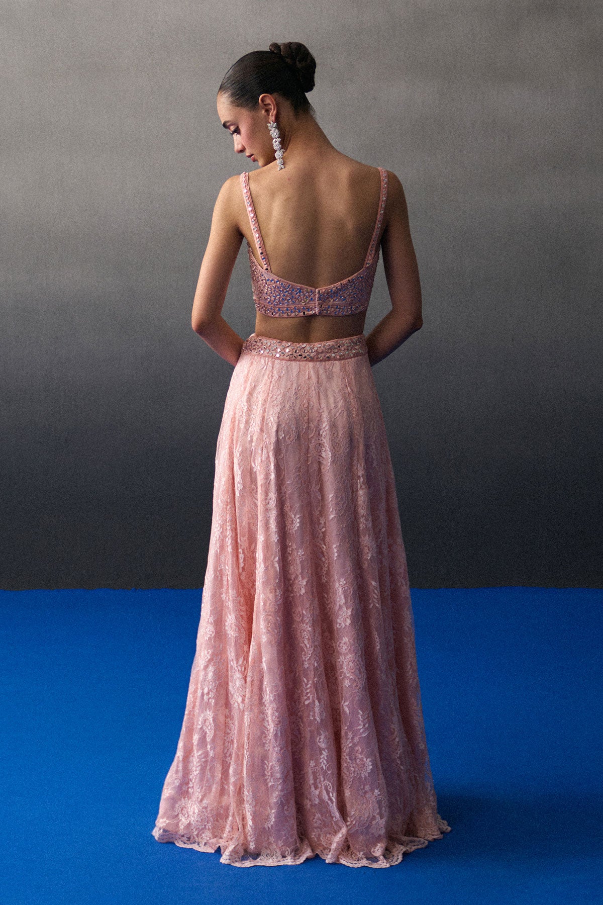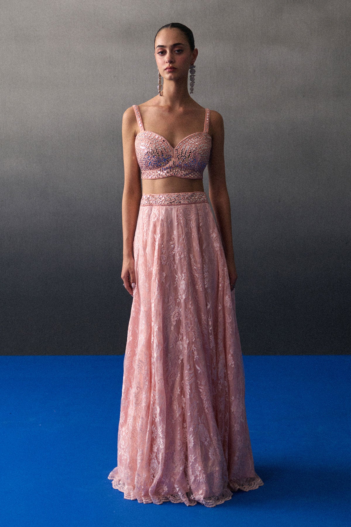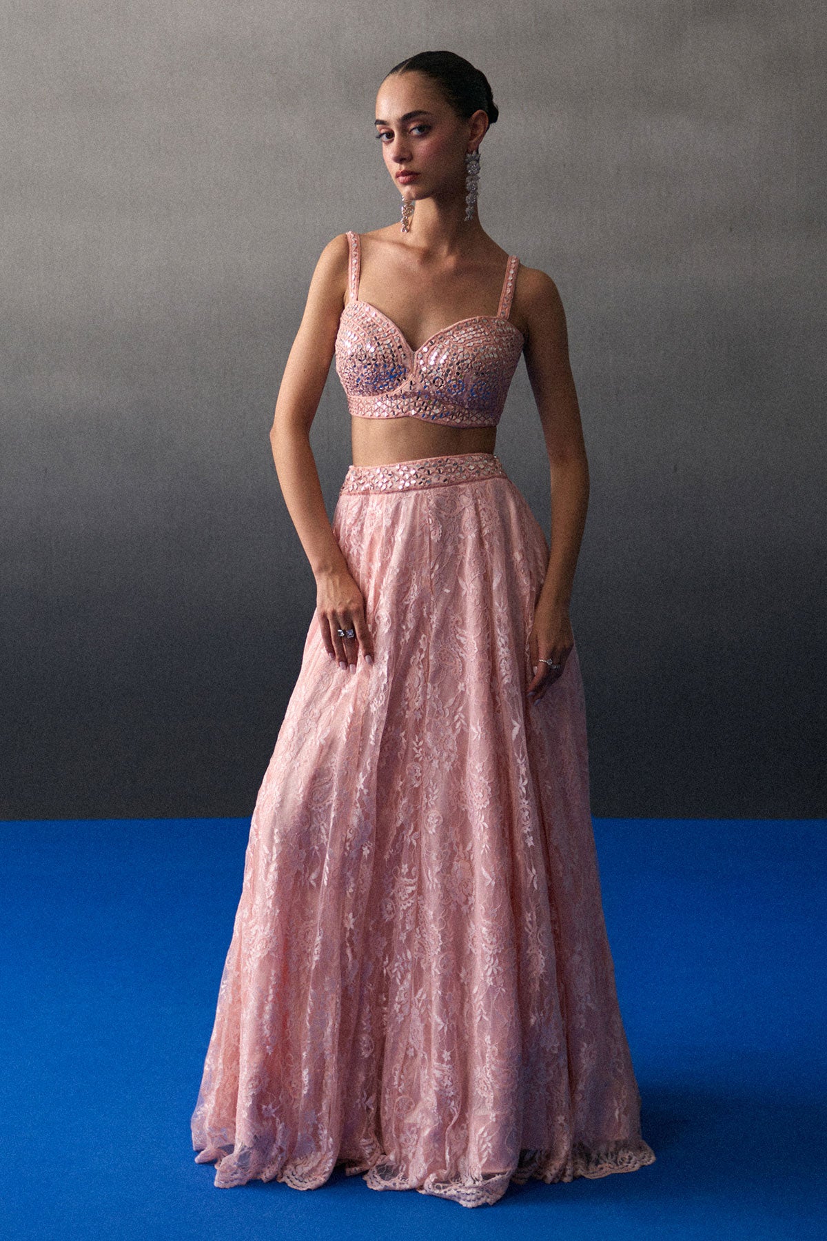 A Peach Lehenga Set Crafted In Chantilly Paired With A Mirror Work Blouse And Dupatta.