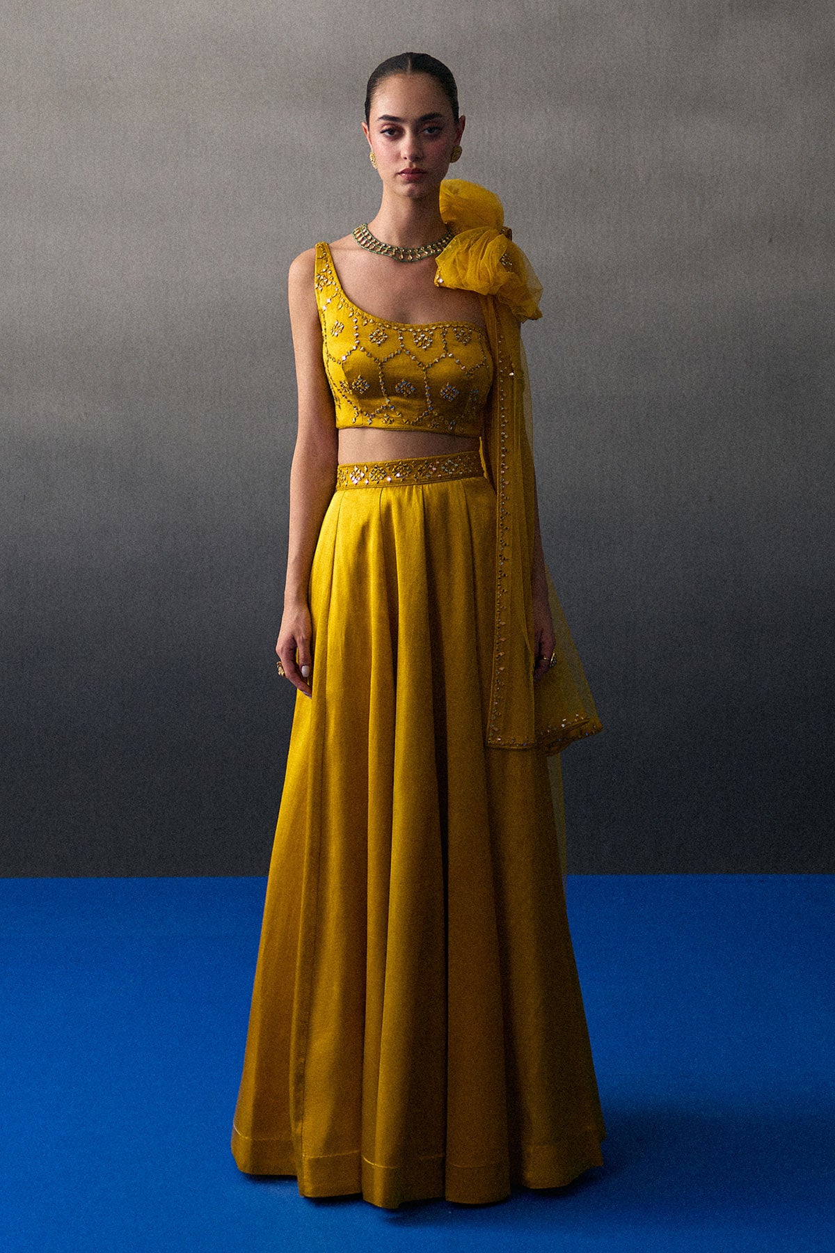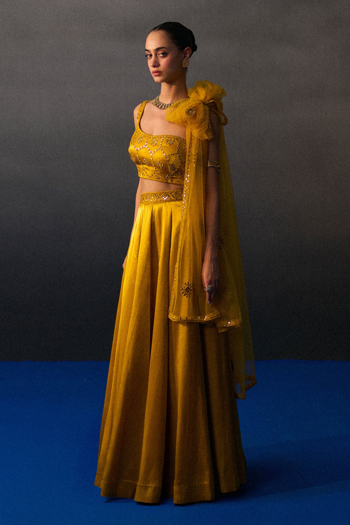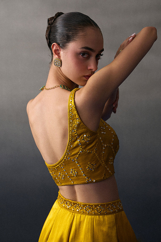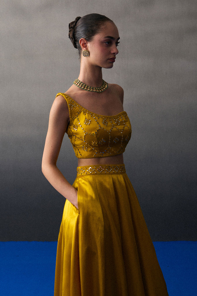 A Mustard Lehenga Set Crafted In Satin Silk Paired With A Tonal Mirror Work Blouse And Dupatta.