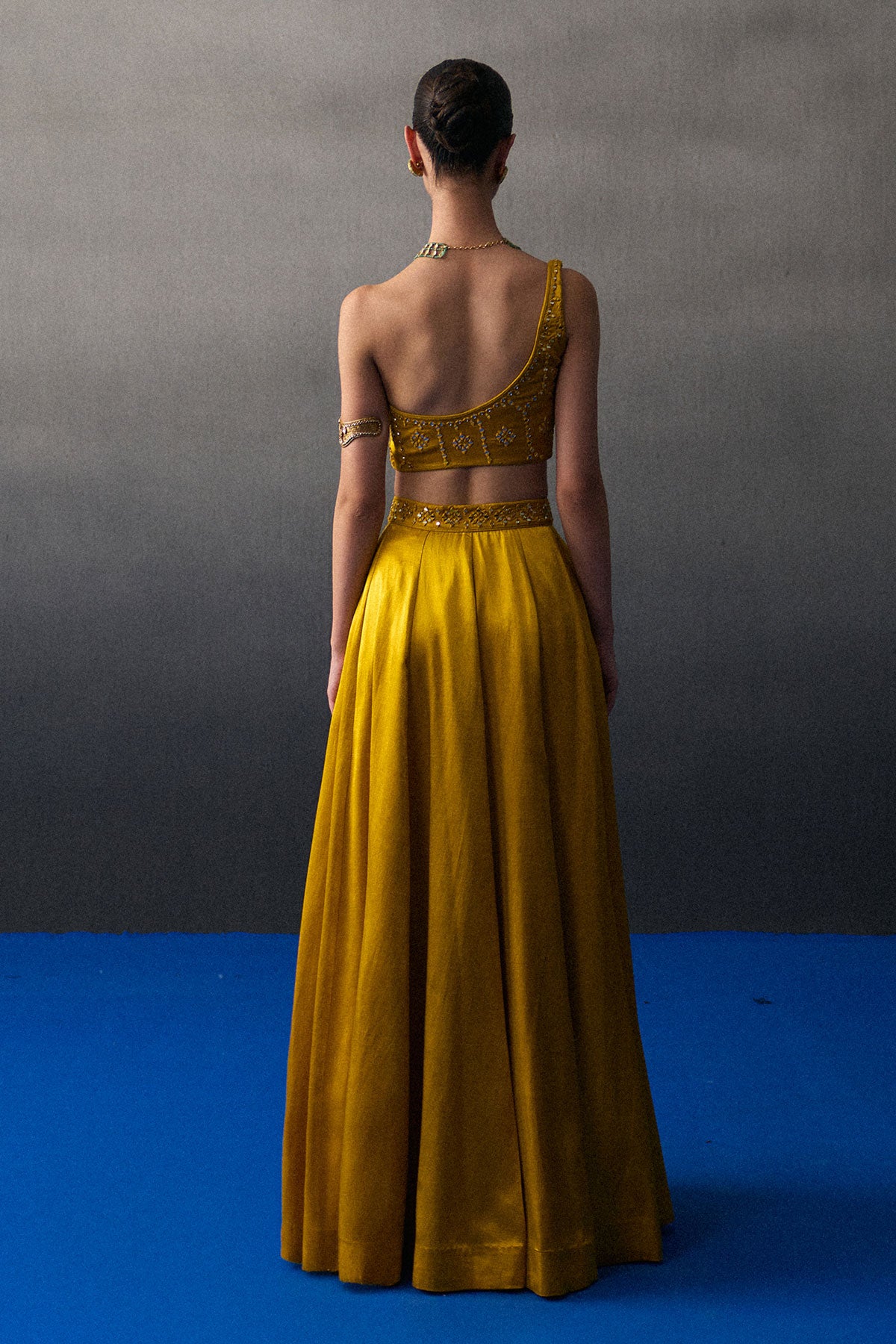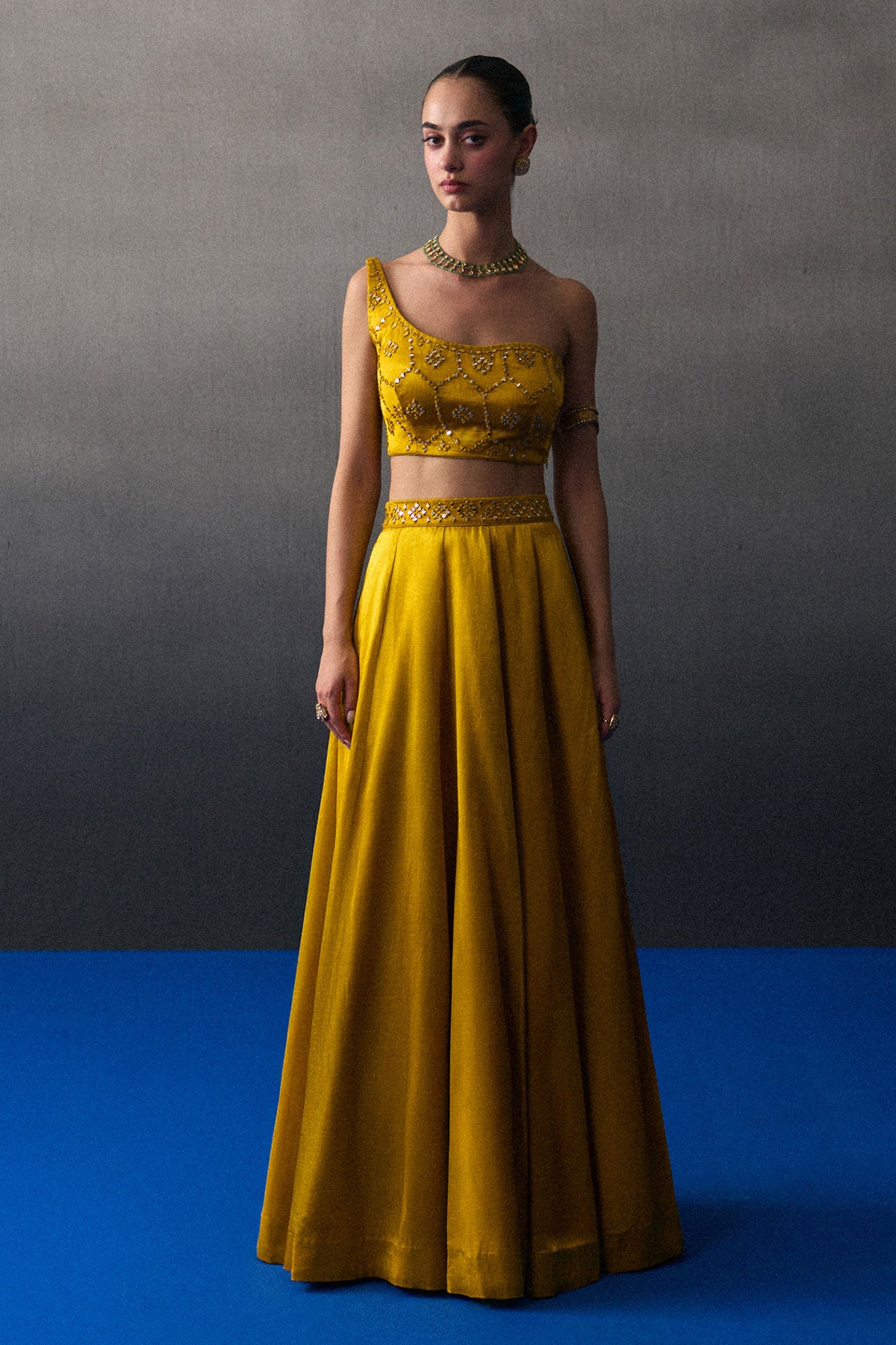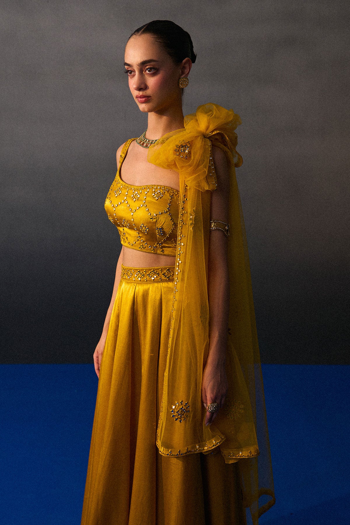 A Mustard Lehenga Set Crafted In Satin Silk Paired With A Tonal Mirror Work Blouse And Dupatta.