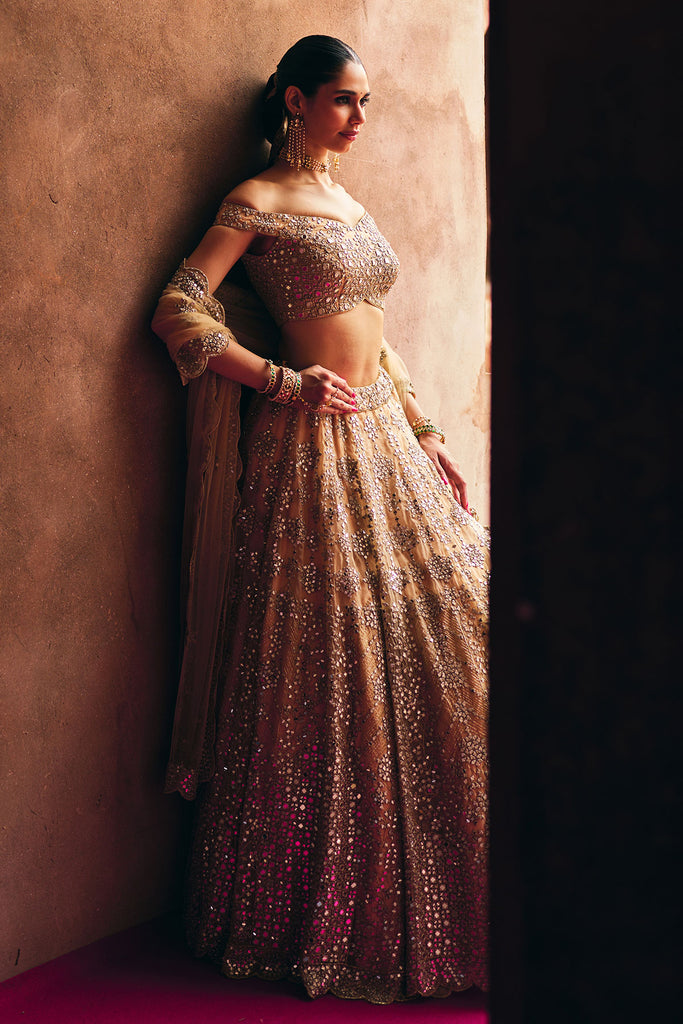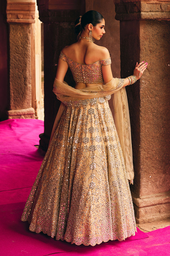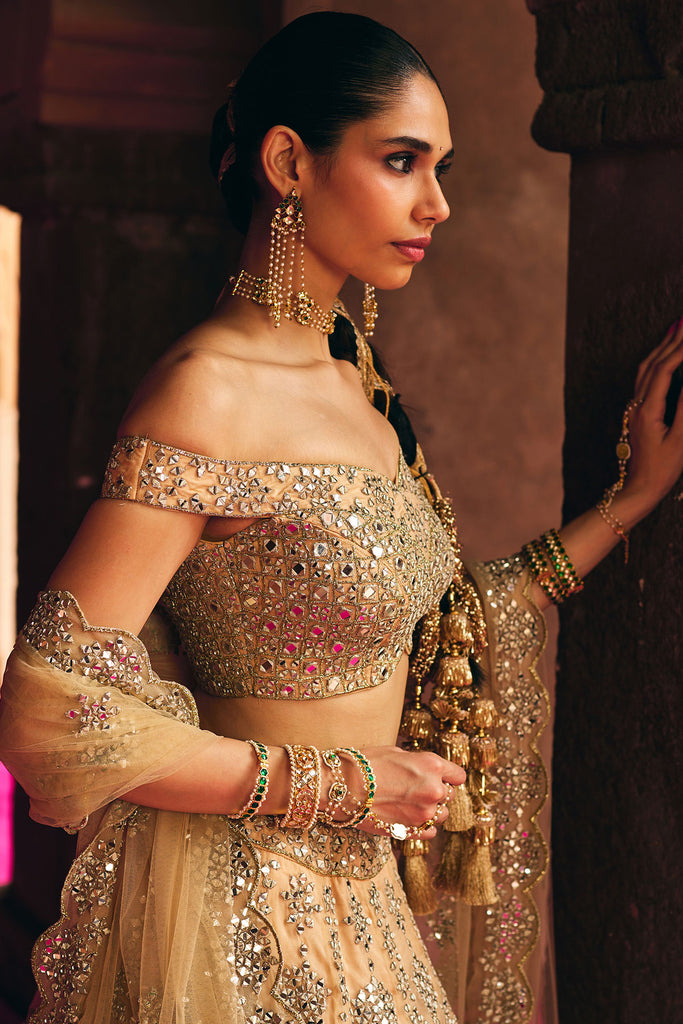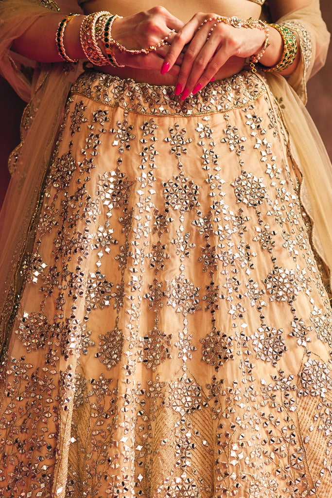 A champagne gold lehenga drenched in intricate mirror embroidery, finished with scalloped detailing for a truly regal bridal glow