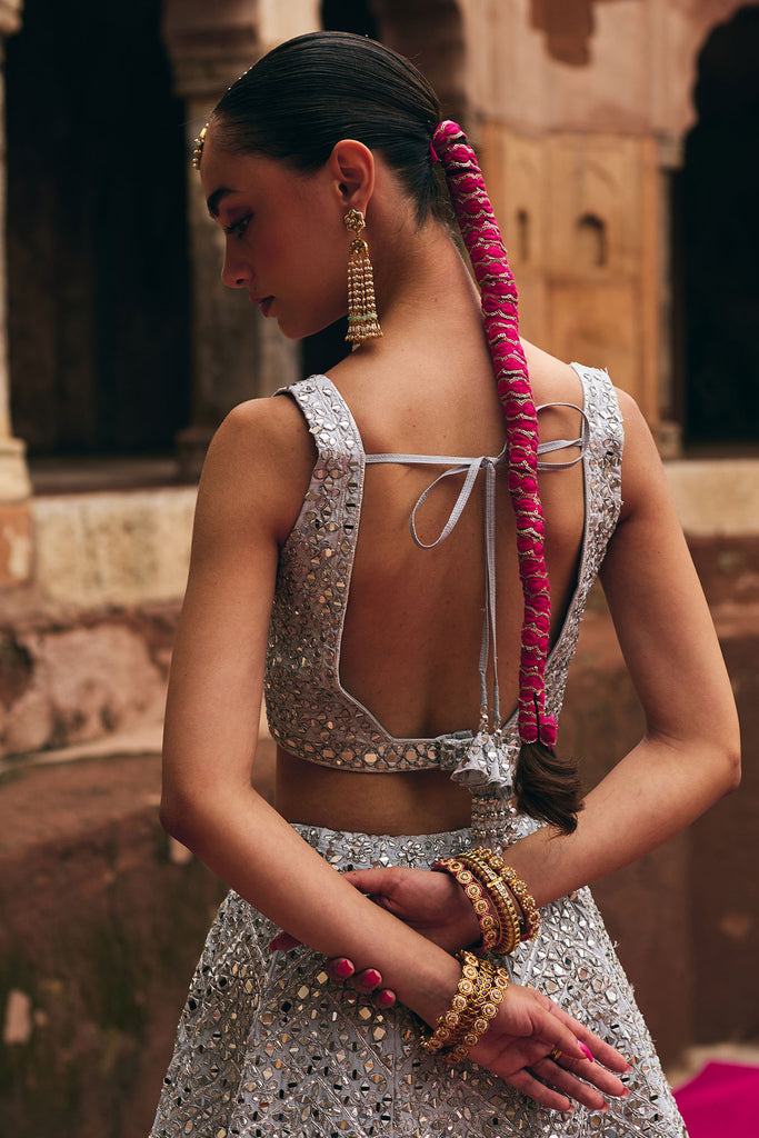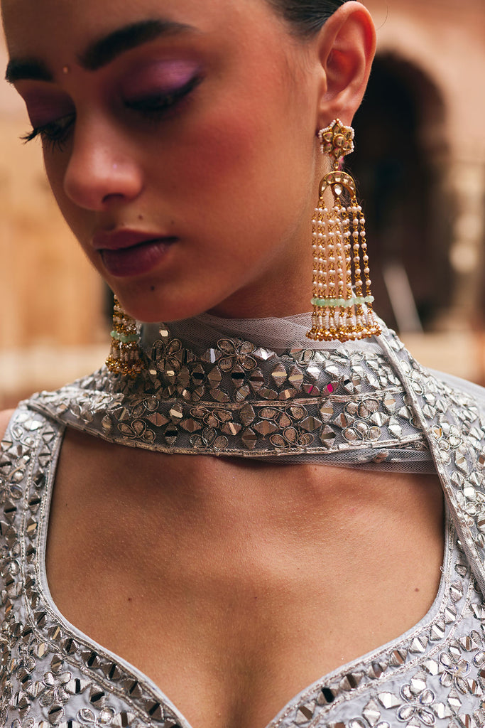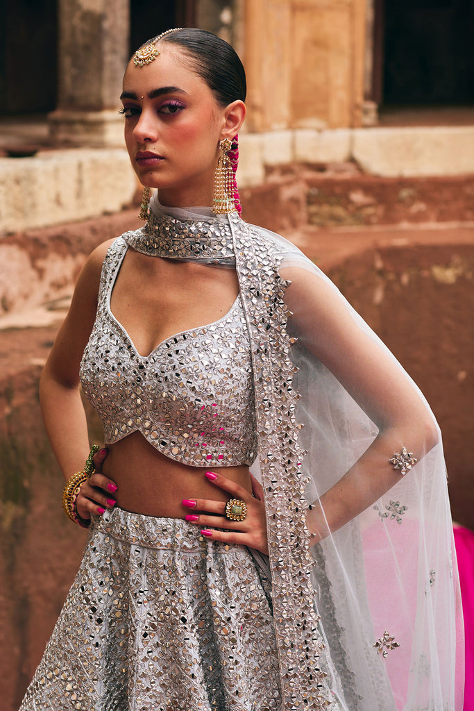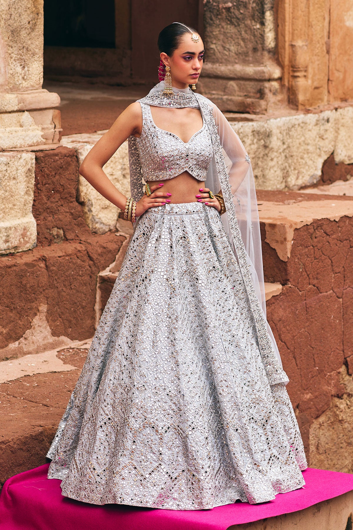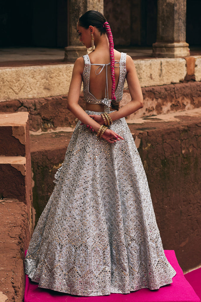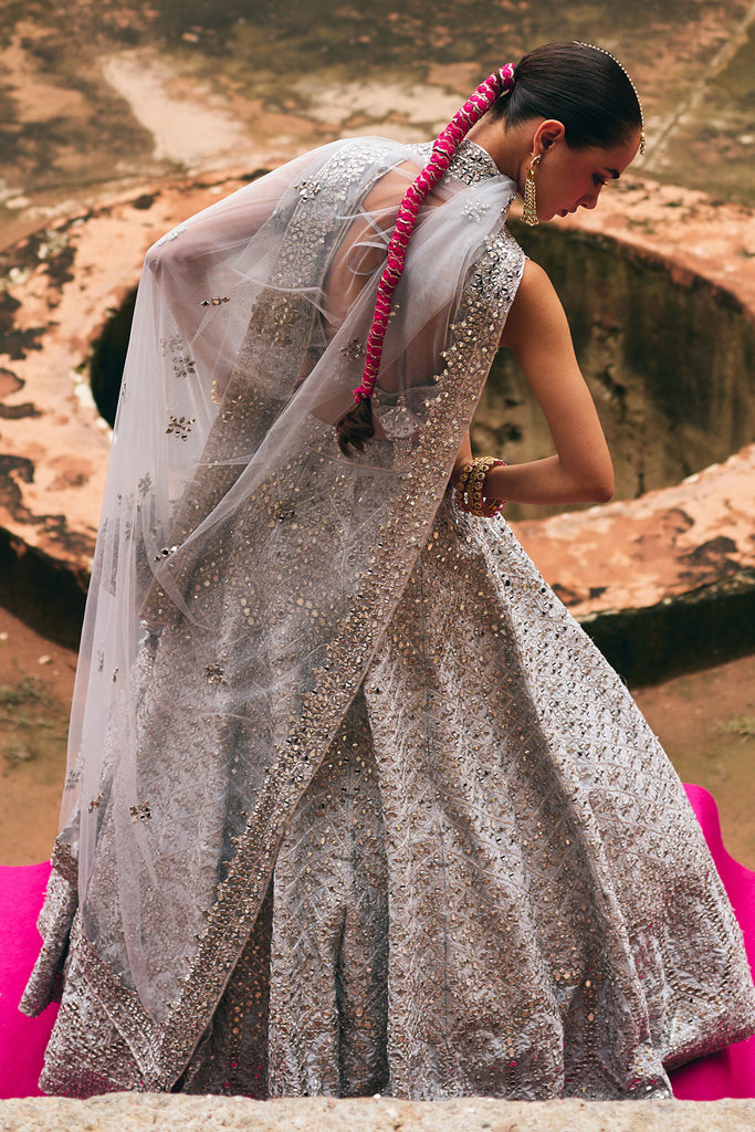 Grey lehenga covered in geometric silver mirror embroidery, elevated with zari and gota work for a celestial brilliance.