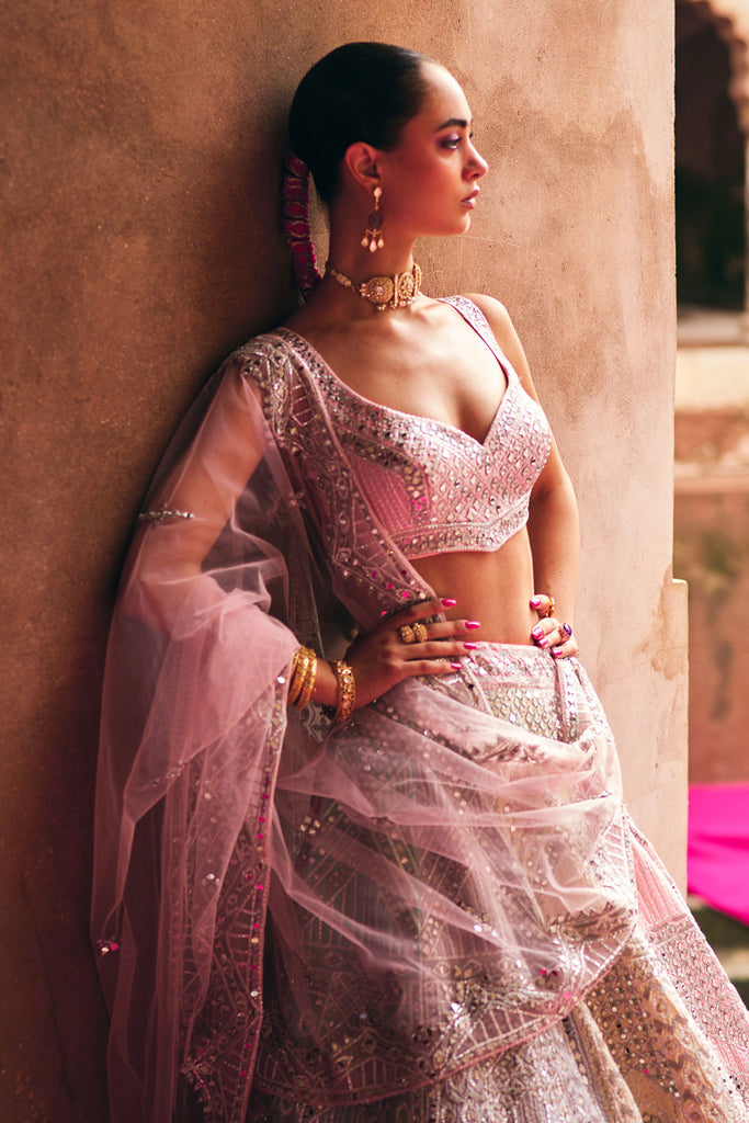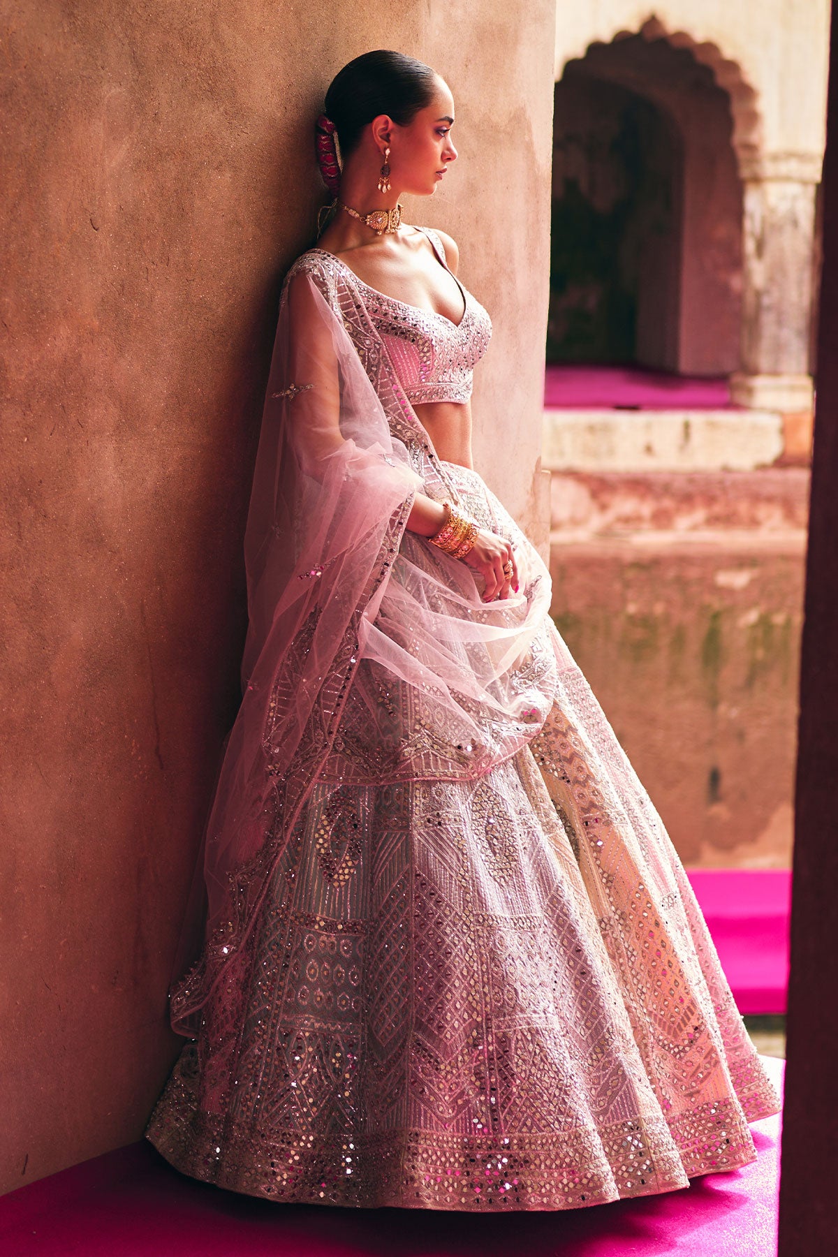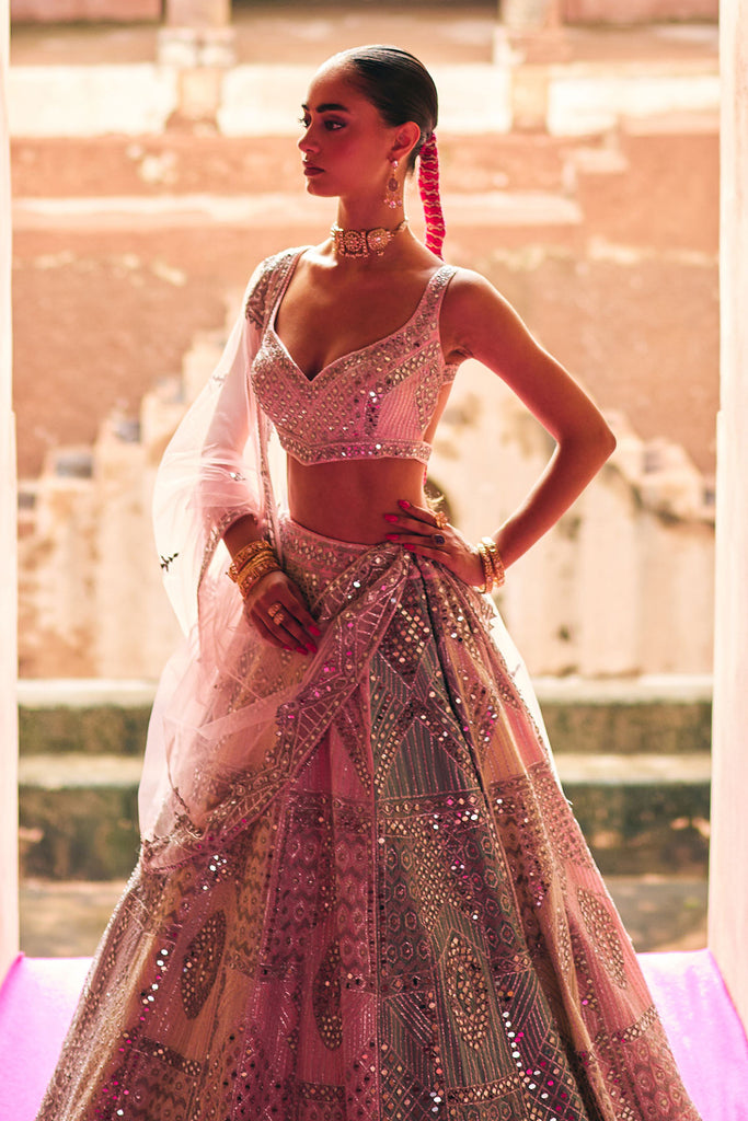 Multicolor lehenga with patchwork mirror embroidery, finished with zari and gota accents.
