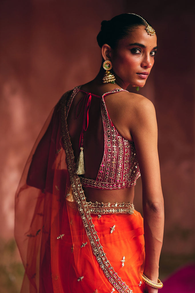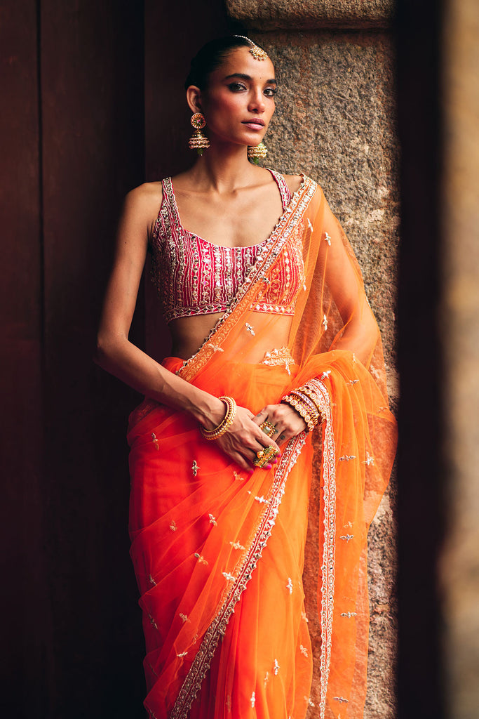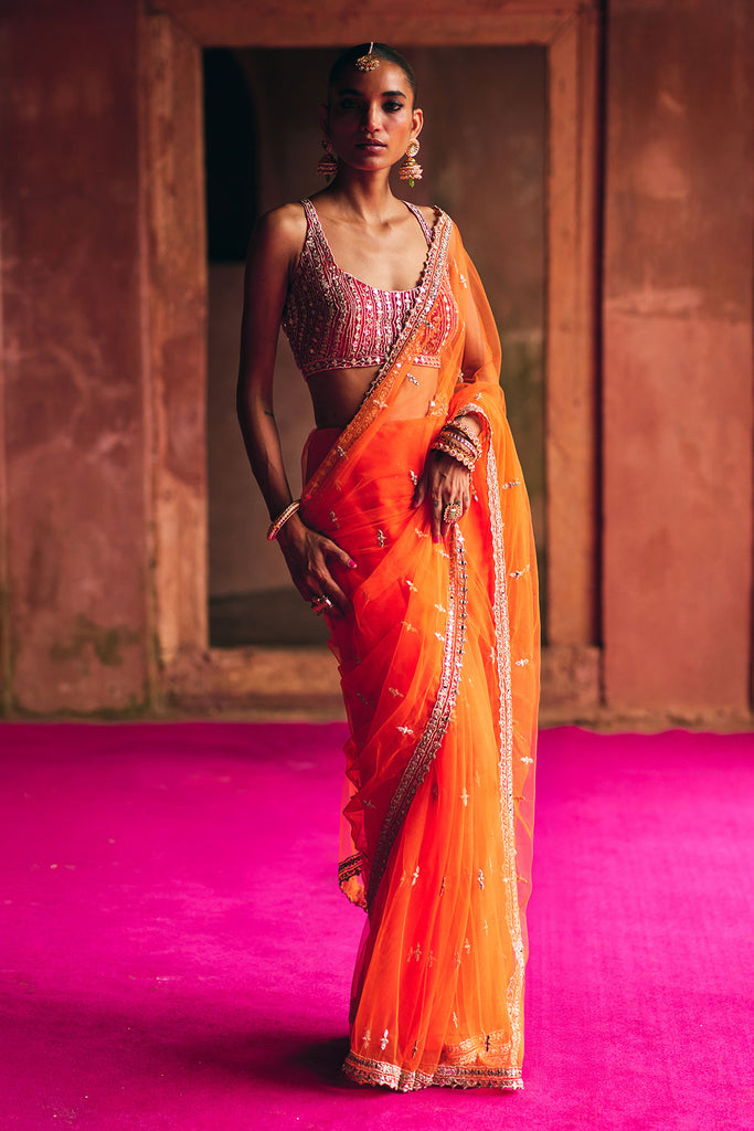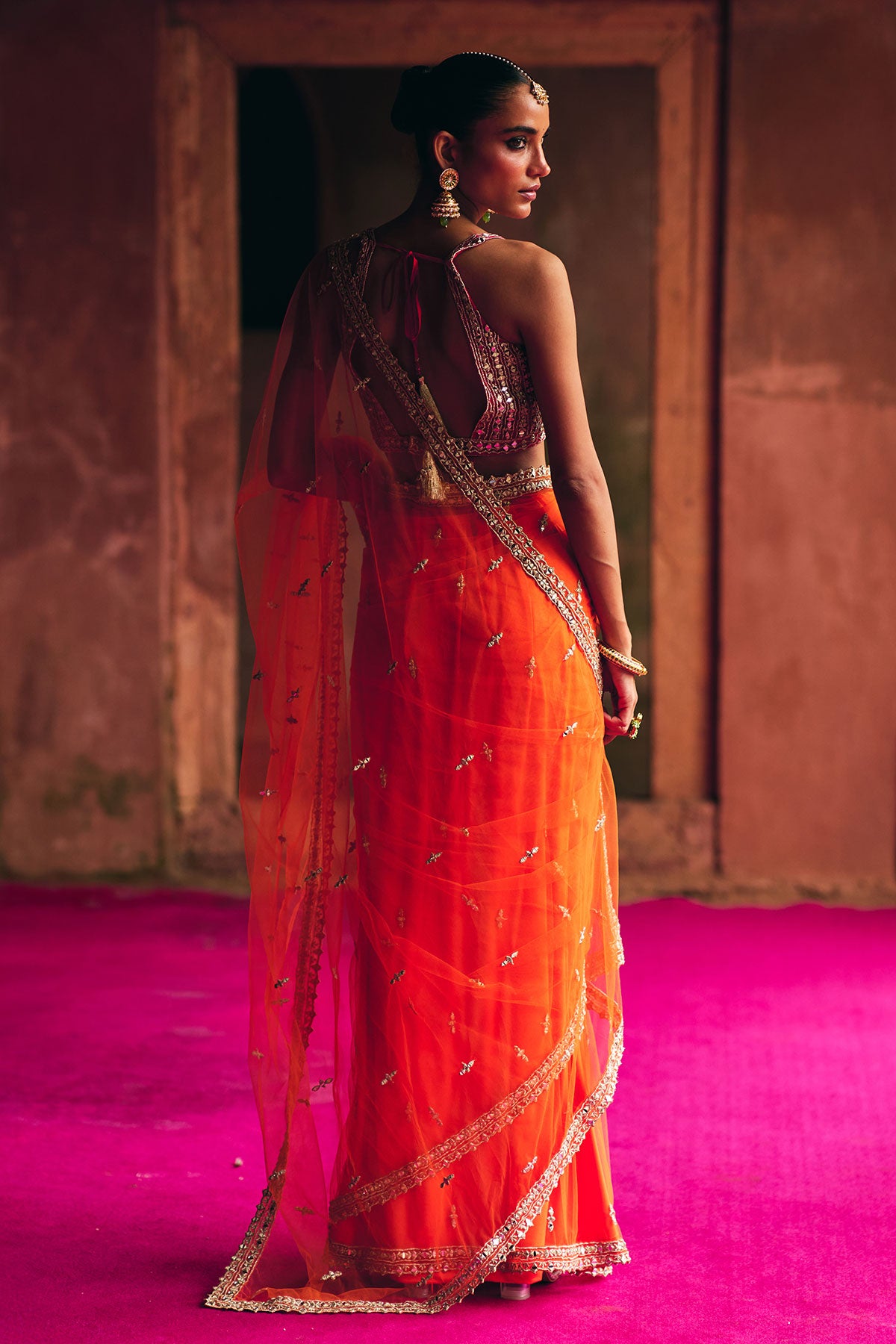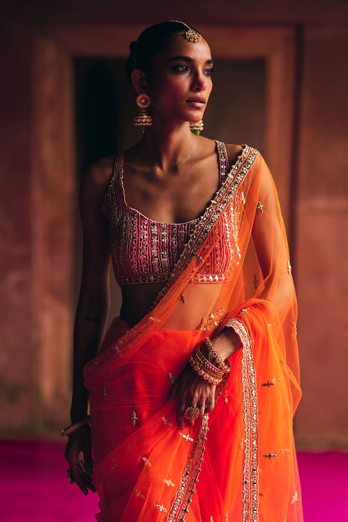 Bright orange saree with mirror border and a red blouse, bold and festive.