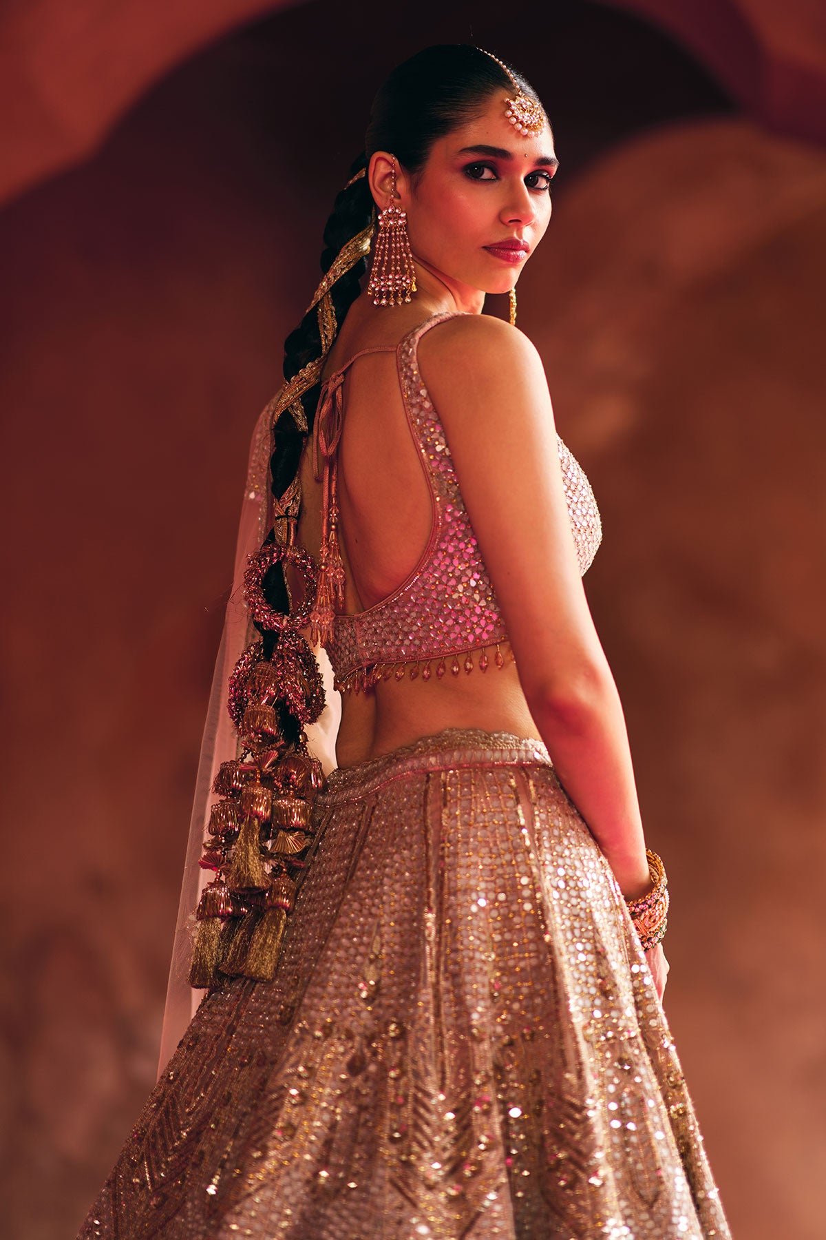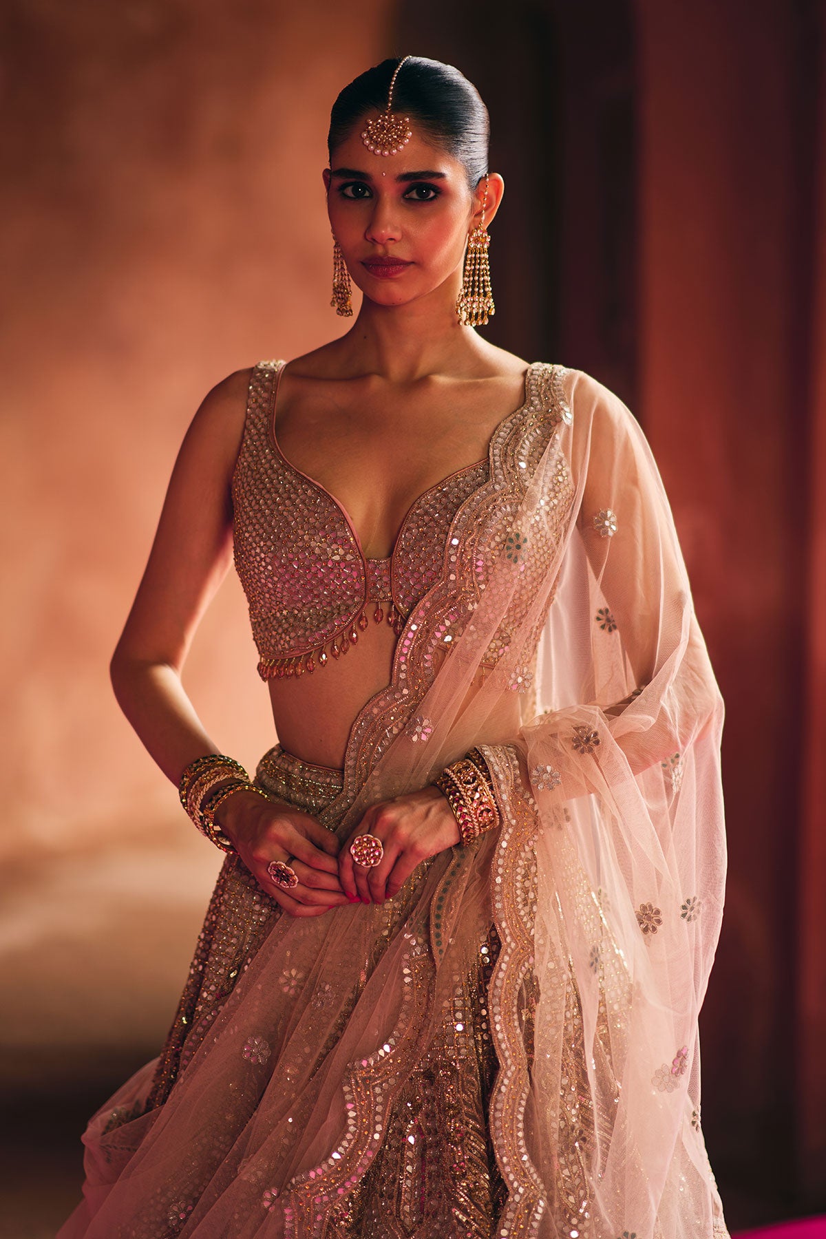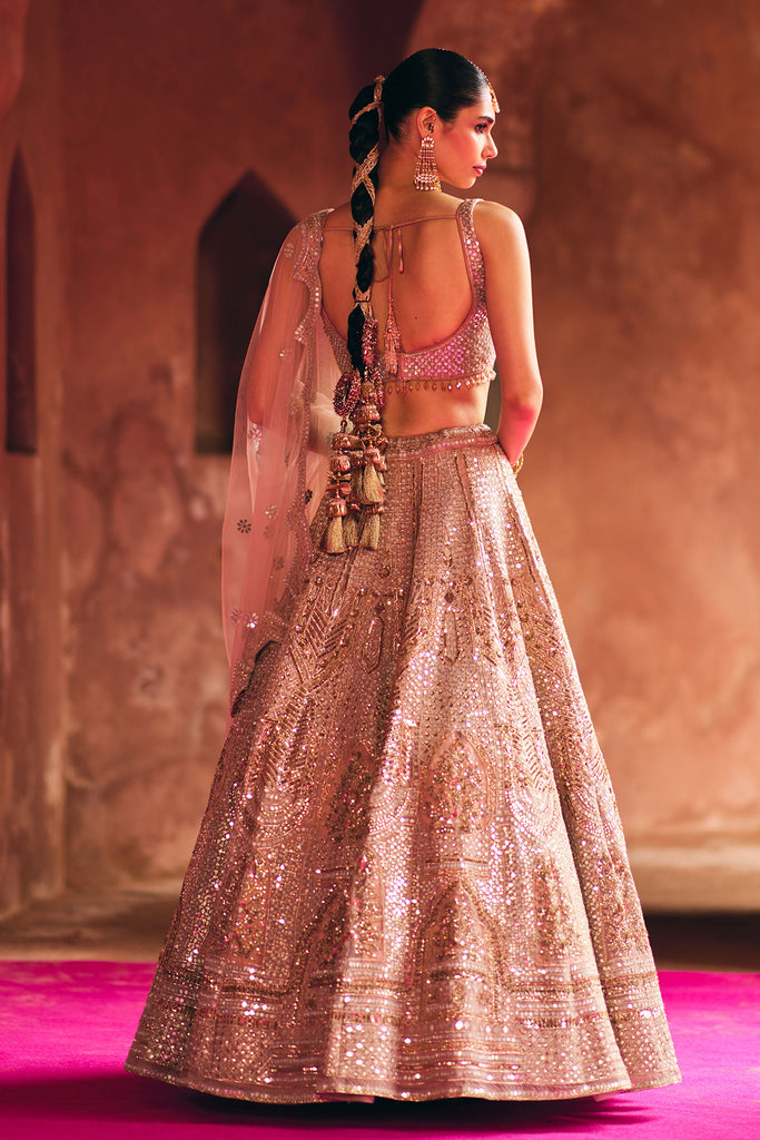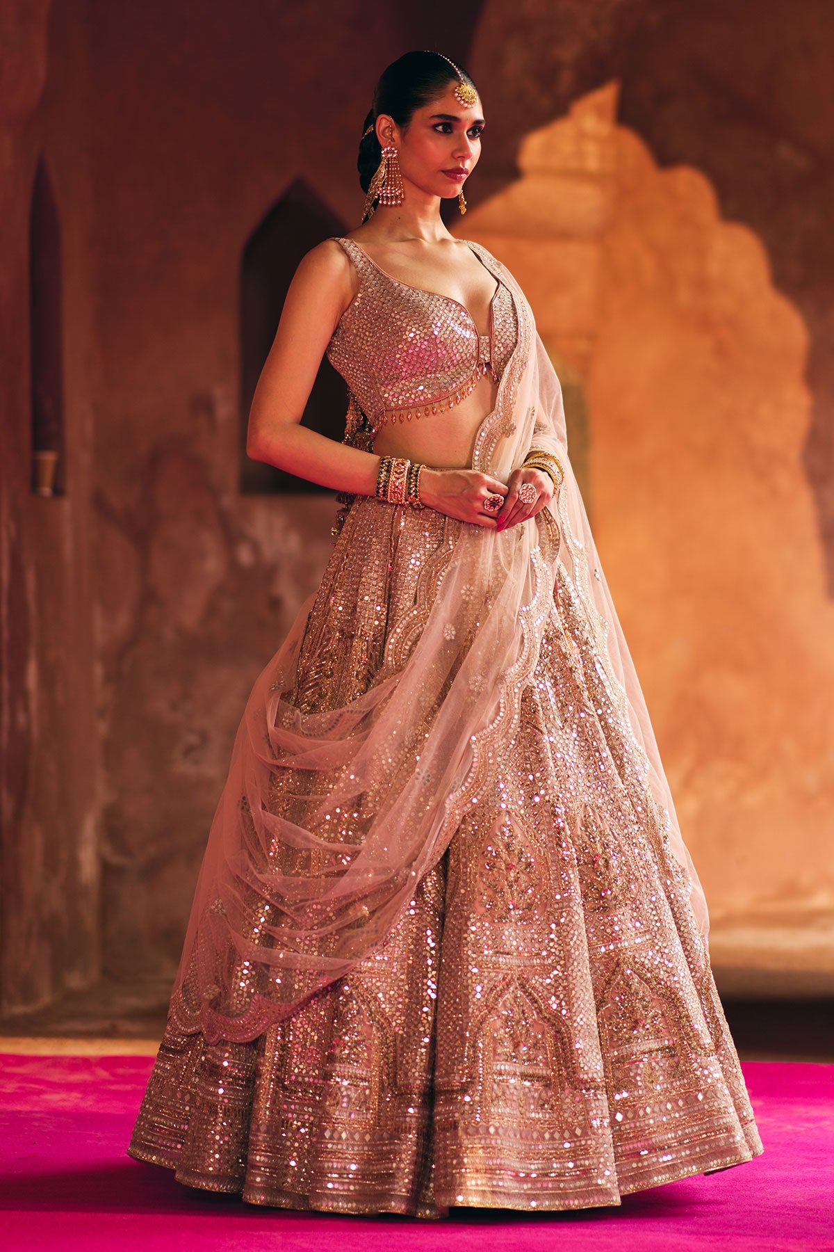 Nude Peach lehenga drenched in dense mirror embroidery, with zari and gota highlights in temple-inspired motifs.