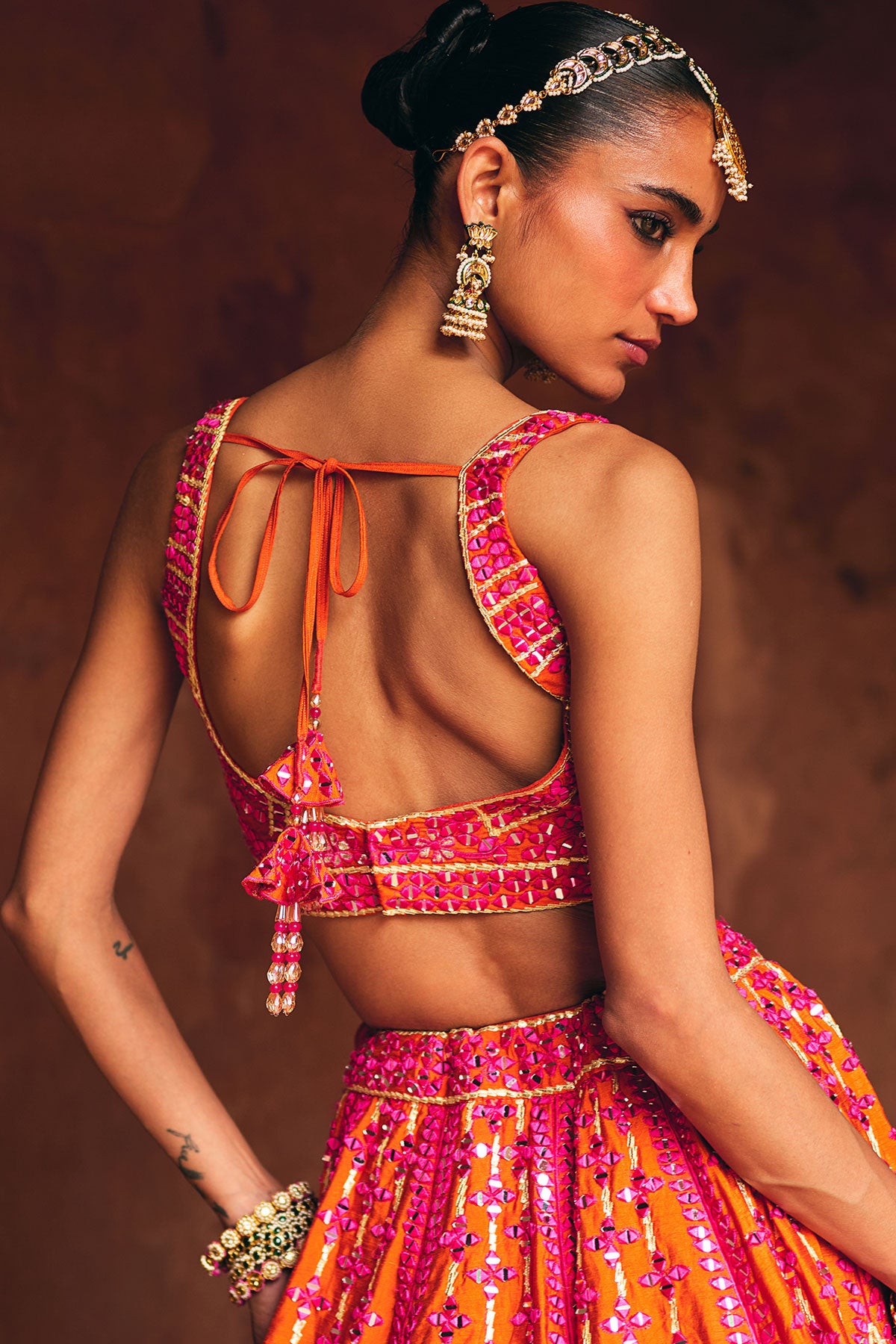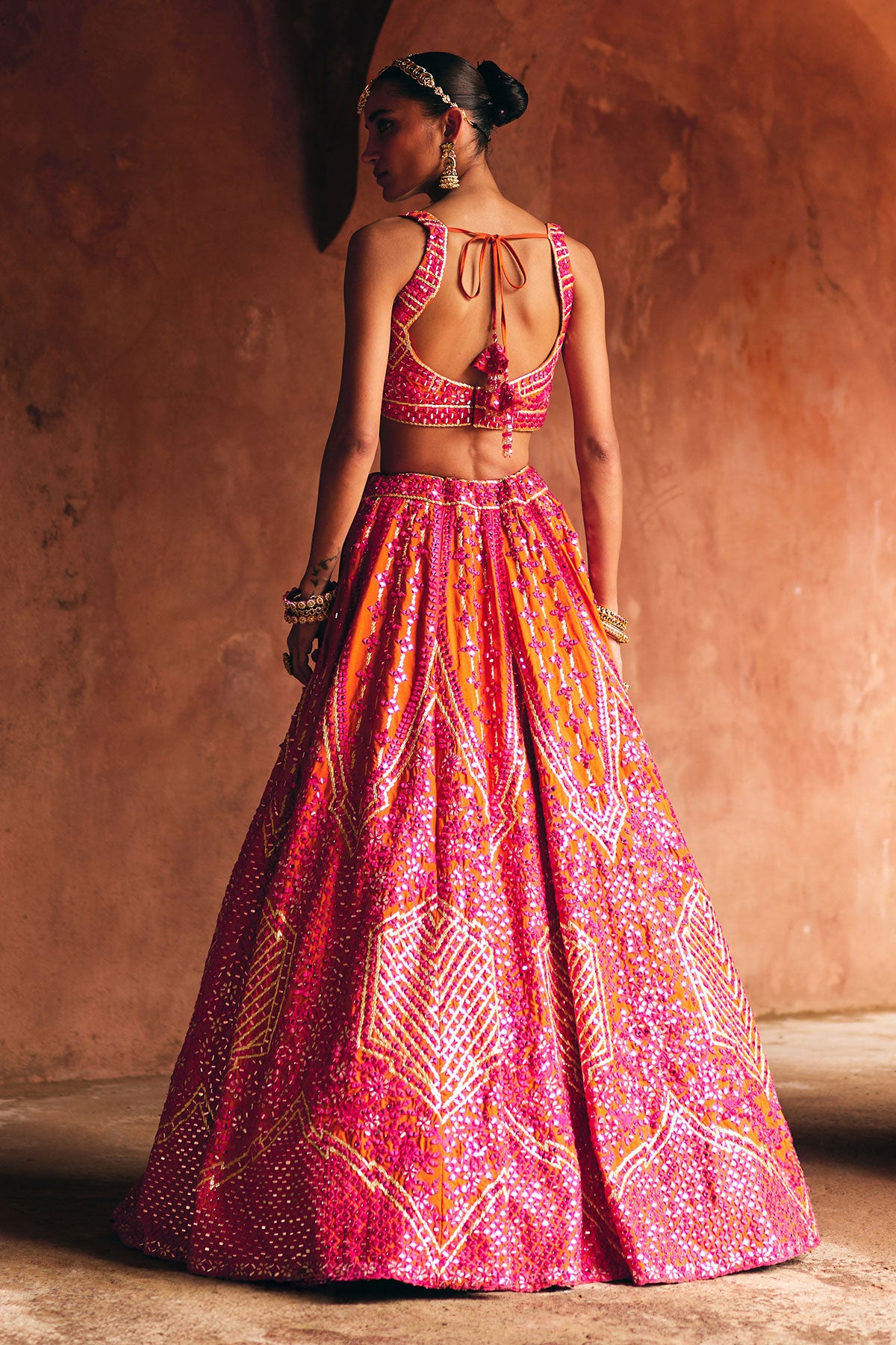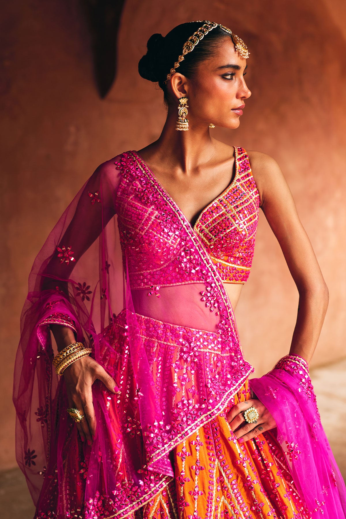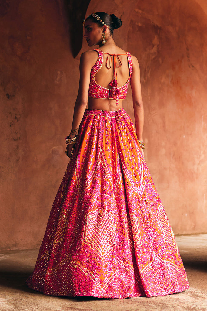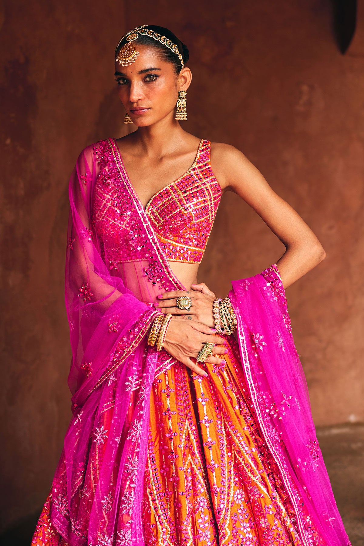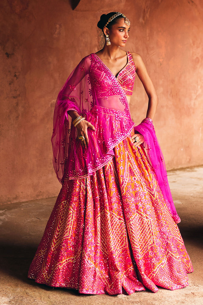 A fiery fusion of rani pink and rust, adorned with bold mirror and threadwork embroidery for the modern statement bride.