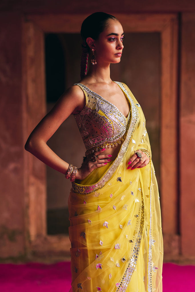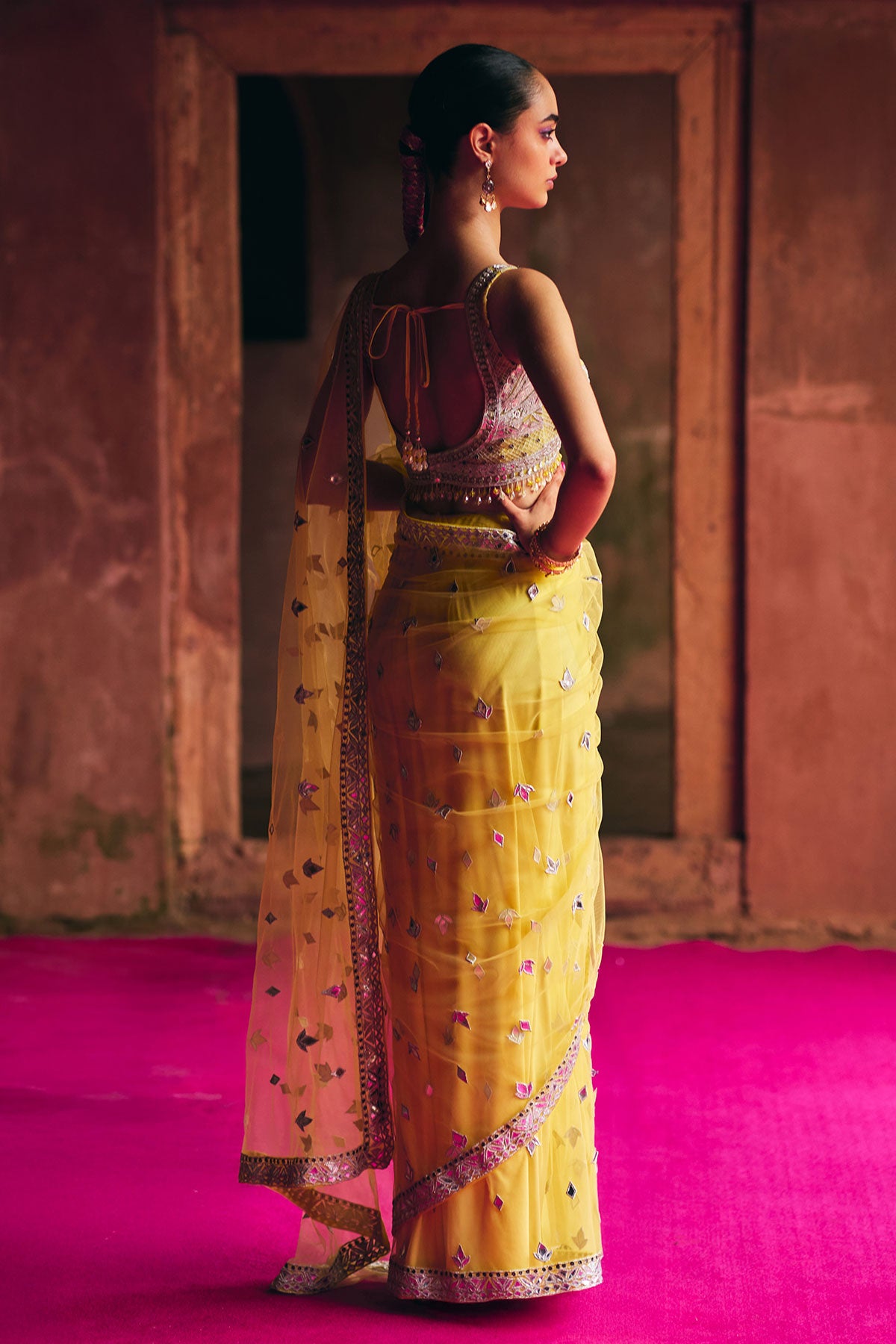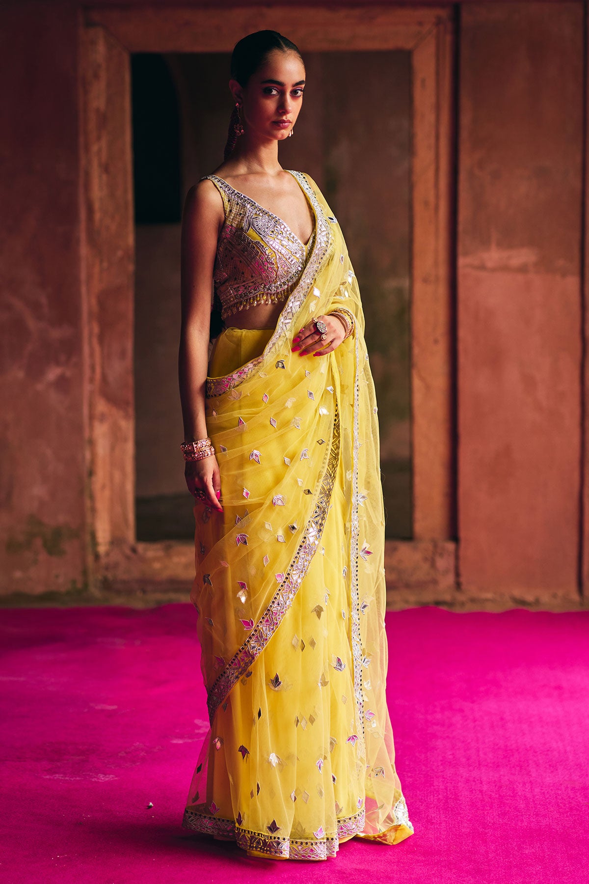Sunshine yellow saree with scattered mirror embroidery and silver gota border, paired with a mirror blouse.