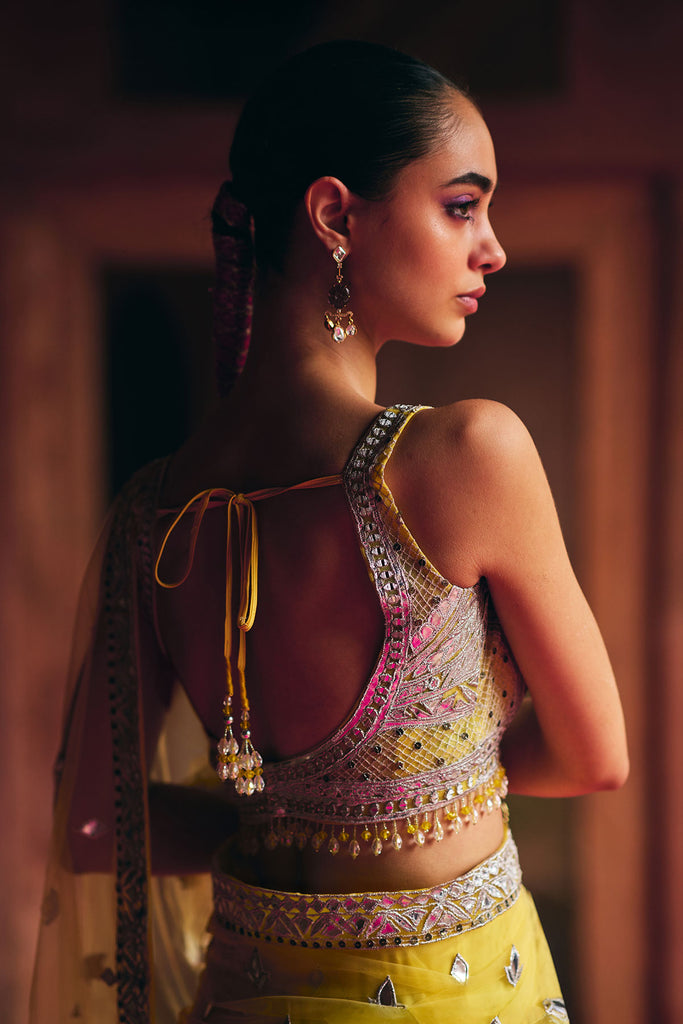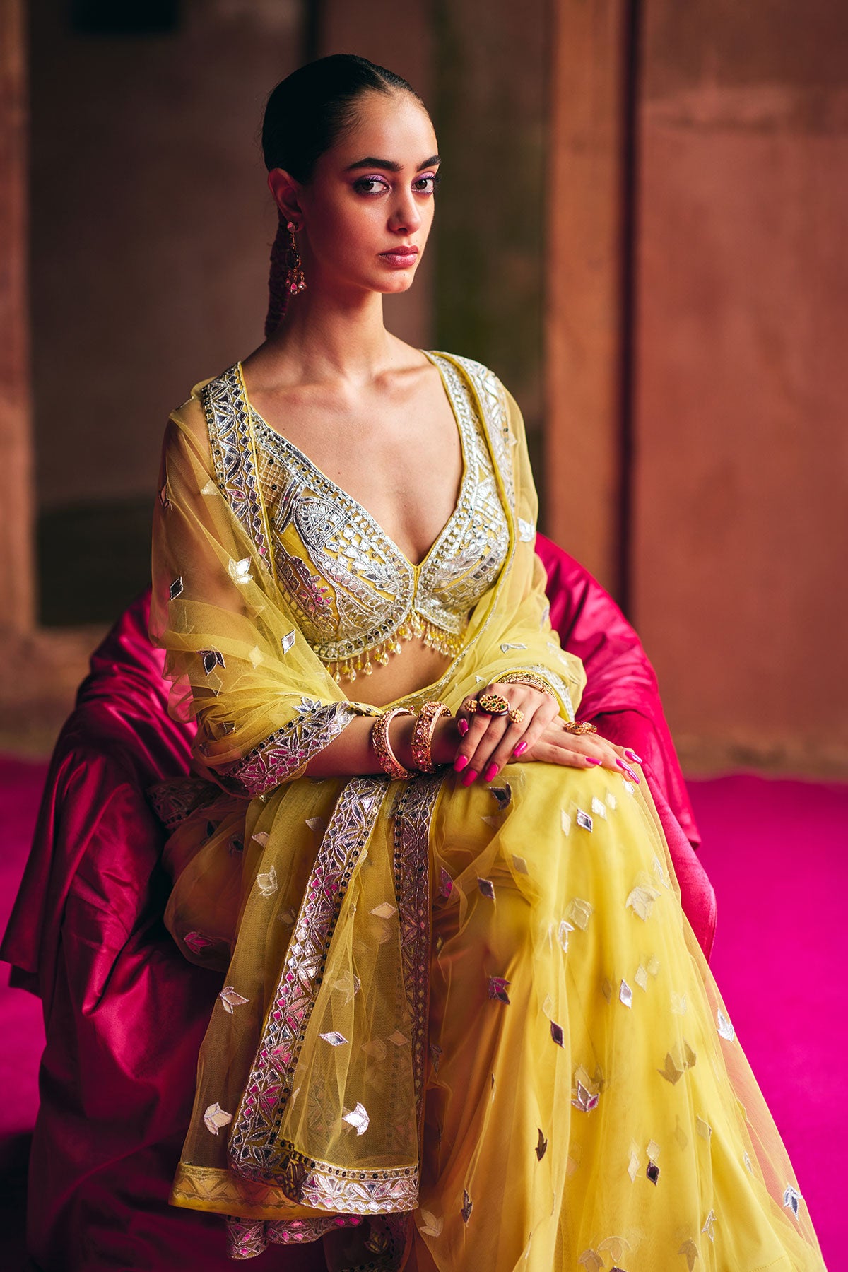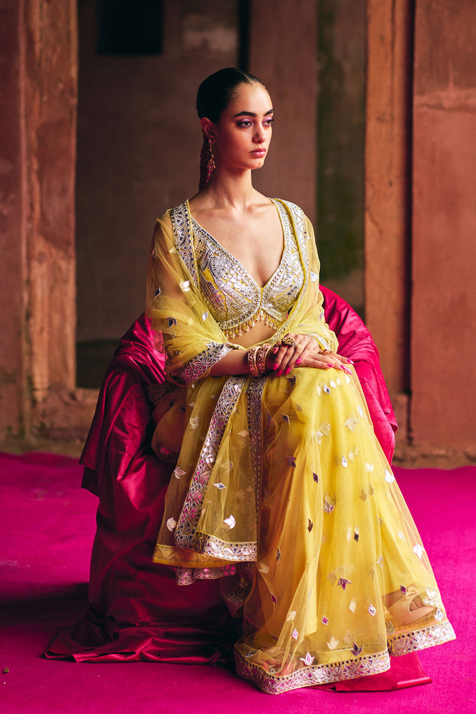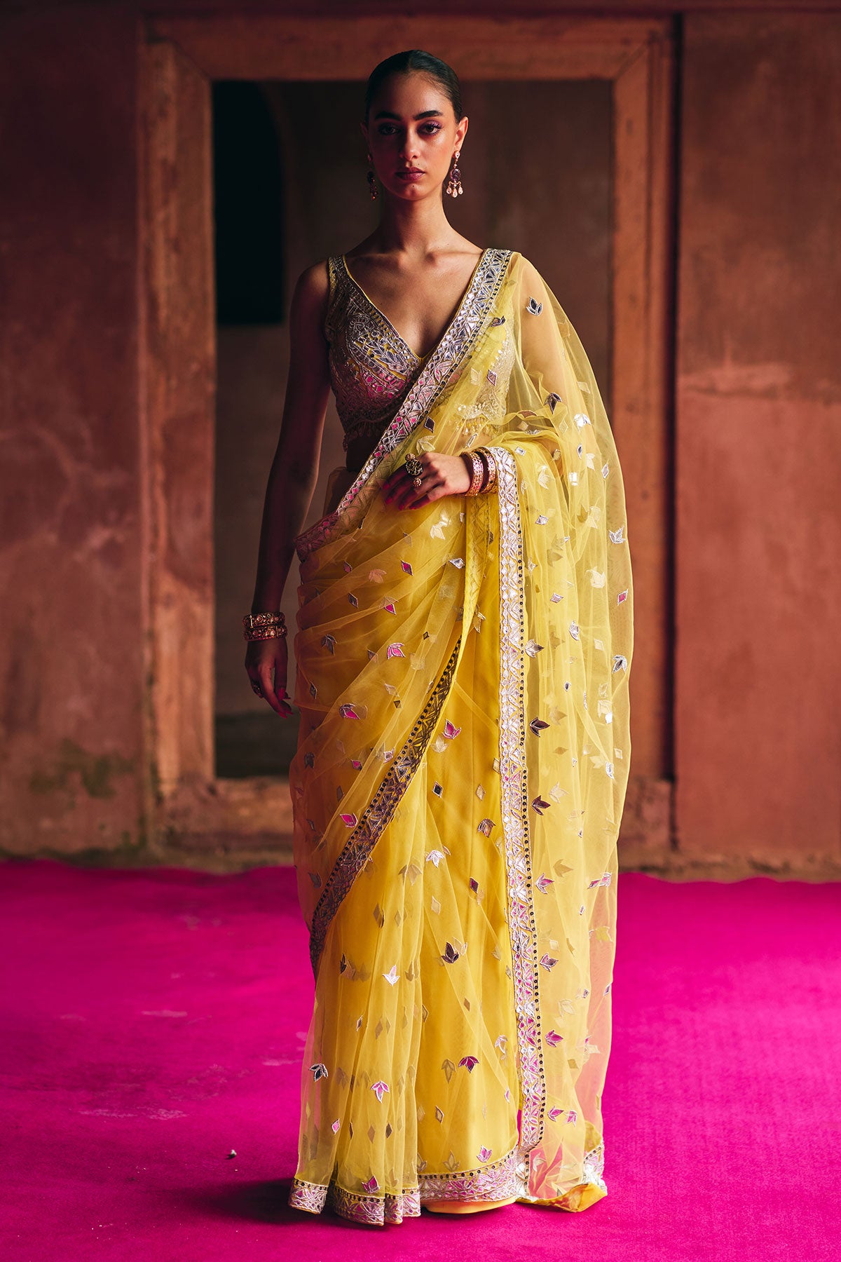 Sunshine yellow saree with scattered mirror embroidery and silver gota border, paired with a mirror blouse.