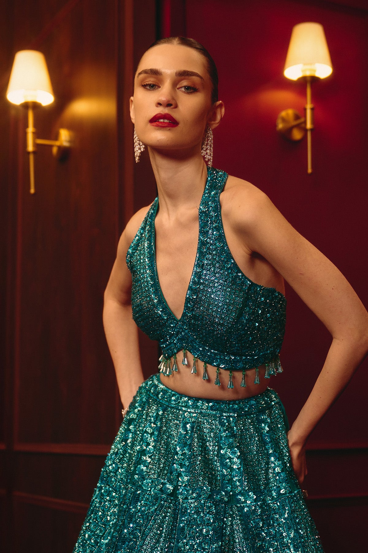 This Lehenga Set Features Intricate Embroidery In Cerulean Green Tones On A Net Base.It Is Paired With A Matching Blouse And An Embroidered Dupatta With Tassel Accents.