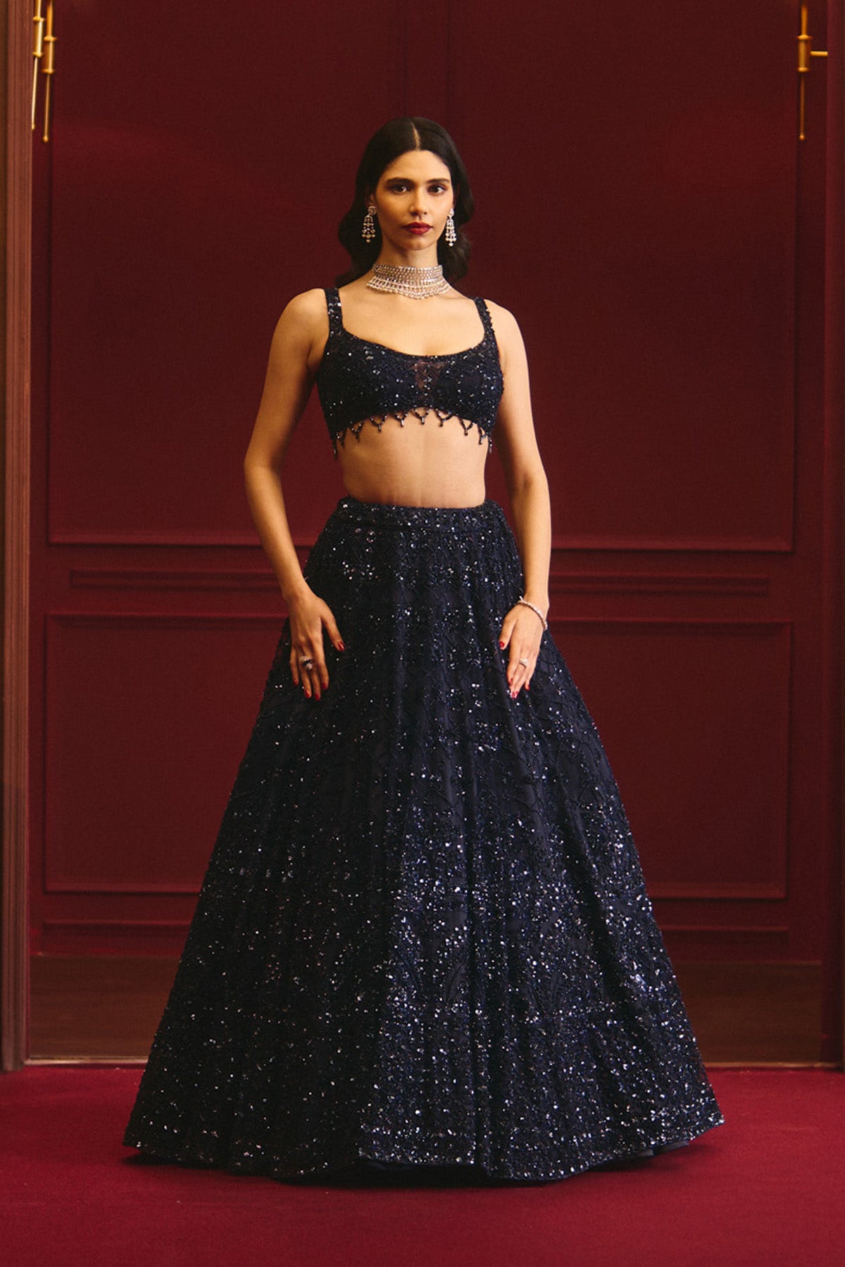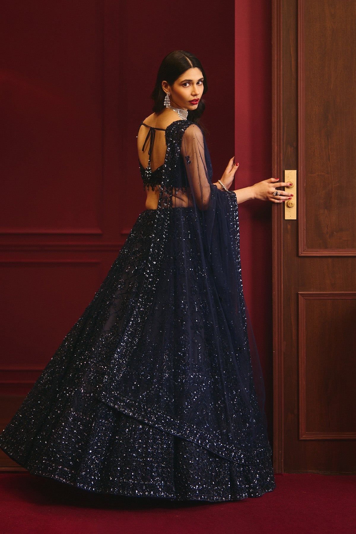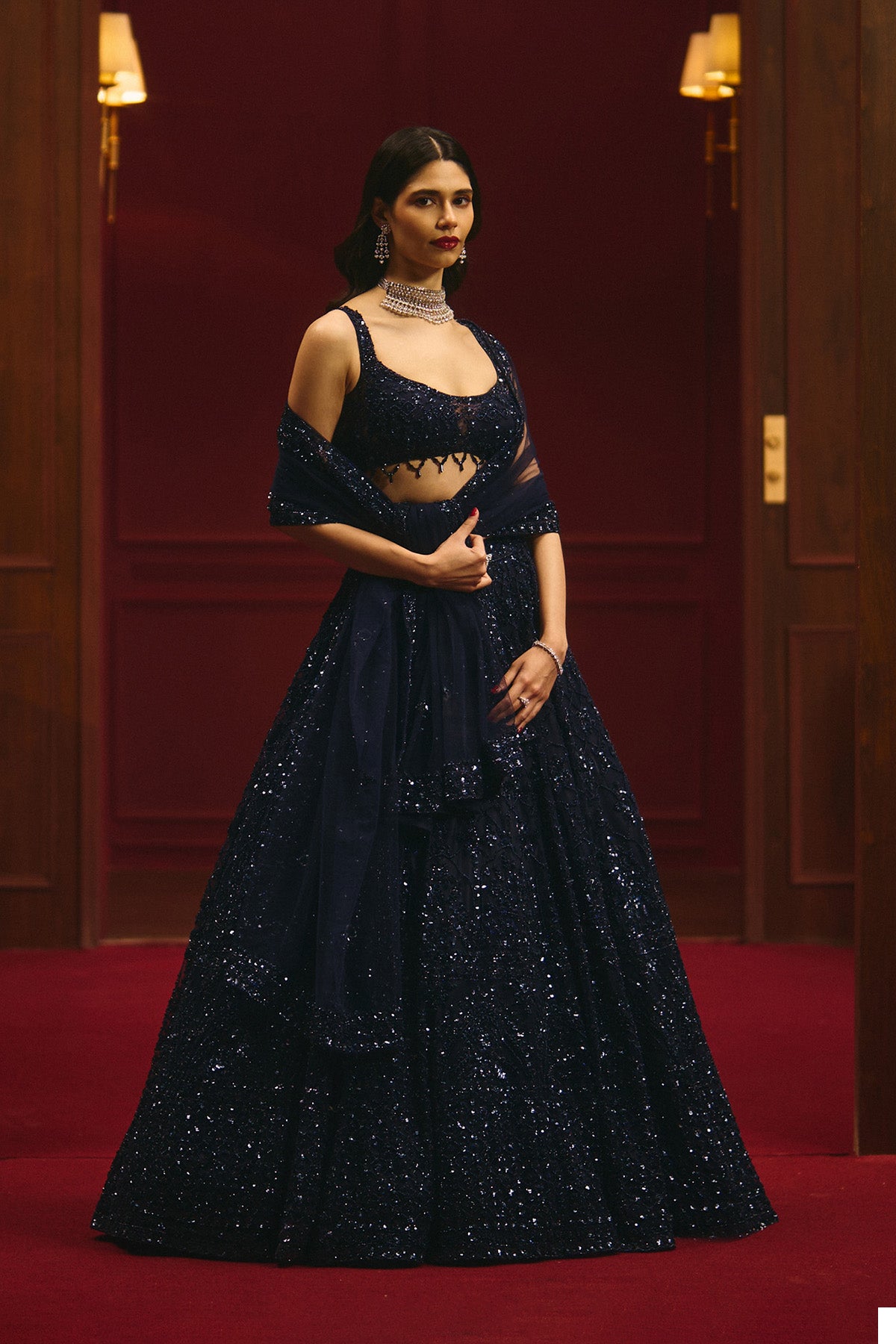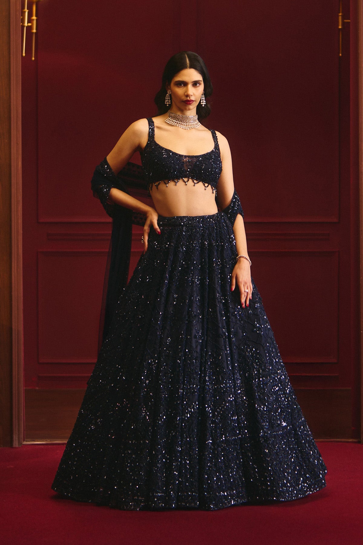 This Lehenga Set Features Tonal Embroidery In Midnight Blue On A Fluid Net Base. It Is Styled With A Fitted Blouse And An Embroidered Net Dupatta With Subtle Tassel Accents.
