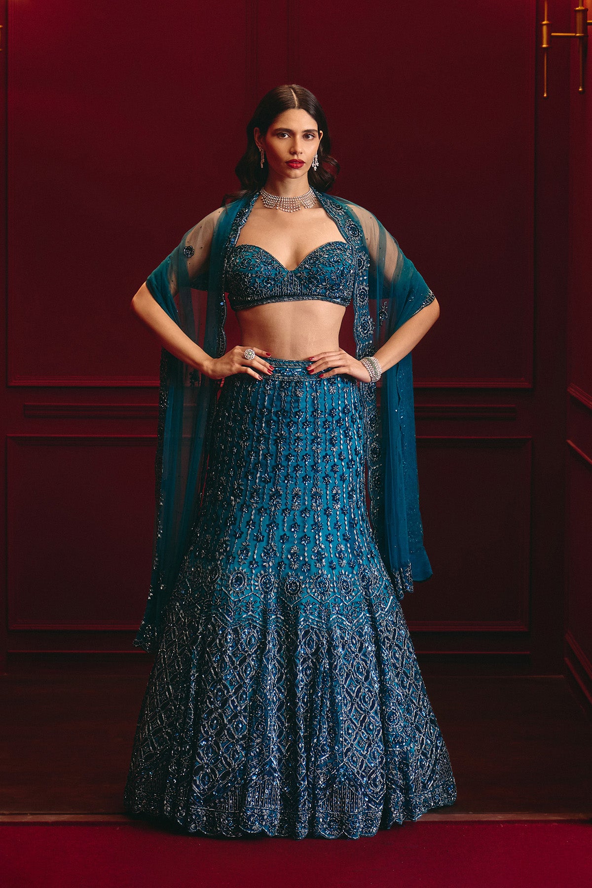 This Lehenga Set Features Rich Embroidery In Peacock Blue Tones On A Structured Net Base. The Blouse Is Paired With An Embroidered Net Dupatta Finished With Tassels.