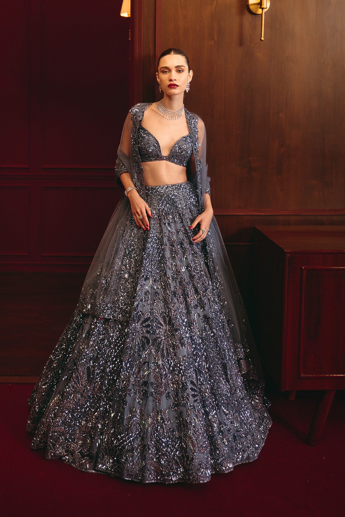 This Lehenga Set Features Intricate Embroidery In Pewter Grey Tones On A Soft Net Base. This Lehenga Set Features Intricate Embroidery In Pewter Grey Tones On A Soft Net Base.