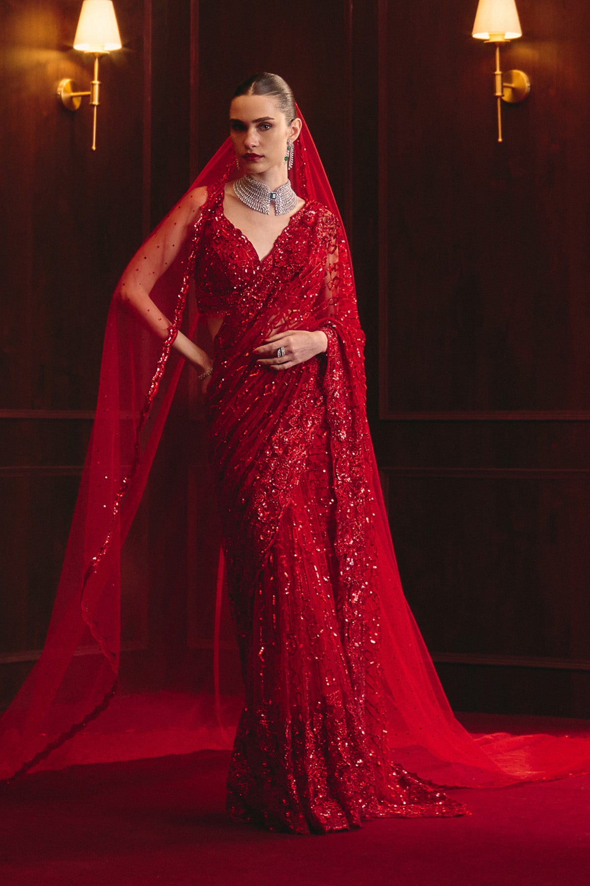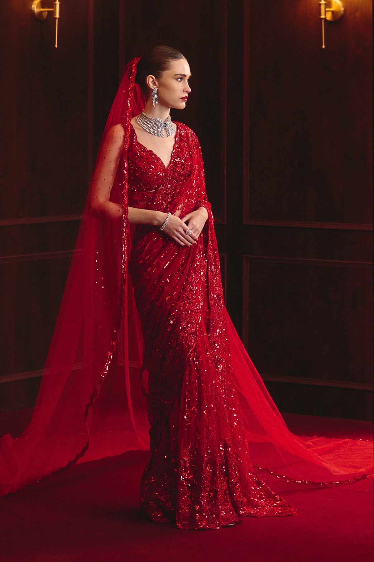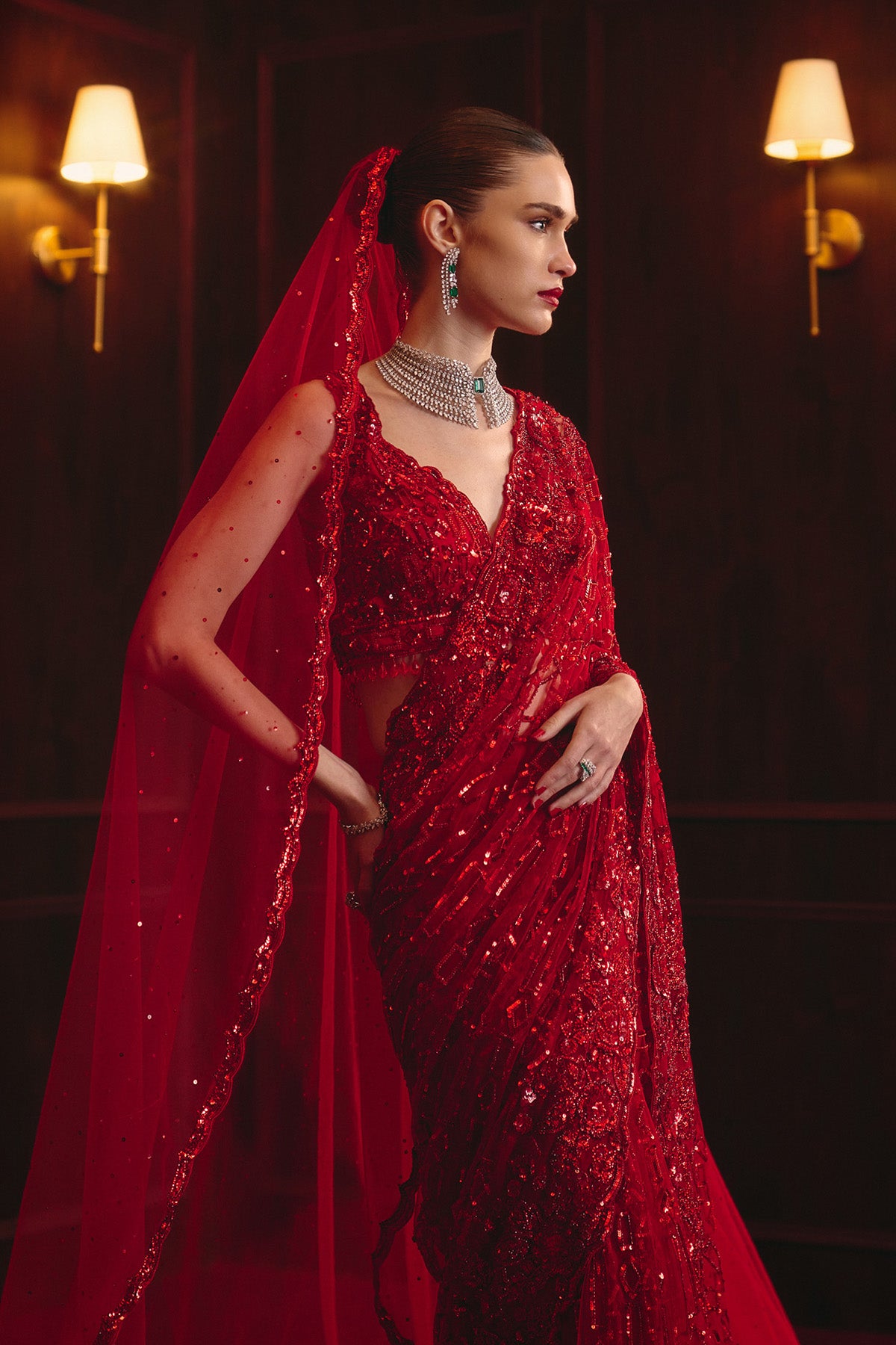 This Saree Set Features Intricate Embroidery In Red Tones On A Soft Net Base. It Is Paired With A Coordinated Blouse And An Additional Embroidered Veil Dupatta.