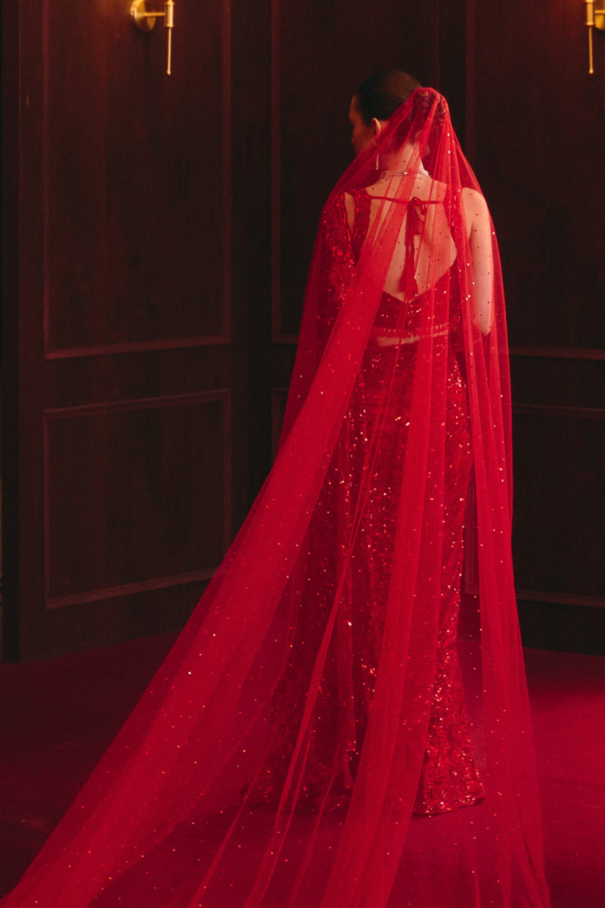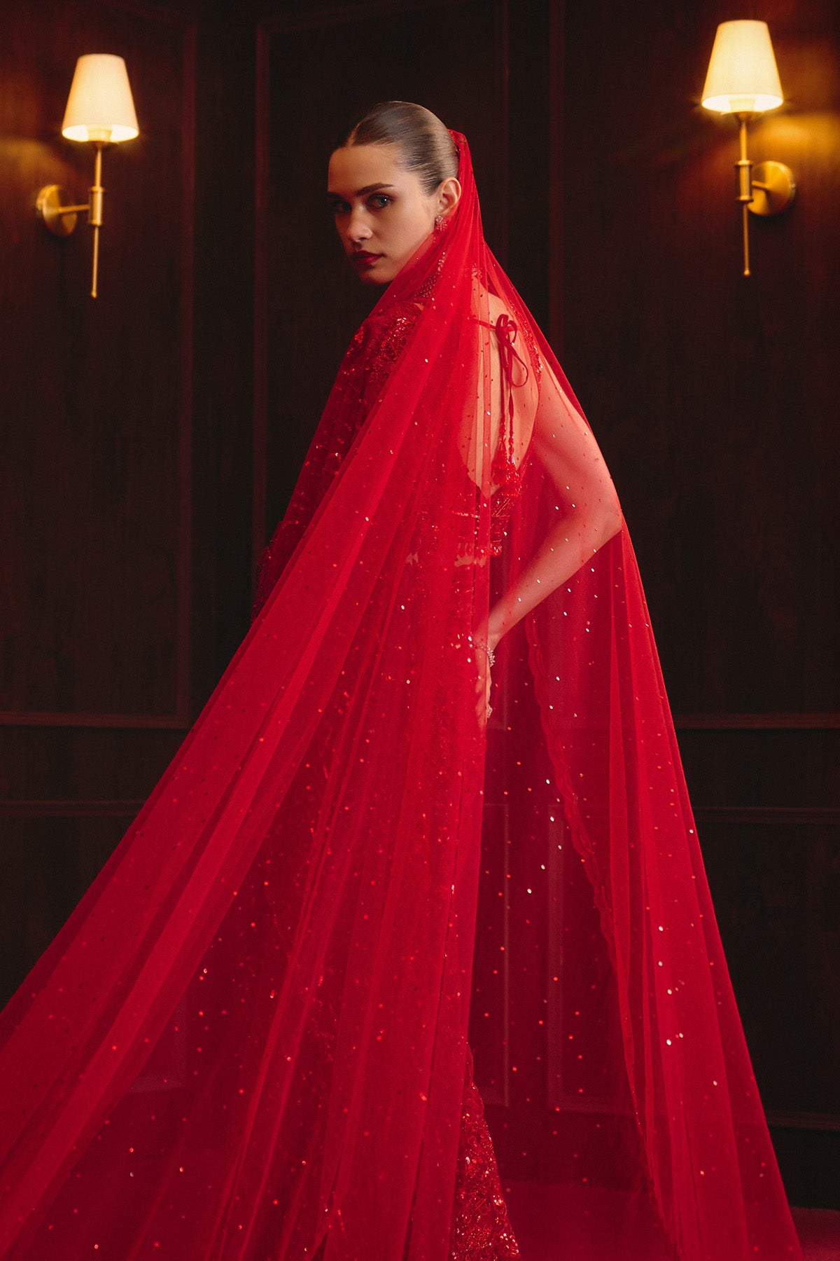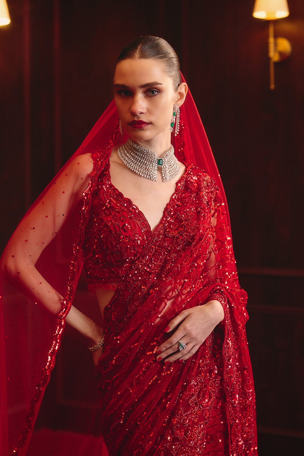 This Saree Set Features Intricate Embroidery In Red Tones On A Soft Net Base. It Is Paired With A Coordinated Blouse And An Additional Embroidered Veil Dupatta.