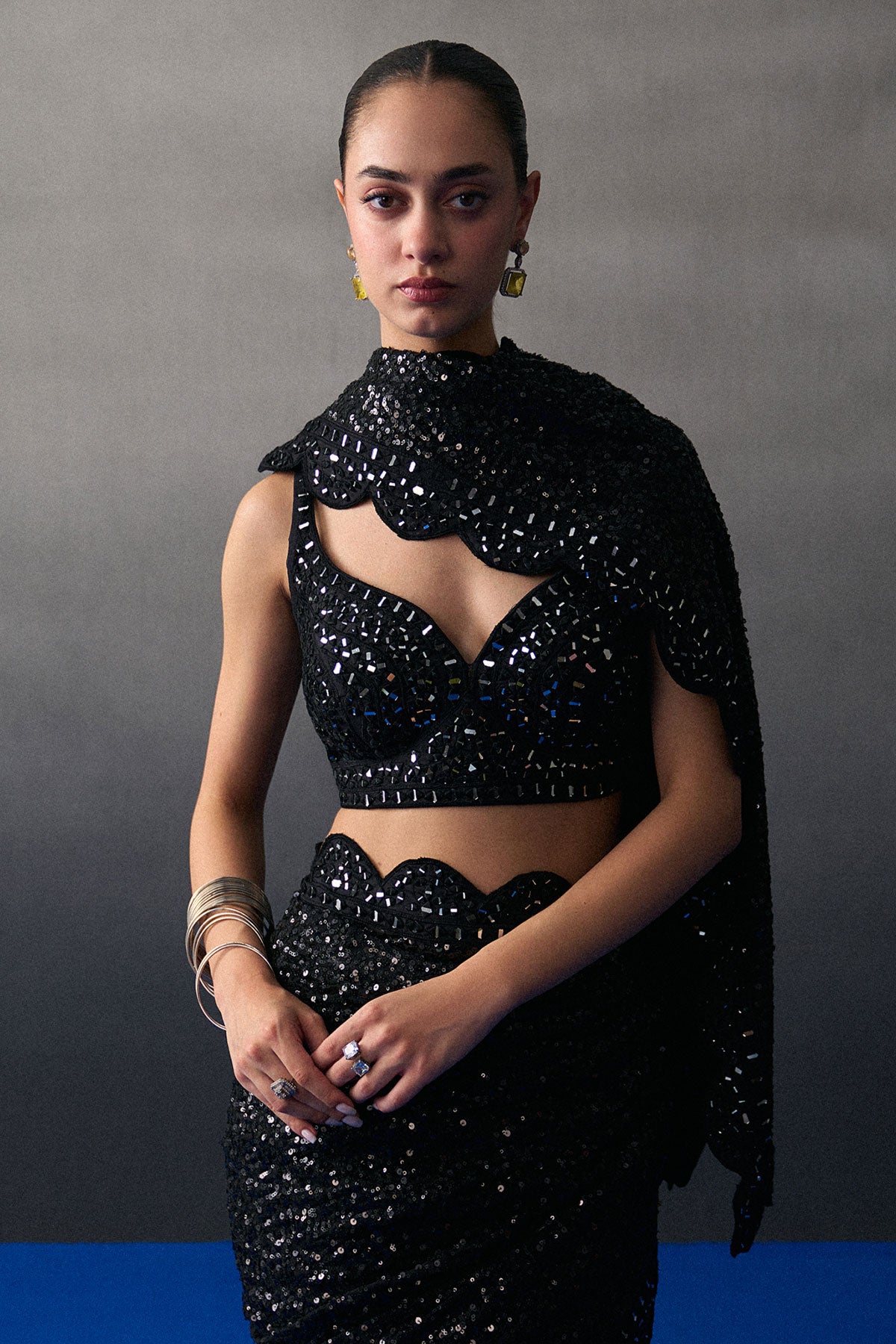 A Black Saree Set Crafted In Sequins Embroidered With Tonal Mirror Work Embroidery.