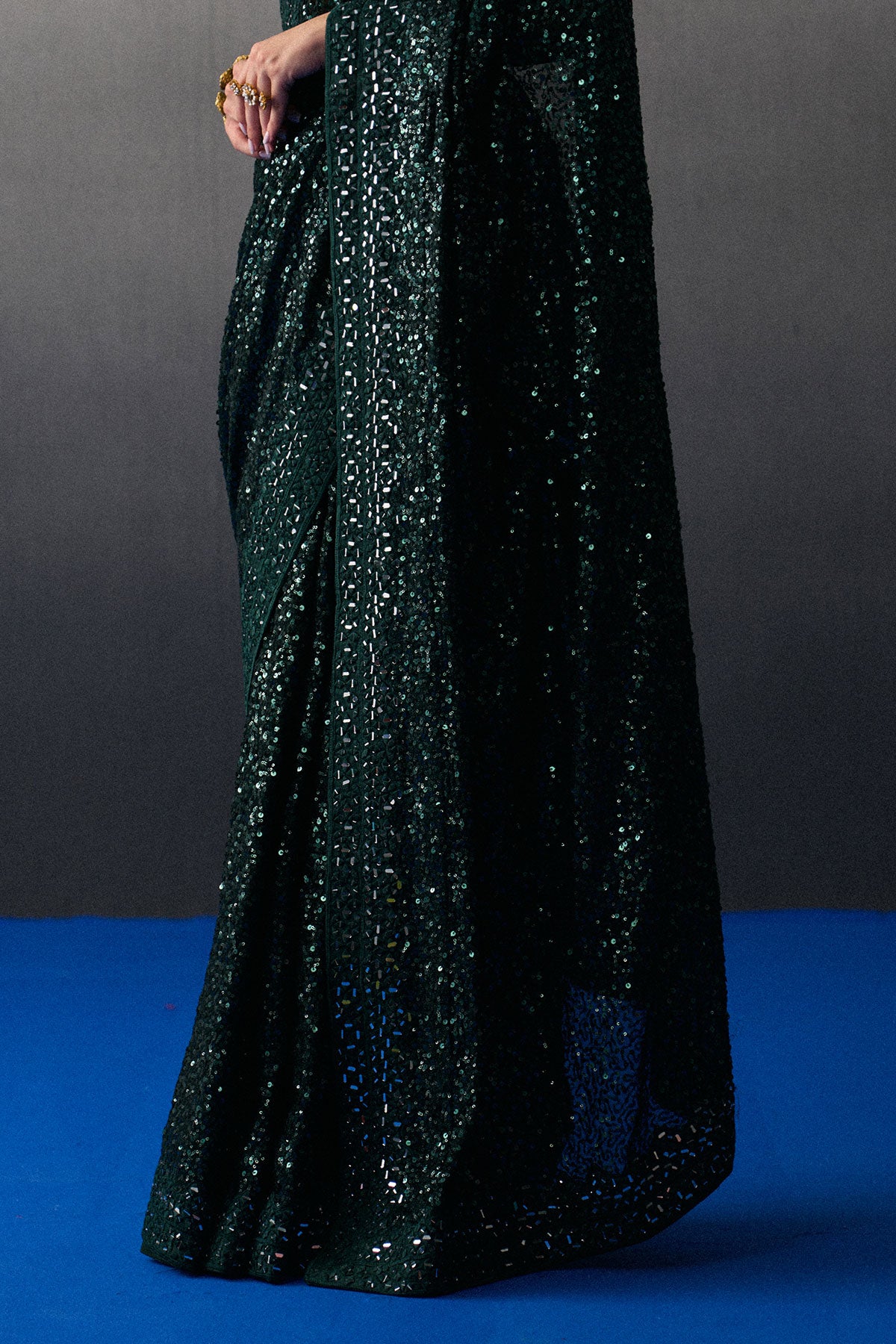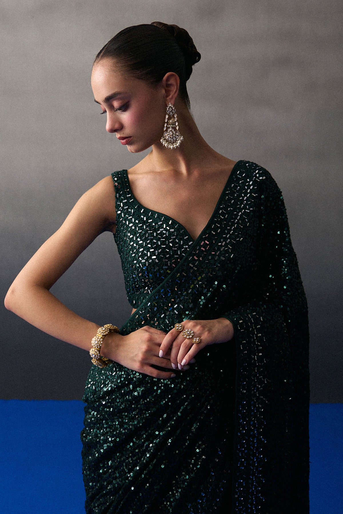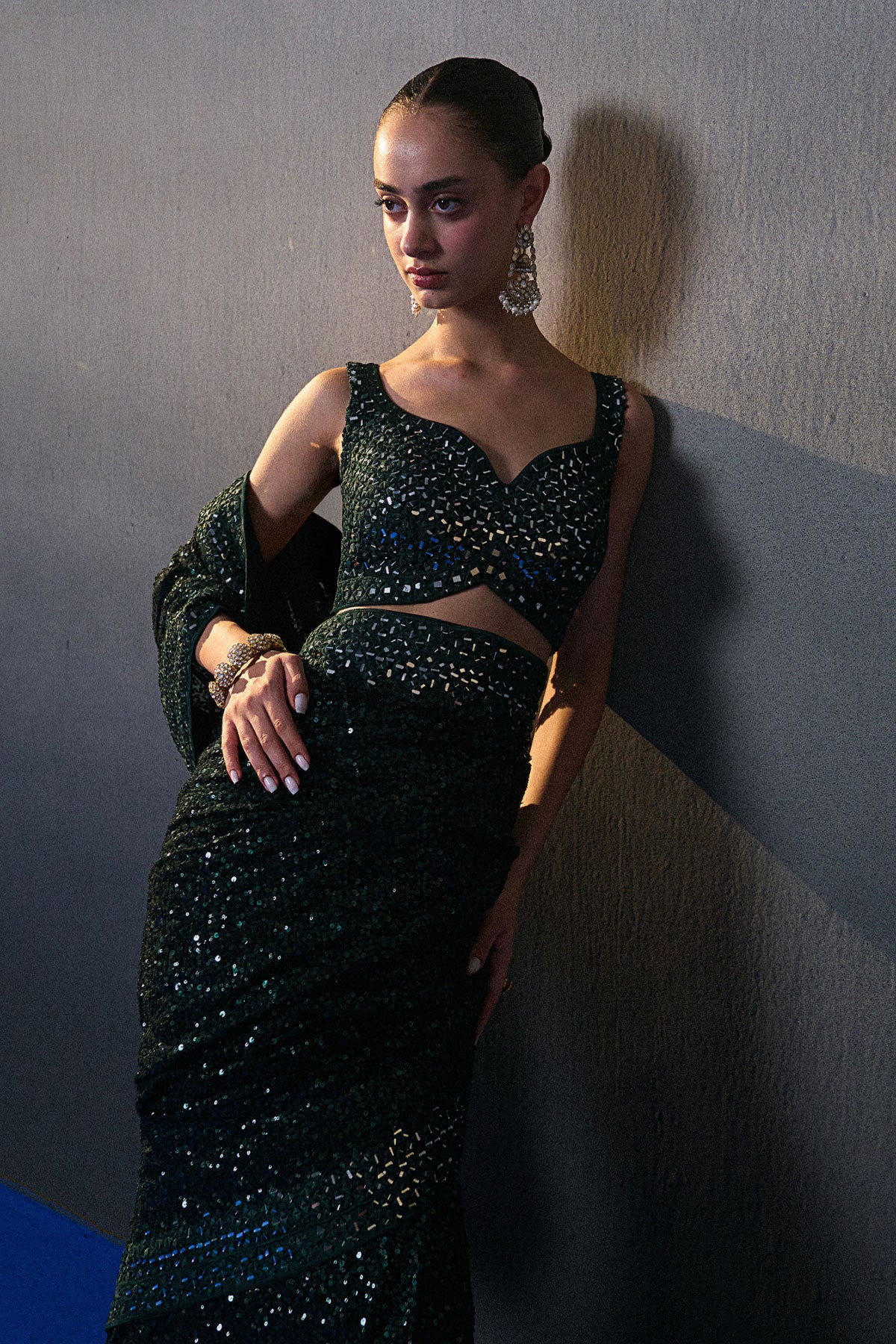 A Green Saree Set Crafted In Sequins Embroidered With Tonal Mirror Work Embroidery.
