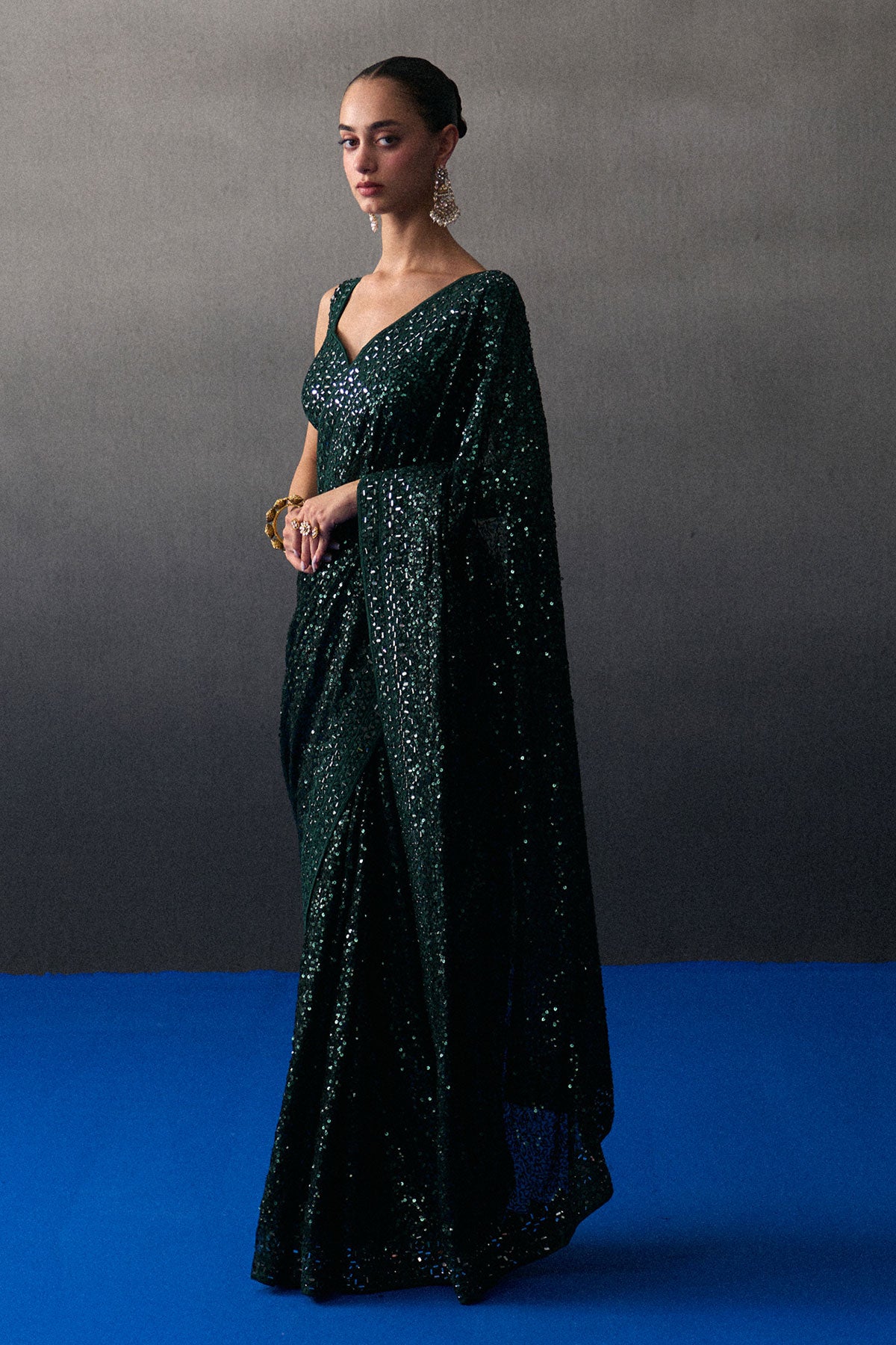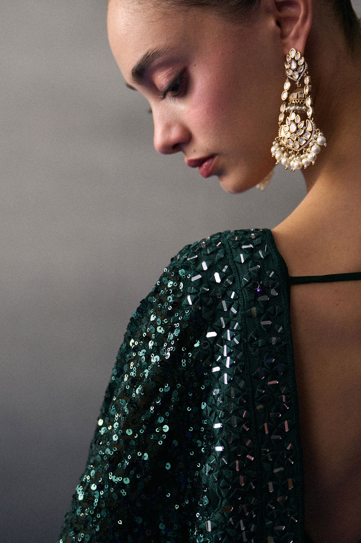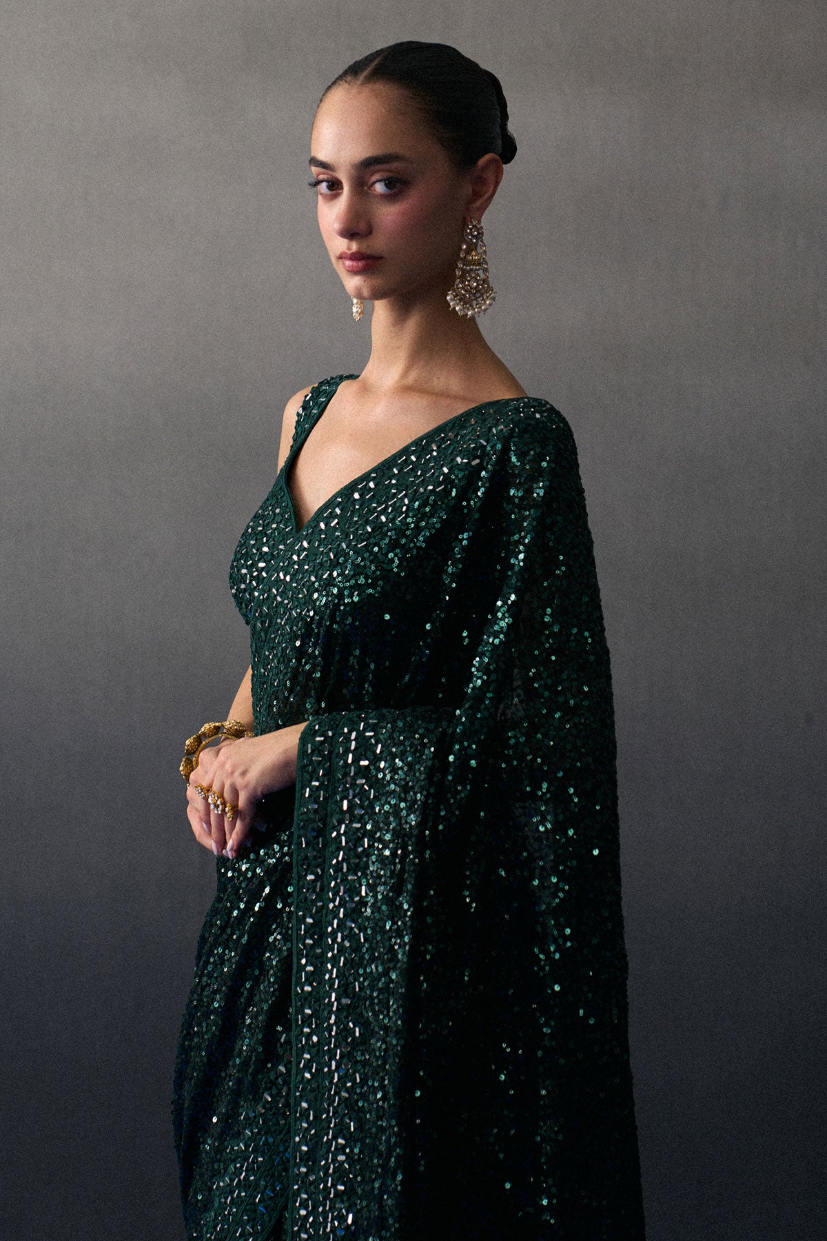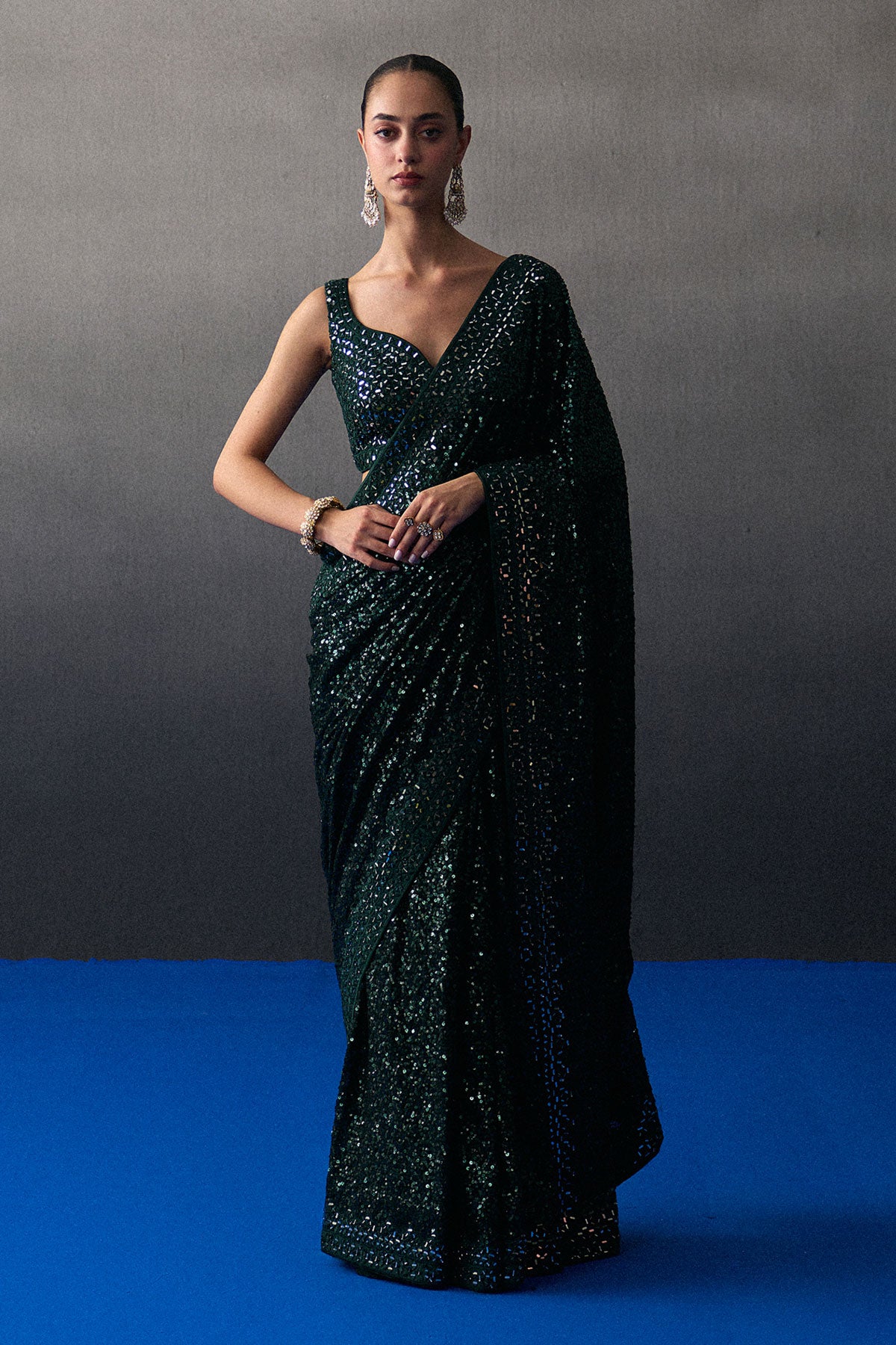 A Green Saree Set Crafted In Sequins Embroidered With Tonal Mirror Work Embroidery.