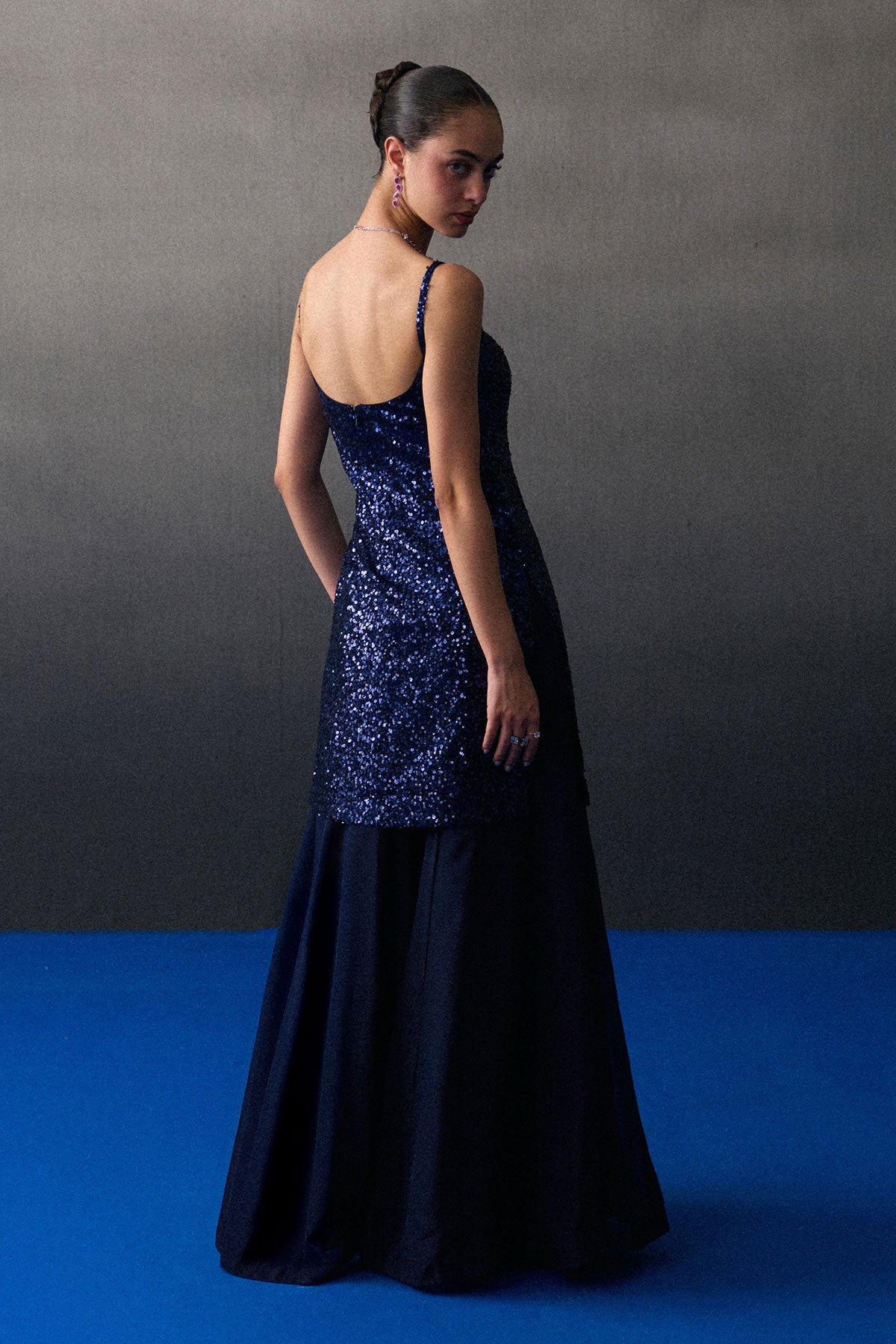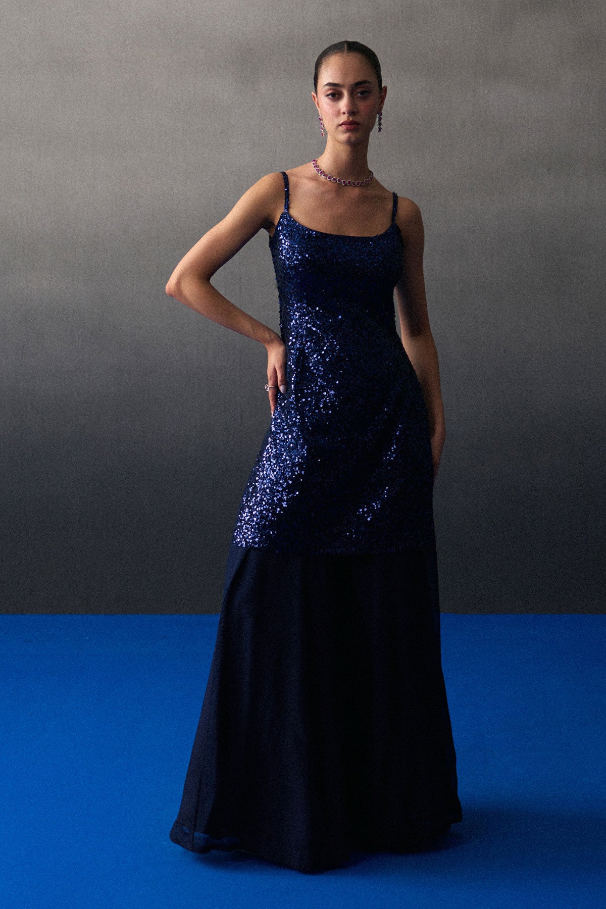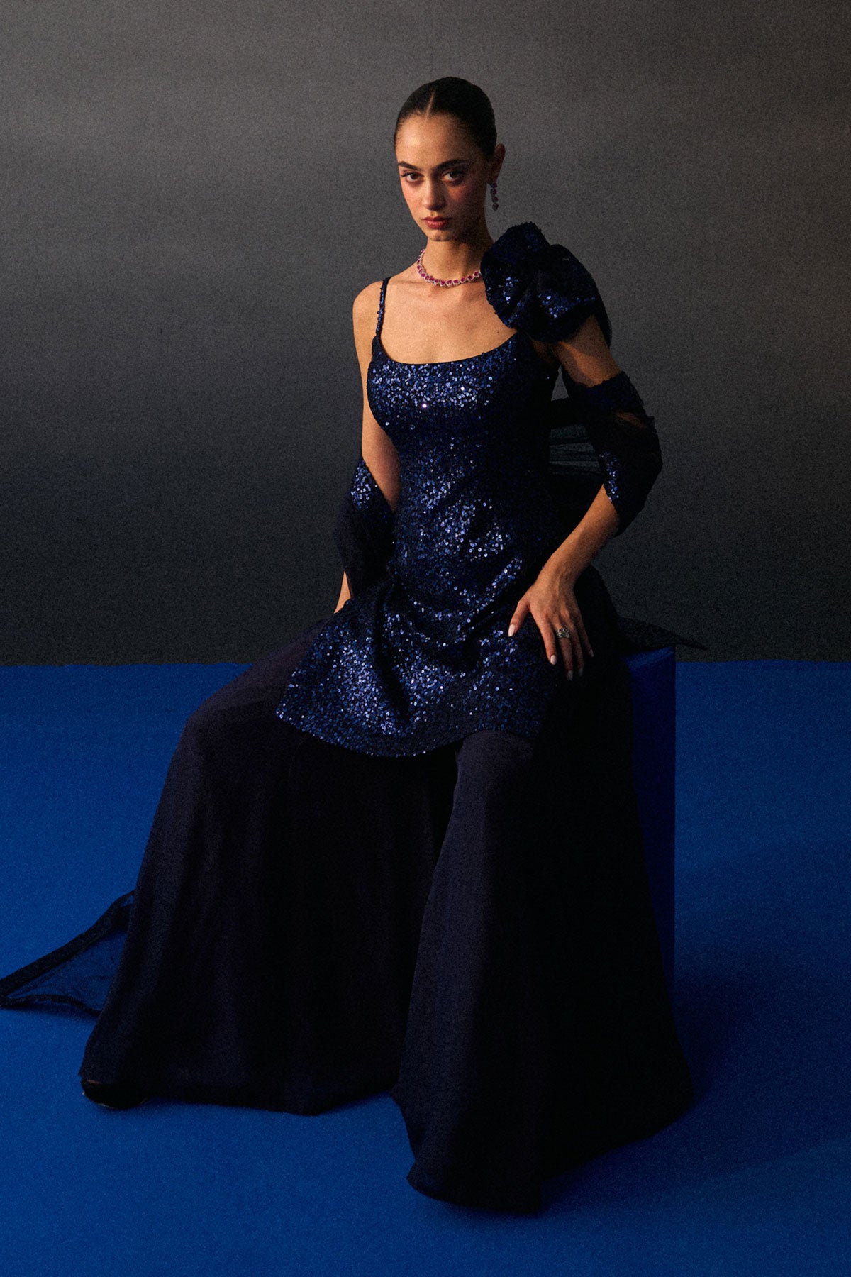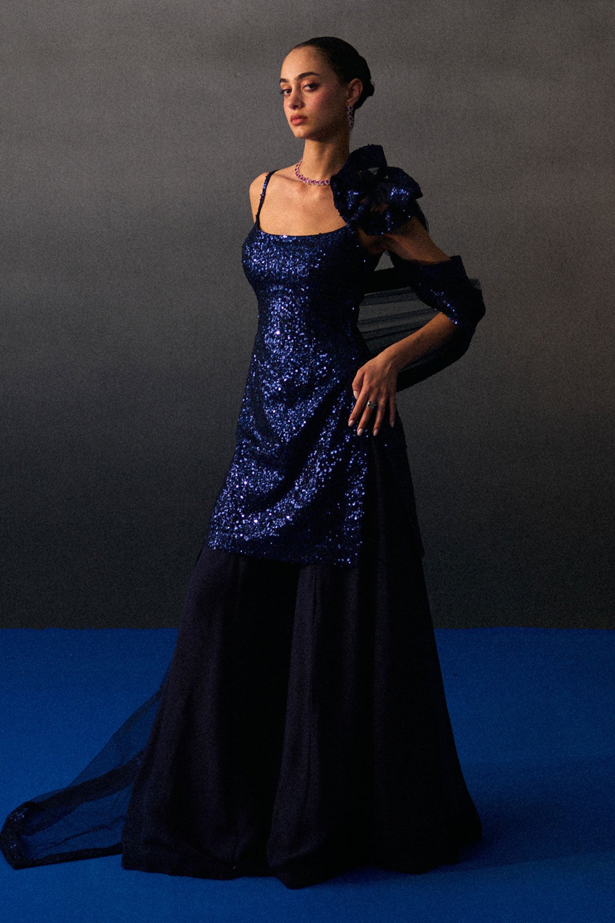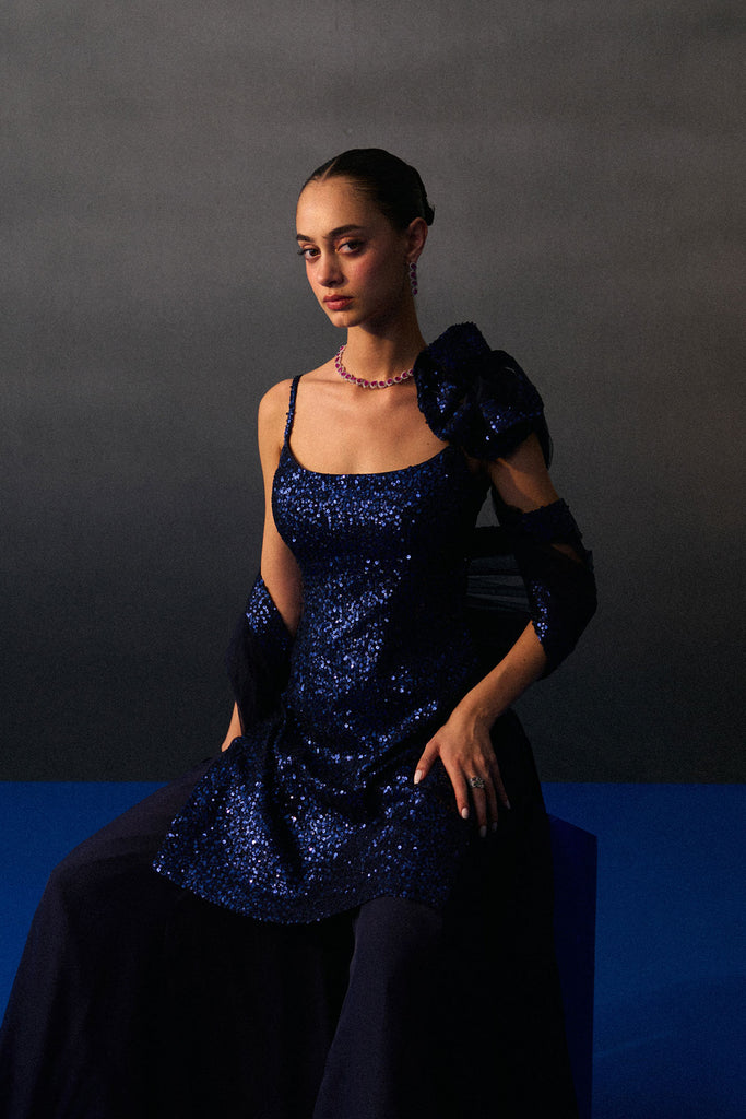 A Midnight Blue Sharara Set Crafted In Sequins And Flowy Organza.
