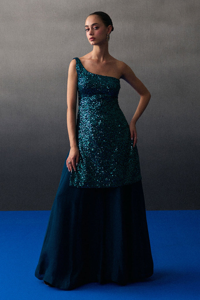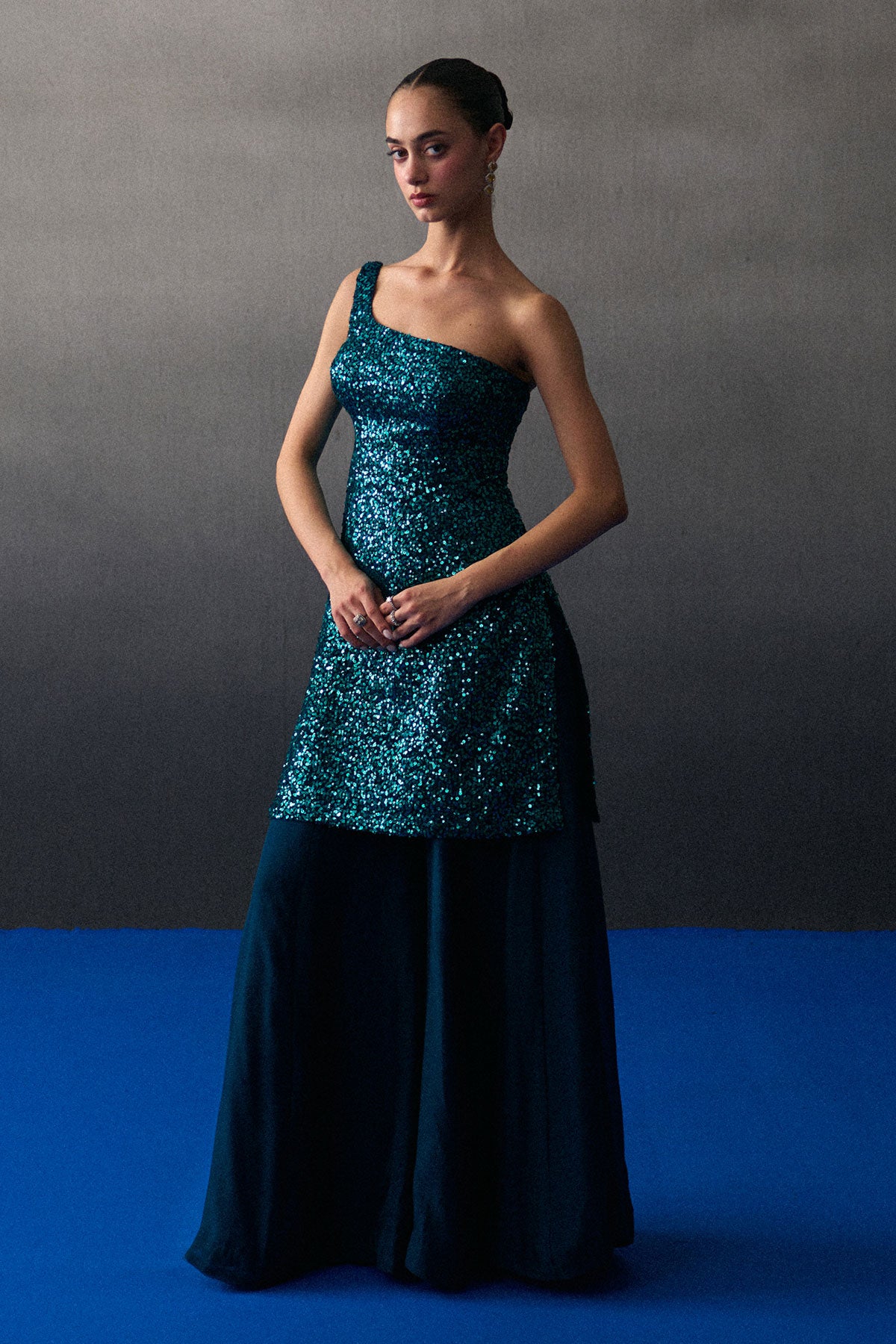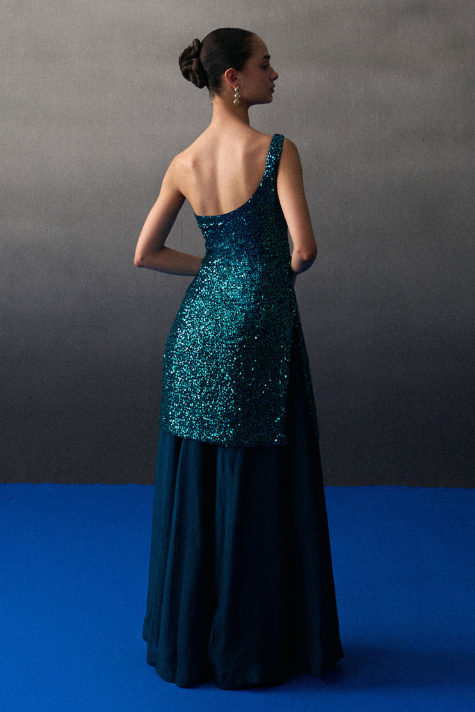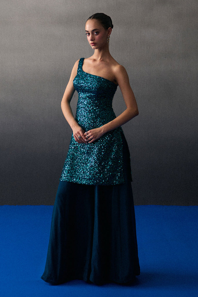 A Peacock Blue Sharara Set Crafted In Sequins And Flowy Organza.