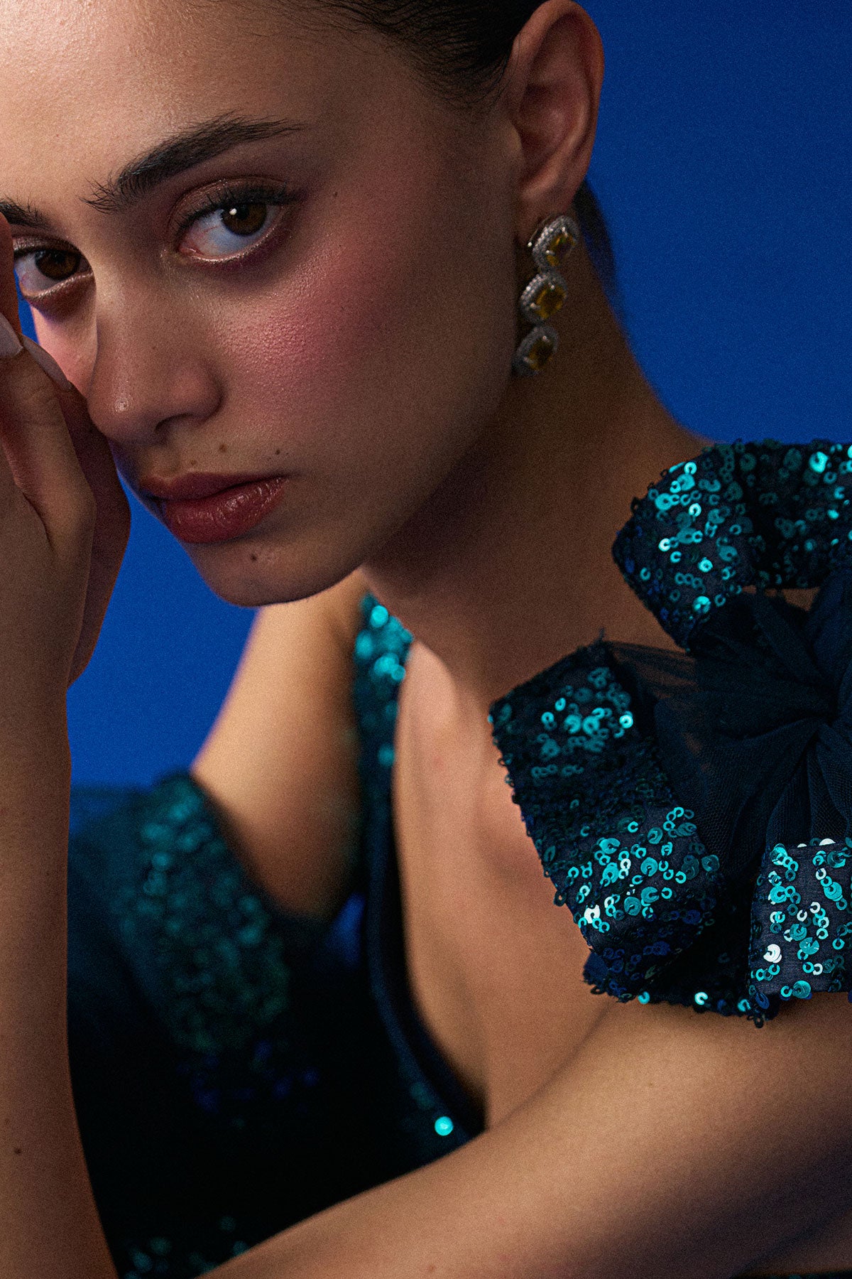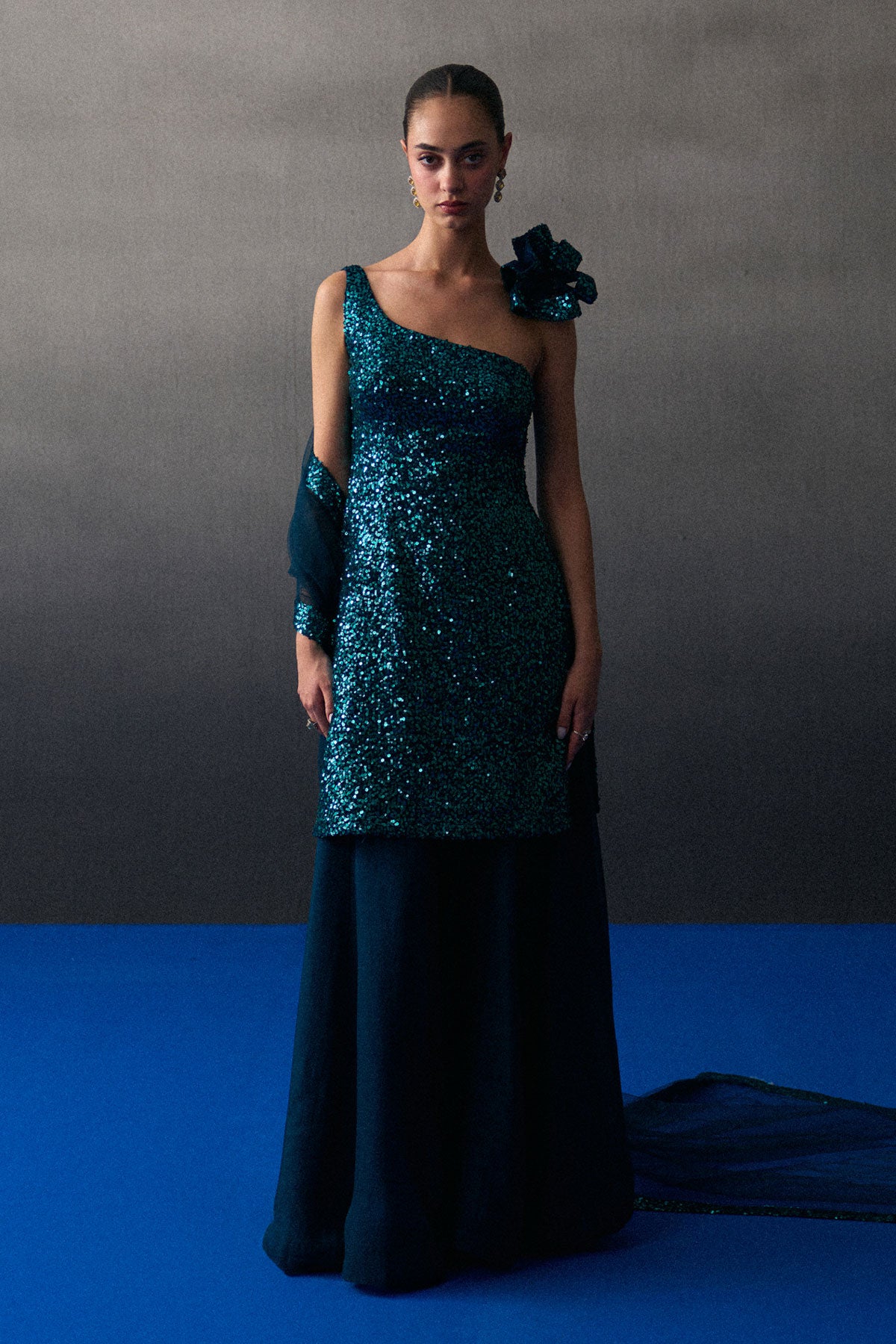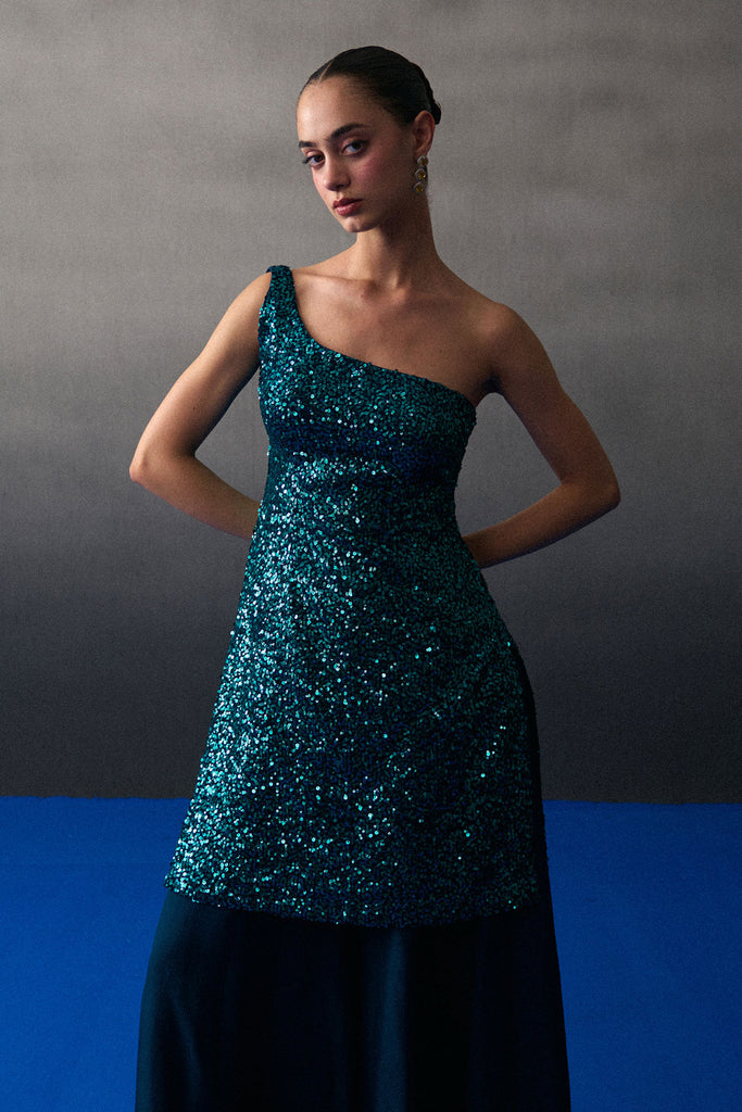 A Peacock Blue Sharara Set Crafted In Sequins And Flowy Organza.
