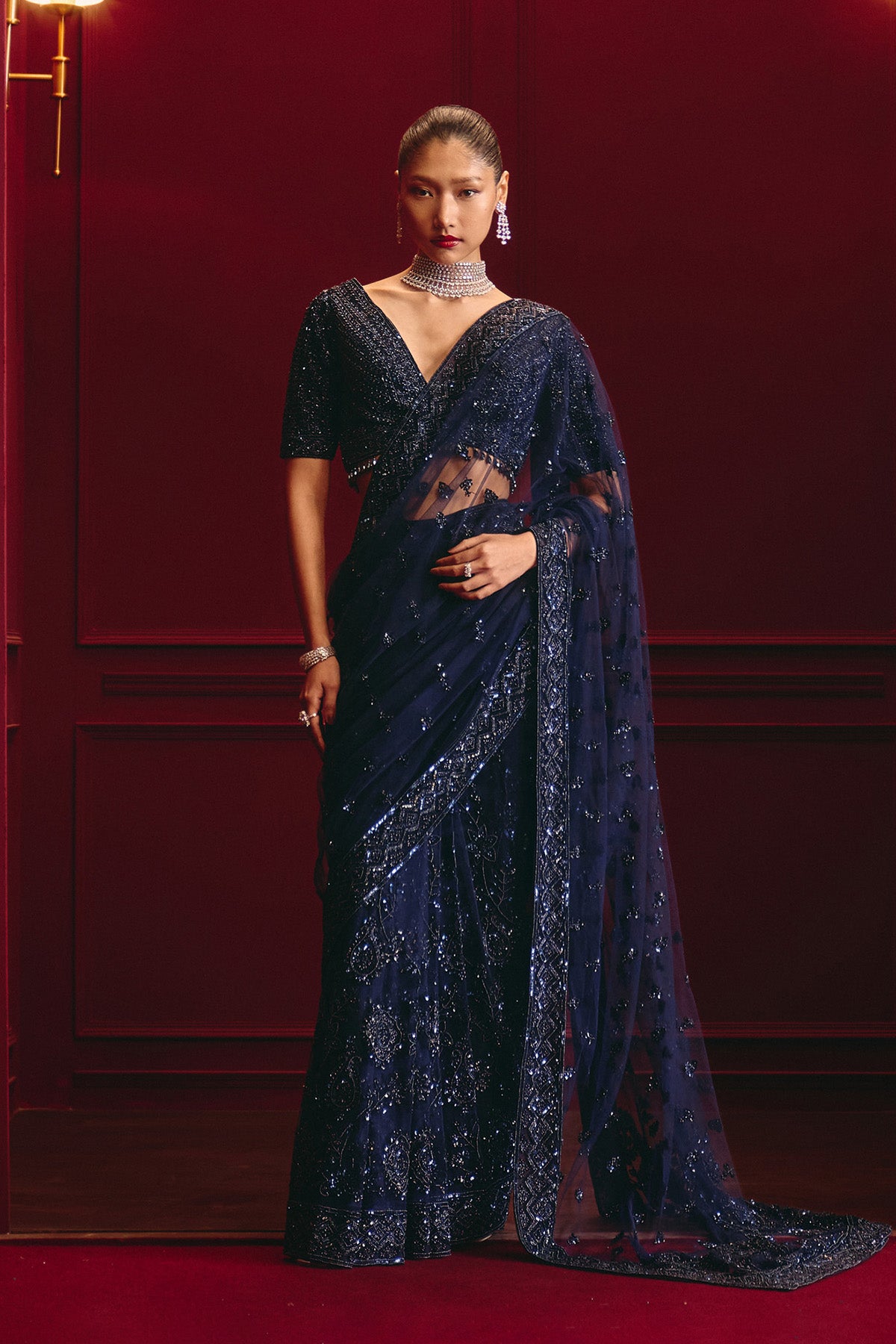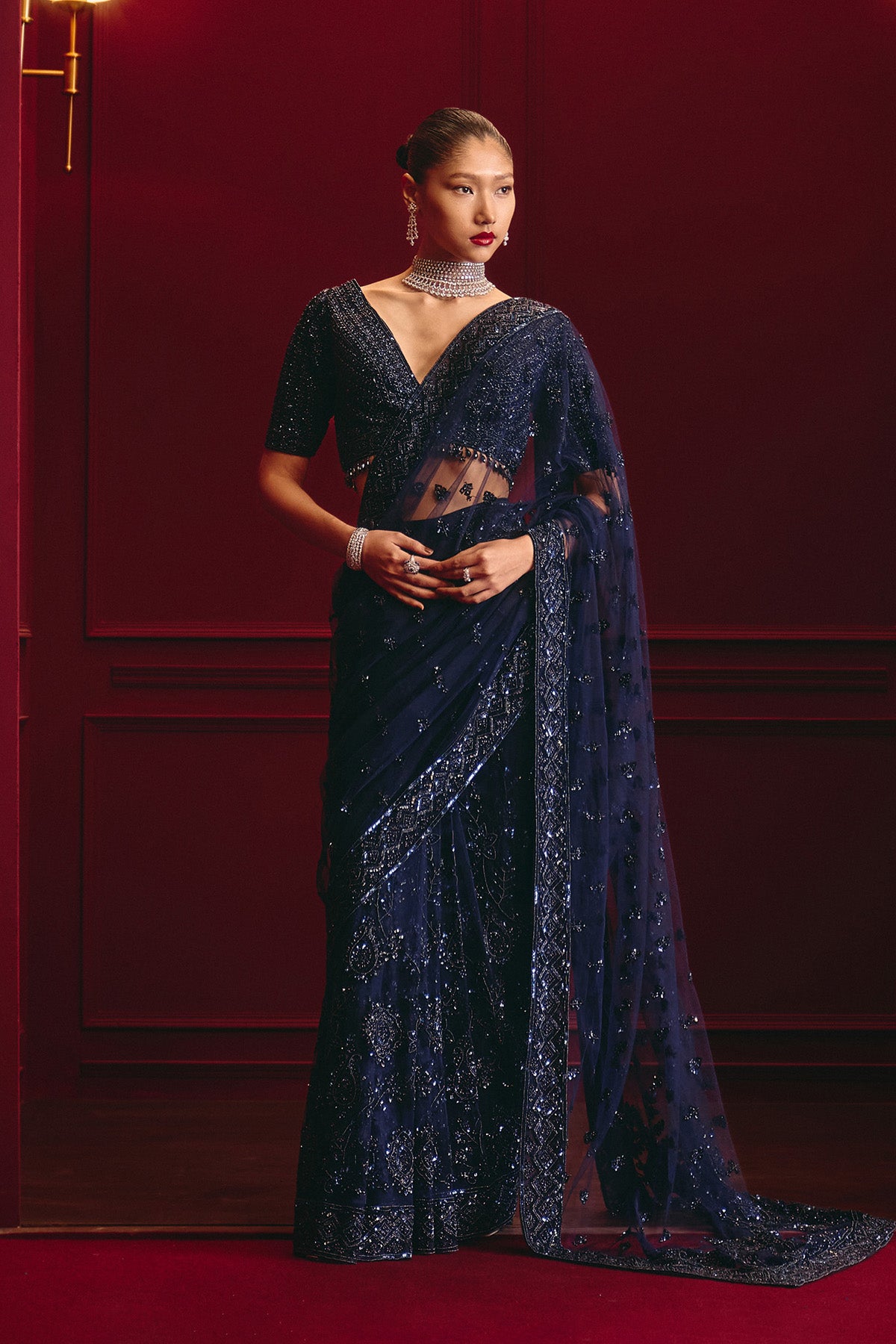 This Saree Set Features Tonal Embroidery In Midnight Blue On A Net Base. Styled With A Coordinated Blouse For A Modern Look.
