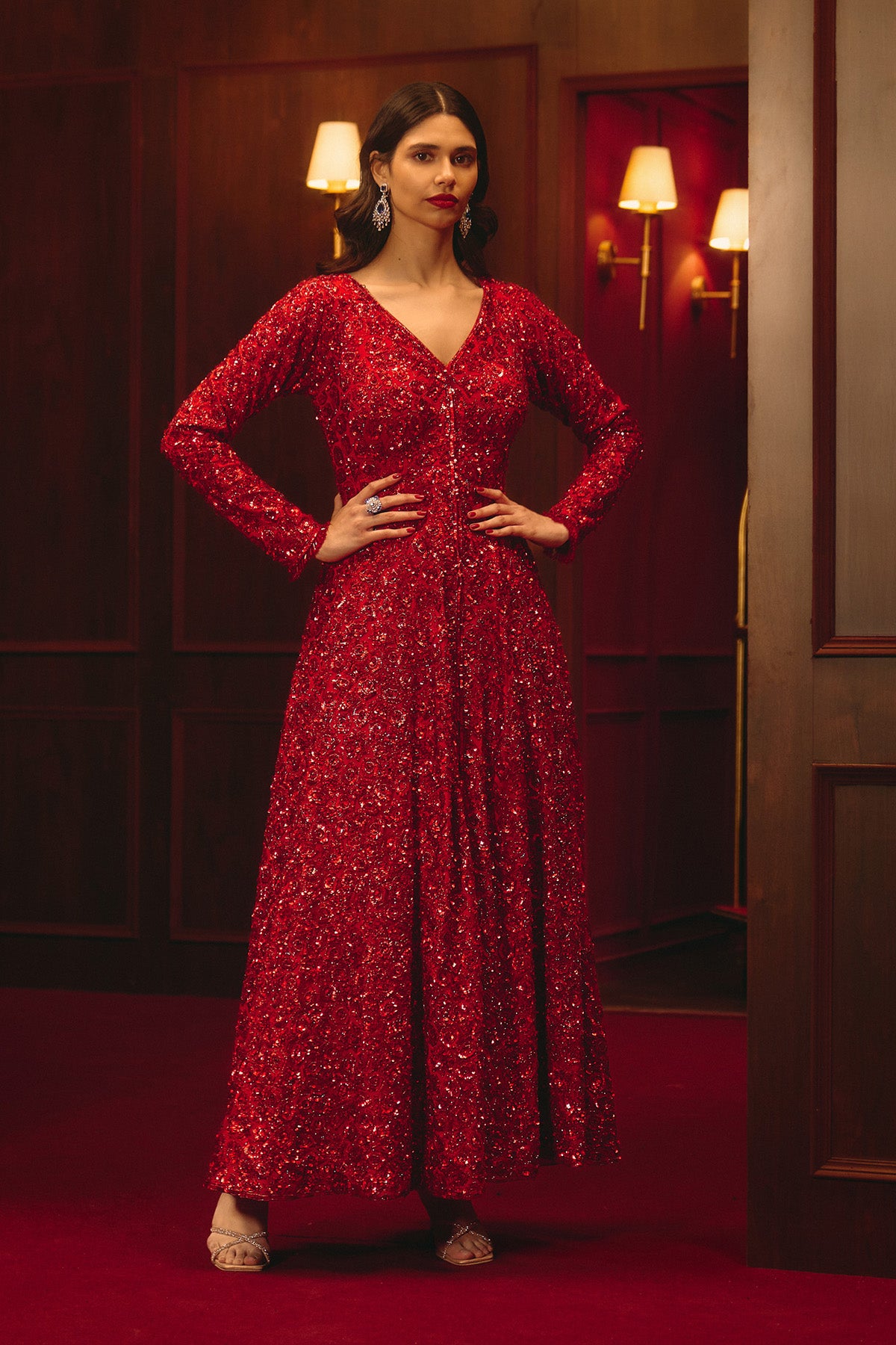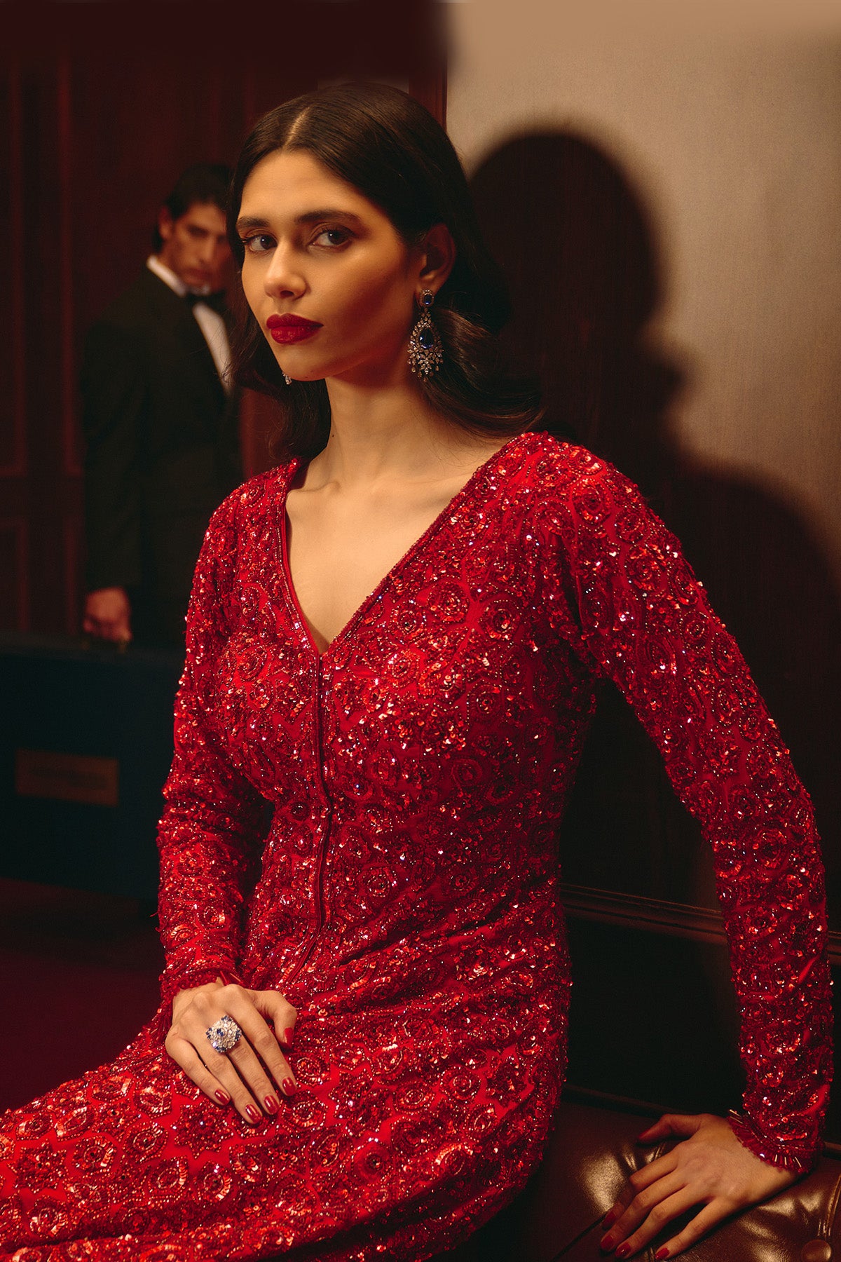 This Jacket Set Features Detailed Embroidery In Red Tones On A Net Base. Paired With Matching Pants For A Structured, Modern Look.
